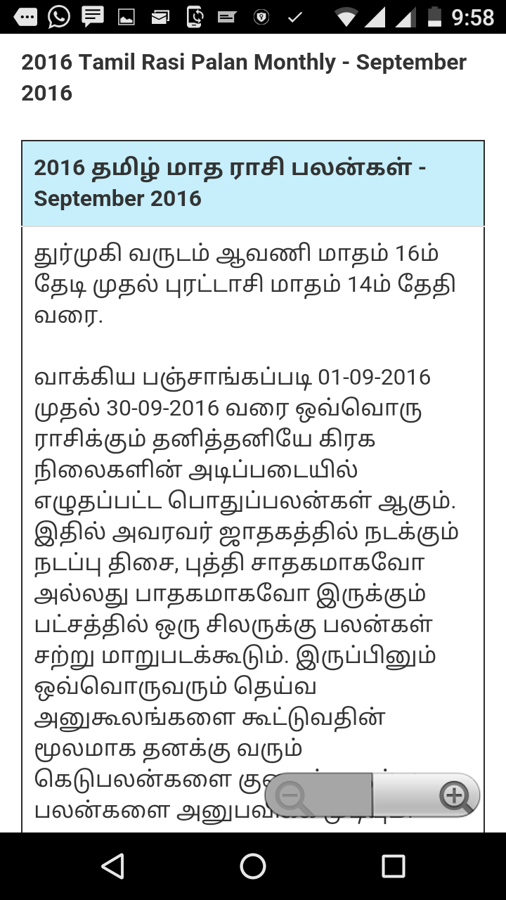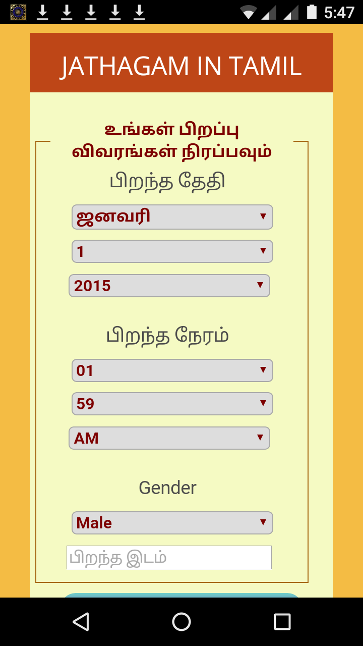 Tamil Jathagam & Calendar App for Jathagam,Calendar,Astrology,Rasi Palangal Tamil Jathagam & CalendarApp is for complete Jathagam analisis in Tamil List of Features in 2018 ஜாதகம் * Tamil Jathagam -By filling the date,time,gender,place of birth with country. We can get our birth chart & details of our Jathagam in Tamil * Rasi Palan -Read daily rasi palan details for 12 rasi's in Tamil * Weekly Rasi Palan -Details for 12 rasi's for every week can be viewed in Tamil * Monthly Rasi Palan -All 12 Rasi details for each month * Yearly Rasi Palan -12 rasi palan details for the new year * Tamil New Year Palan -12 rasi palan details for the tamil new year * Natchathira Palangal -All 27 natchathira palan for each day is shown * Weekly Natchathira Palangal -27 natchathira palan for every week is given * Nakshatra Devata -27 Nakshatras has its own power one should worship the specify God * Numerology -We can calculate our numerology jathagam in Tamil * Birthday Palan -According to our birth date & star,details of a person for a year * Parrot Astrology -Get today's parrot astrology predictions * Weekly Birthdate Palan -Look our birth date,to know the number says * Monthly Birthdate Palan - Our birth date,to know the number says about us for the month * Yearly Birthdate Palan -Look our birth date,to know the number says for the year * Sani Peyarchi -Palangal & parikaram for sani peyarchi for 12 rasi's * Guru Peyarchi -Palangal & parikaram for guru peyarchi for 12 rasi's * Ragu Kethu Peyarchi -Palangal & parikaram for ragu kethu peyarchi for 12 rasi's * Marriage Match -Marriage jathakam matching for male & female by date of birth,time,place etc * Natchathira Porutham -Horoscope matching for boy & girl by natchathiram * Rasi Match -Calculate Horoscope matching for marriage by rasi * Name Compatibility -We can find out the relationship with each person * Thirumana Porutham -Horoscope Matching for Groom and Bride by Star * Palm Reading -Know the palm lines in our hands * Vasthu -Details of vasthu to construct a new house with suitable place for pooja room,bed room ,kitchen,etc * Manaiyadi Sasthiram -Details of measurement to construct our new house * Rasi Stone -Information of rasi kal details for 12 rasi's * Bakthi Paadal -Hear the devotional songs of God & Goddess * Temples -Famous Temples in Tamilnadu in detail * Navagraha -Details of சூரியன்,சந்திரன்,செவ்வாய்,புதன்,குரு ,சுக்ரன்,சனி,ராகு,கேது * Baby Names -According to natchatiram the starting letter of the name is given * Jothidam Parikaram -Remedies for problems in jathagam,family,business etc.are given * Kan Dirusti -Remedies from evil eyes according to their age are given * Kanavu Palangal -You can watch and hear the dream meaning * Palli Villum Palangal -Effects of wall lizard falling on human being (body parts) * Mole Meaning -Details of macha for male & female நாள்காட்டி * Daily Calendar -Daily date/day sheet information are given * Monthly Calendar -Important date for the month,ashtami,navami,etc.can be seen * Daily Panchangam -Detailed Panchangam for every day is given * Nalla Neram -Good time for each day is given * Ragu,Kuligai -Timings of ragu,yemagandam of all seven days in a week is tabulated here * Kari Natkal -List of bad days in every month for not doing any functions on those days * Gowri Panchangam -Every day pagal/iravu panchangam is given * Muhurtha Natkal -Best muhurtham day's & time is given for auspicious functions like marriage,gruhapravesam,etc * Festival Days -List of tamil festivals with month,date,name of the festivals * Vastu Days -We can start a new house construction,for purchasing property in this days * Vrat Days -Amavasai,pournami,pradosham,karthigai,saturthi etc. in detail * Horai -Daily Horai is given * Fasting Days -Most of the tamil people's follow fasting on pradosham,saturthi,sasti all dates given * Govt. Holidays -List of Public Holidays in Tamilnadu is charted here * Bank Holidays -Information of the bank holidays for Tamilnadu
