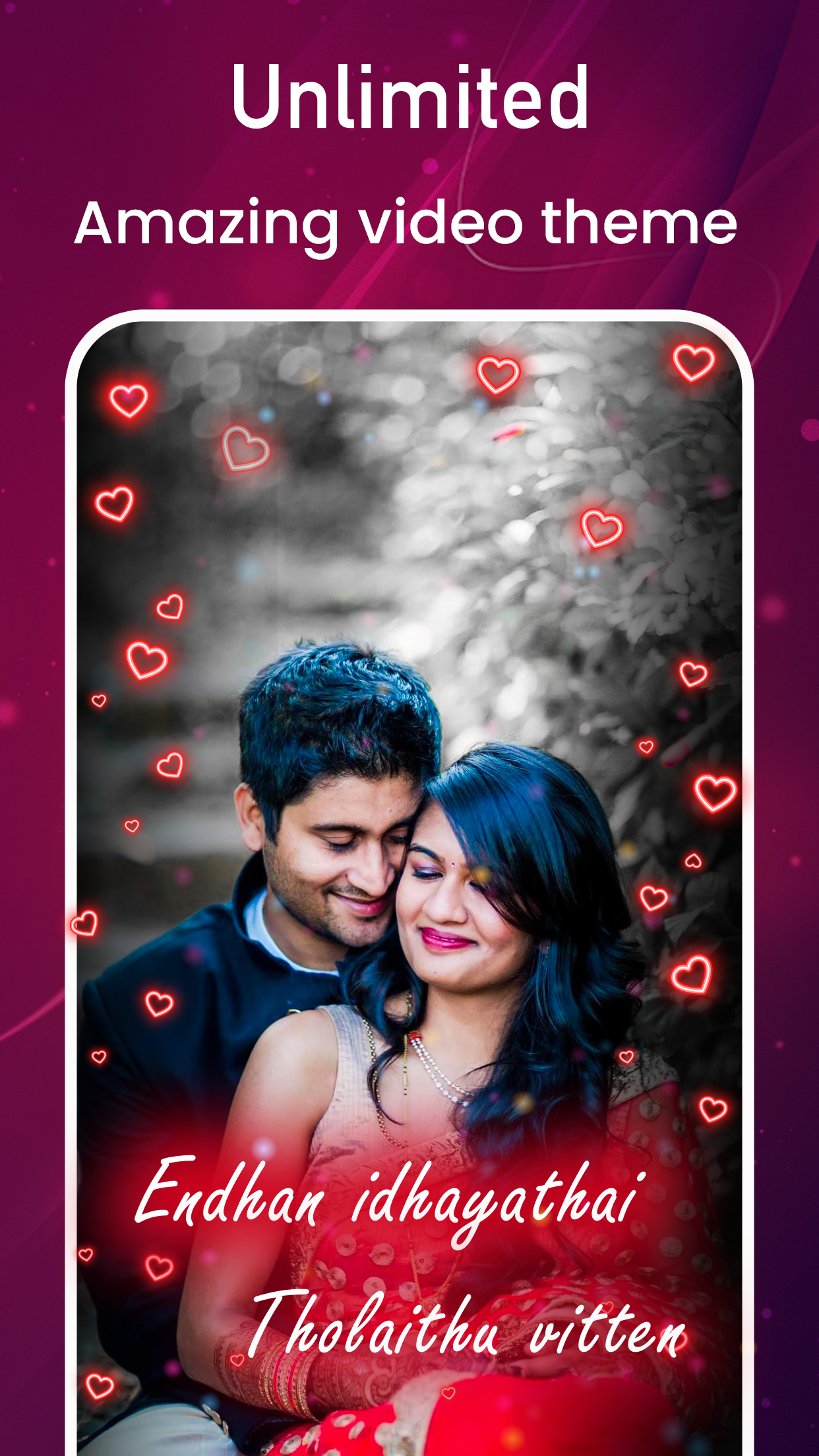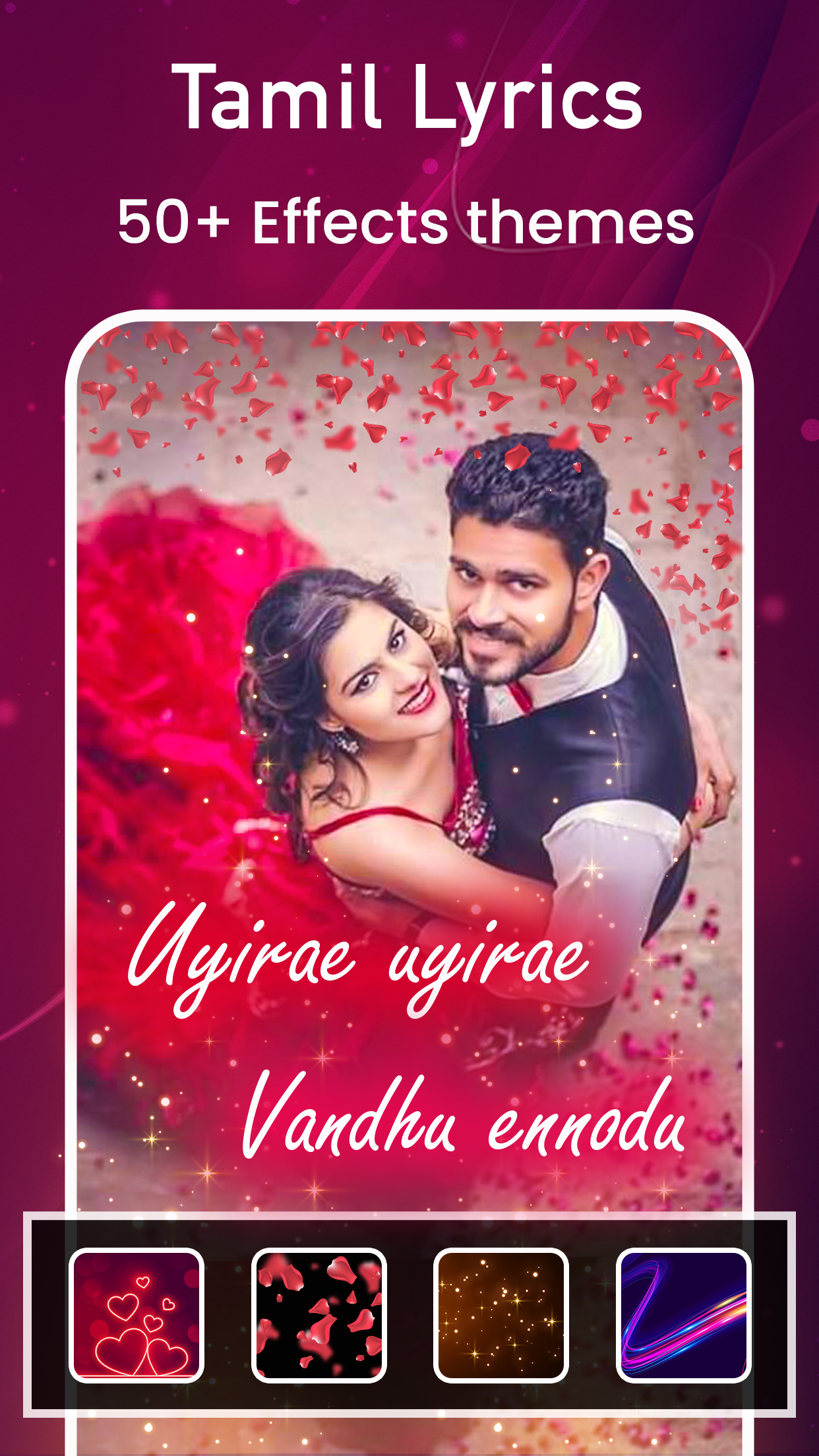 Tamil Photo Lyrical Video Status Maker With Song Tamil Lyrical Status Music Video Maker has something new concept you can make lyrical video of your own beautiful photos. A picture says a lot and adding song lyrics on that picture make it more unique. Create awesome animated tamil song videos status with this our MyPhoto Tamil Lyrical Video Status Maker with Song application. it has the best collection of animation effect songs just download it and set your image and at last convert it into one animated lyrical tamil song video with help of this application. Video Maker Photos With Song is one of the best video editor, photo slideshow maker and movie editing apps in Android Store. Create profile video and share video photo story to your friends. With this app, Very easy to create, edit your video, movie from gallery photos or gallery of application. In Video Maker Photos With Song application your video editor with best tools: Music, Frames, Effects, ... Music Beats Particle.ly - Video Status Maker is best video maker with you can also combine a slide show with best animation theme. App allows users to create a video clip from images with there selected animation particle themes. MBeats Particle.ly Video Status Maker with you can share a trending status video on your social profile. Create your video status in more unique way by using your photos in video with Music. Exceptional music along with highly creative lyrics add to mesmerizing voices of youngesters singers.I hope you will have fun using this app by Share Tamil Lovely Video Songs and Status. Create and share lovely Lyrical Music video within a minute with your personalized. create your own music video with your personalized photos and texts. Feature of Tamil Video Maker With Song - Tamil Video Status: --> Add your favourite partical system, rain, heart, rose leaf falling, flying bubble, --> Easy to use and user friendly UI. --> Many beautiful and attractive effects for video. --> Very easy to use: download video song, add your photo, adjust photo using fingure, render it. --> Select a song of your choice from collection of songs. --> App has larger library of video song --> You can apply text, text color, text size and different type of text style. --> Add sticker to video with : love sticker, couple sticker, heart sticker, and many more. --> Create your video status in more unique way by using your photos in video with Music. --> Powerful status Video Maker. --> Video editor app, Easy to edit your video --> Support all android device. --> This app allows you to pick your favorite pictures and add your favorite song lyrics from collection of songs. --> Share your video status on social media. --> Video Songs Status are available in short size with the best quality. Be the Lyrical With the Most amazing My Photo Tamil Lyrical Video Status Maker and if you like the Application then Don't Forget to share with your friends and Relative.