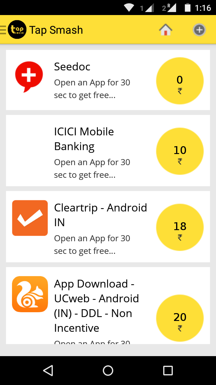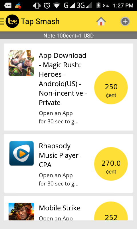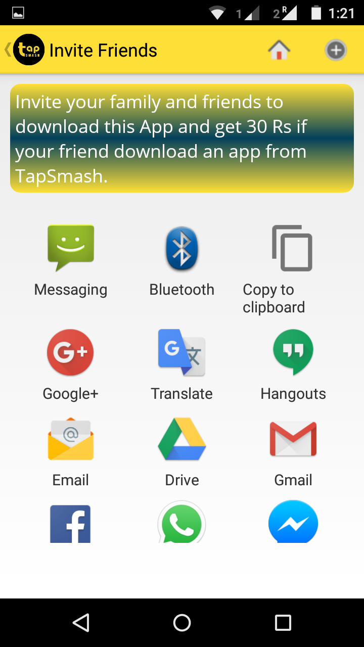 TapSmash is a user friendly app by which you can earn FREE REWARDS!! To earn free rewards u just have to open the app where you will see the offer wall containing lots of offers which can give you a huge amount of recharge money all you have to do is just download these apps as per given conditions after which your paypal account will be automatically recharged. You can not only earn rewards just by downloading apps you can also get that by playing games watching videos isn’t it cool just by playing games watching videos you can earn money. For this just follow these steps:- 1.Download the TapSmash from Google play store. 2.Download apps shown on the offer wall as per given information. 3.Run the apps and your PayPal account will be automatically recharged. 4.Your earning can be more interesting , like by playing games , watching videos. 5.You can also earn free Rewards just by inviting your friends. 6.You can also get lots of offers by which you can not only earn Rewards but also you can get great discount on so many products. 7.You will get new offers daily so you can never get bored. Download the app & ENJOY your free REWARDS