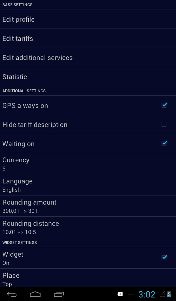 TAXIMETER. The program for taxi drivers, both owner-driver and taxi station drivers, wishing to carry people catching the car (work by yourself). It will suit for passengers to control their trip and even for auto-travelers who want to consider time and length of their routes. We try to make the most convenient and understandable taximeter for android for drivers. We created taximeter by taxi drivers for taxi drivers. Our users - experienced taxi drivers give their recommendations when we were creating the taximeter. You can use our taximeter free and no charge for transportation passengers and you may leave suggestions and comments. We do not ask for money or show ads. FACILITIES Flexible setting of tariffs: "minimal", the cost of mileage and time, cost of waiting, cost of movement by the camp, double tariff for those who need to arrive faster. You can add services, make a discount. We offer several tariffs. You can change them or create your own. You need not create a tariff from scratch or you can copy an existing one, and delete those that you are not needed. You can set tariffs for your taste or carry on tariffs of aggregators or dispatcher service of your region. You can configure and add additional services, such as children's chair, luggage, transportation of animals, etc. Add or remove services during the trip. On the screen of the taximeter you can display the driver profile, download photo - passengers trust such drivers more, you can show tariff, speed indicator, part of the buttons. On the screen of the taximeter you can quickly get into the settings. The color indicator displays the quality of GPS signal. The menu can be customized to your taste. Adjust accuracy and rounding. You can set up rounding counting mileage, time and sum, and you can quickly remove a penny. With rounded you can even set for an hourly and hourly accounting - every incomplete kilometer or hour will be counted as complete. If the GPS reception is not accurate, you can turn on the GPS filter. Select a currency from several preset or set your own icon. The distances are measured in kilometers and miles. There are embedded statistics. The shift automatically starts with the first trip, and ends after pressing a special button. Function ‘’WIDGET’’ allows you to see the sum on top of other applications. The widget can be set up: size, position, what else to show: speed, mileage, time. You can move the widget with your finger. It has several color night and daytime schemes. You can set a password to forbid tariff changes and access to statistics. The voice of the beginning and ending of the trip, including the voice of cost. Some sounds can be change by specifying their sound file. At the end of the trip, the taximeter will issue a detailed report on the cost of the trip and additional services (if they were). On the ‘’NAVIGATOR’’ button you can go to the navigator. Taximeter maintains such navigation programs: Navitel, Waze, Yandex maps, Yandex Navigator, CityGuide, GeoNET, 2GIS and many others. Internet connection is not necessary for work. Our taximeter works perfectly even on very ordinary or old models of smartphones and tablets. If the number of taximeter users in your city exceeds 50 men, we will give advertising and allocate users' orders. So, tell your colleagues about our taximeter. CONTACTS. Write to us if there are any difficulties with the installation or setting the taximeter. Write, if you find any errors, bugs, glitches. We are always in touch and will always help!