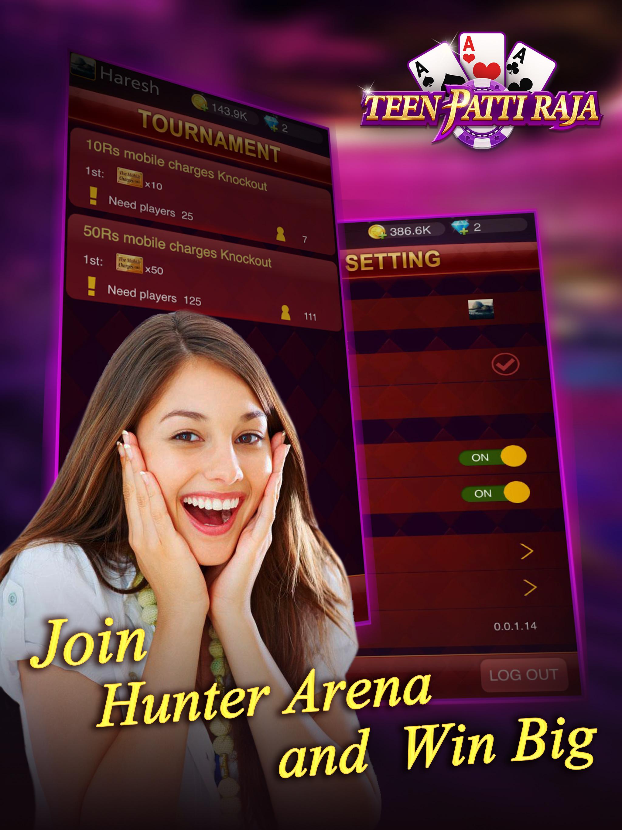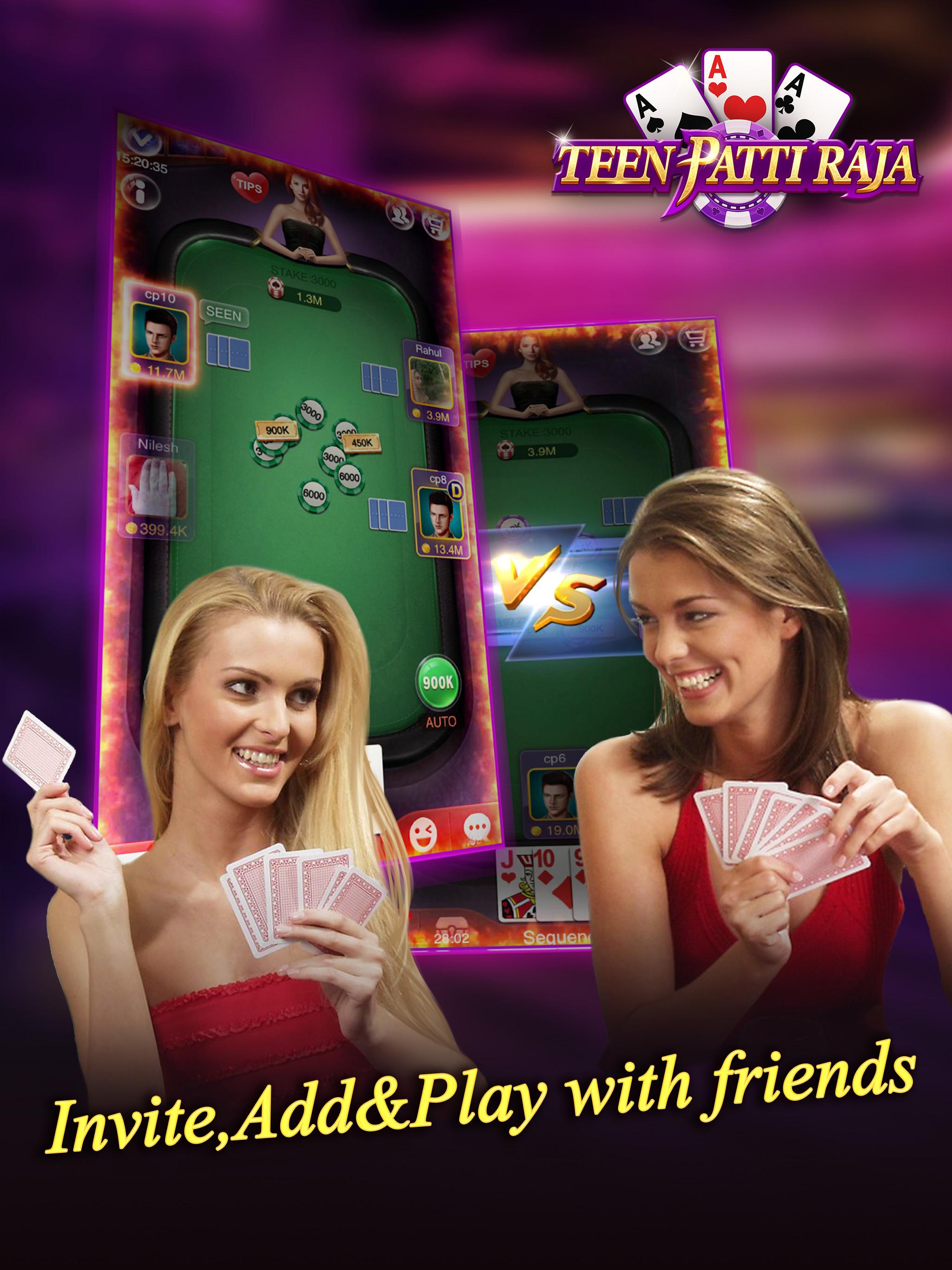 Teen Patti Raja is the most widely played and largest online multiplayer teen patti Indian poker casino game in the world. Teen patti, also known as 3 patti, 3/three card games, flush or flash, Indian poker games, is always pursued by casino games fans around the world. Teen Patti Raja can be played in English, Hindi and Urdu. Download now and play our teen patti gold game to win gold and enjoy the most ultimate teen patti way of making fortune!