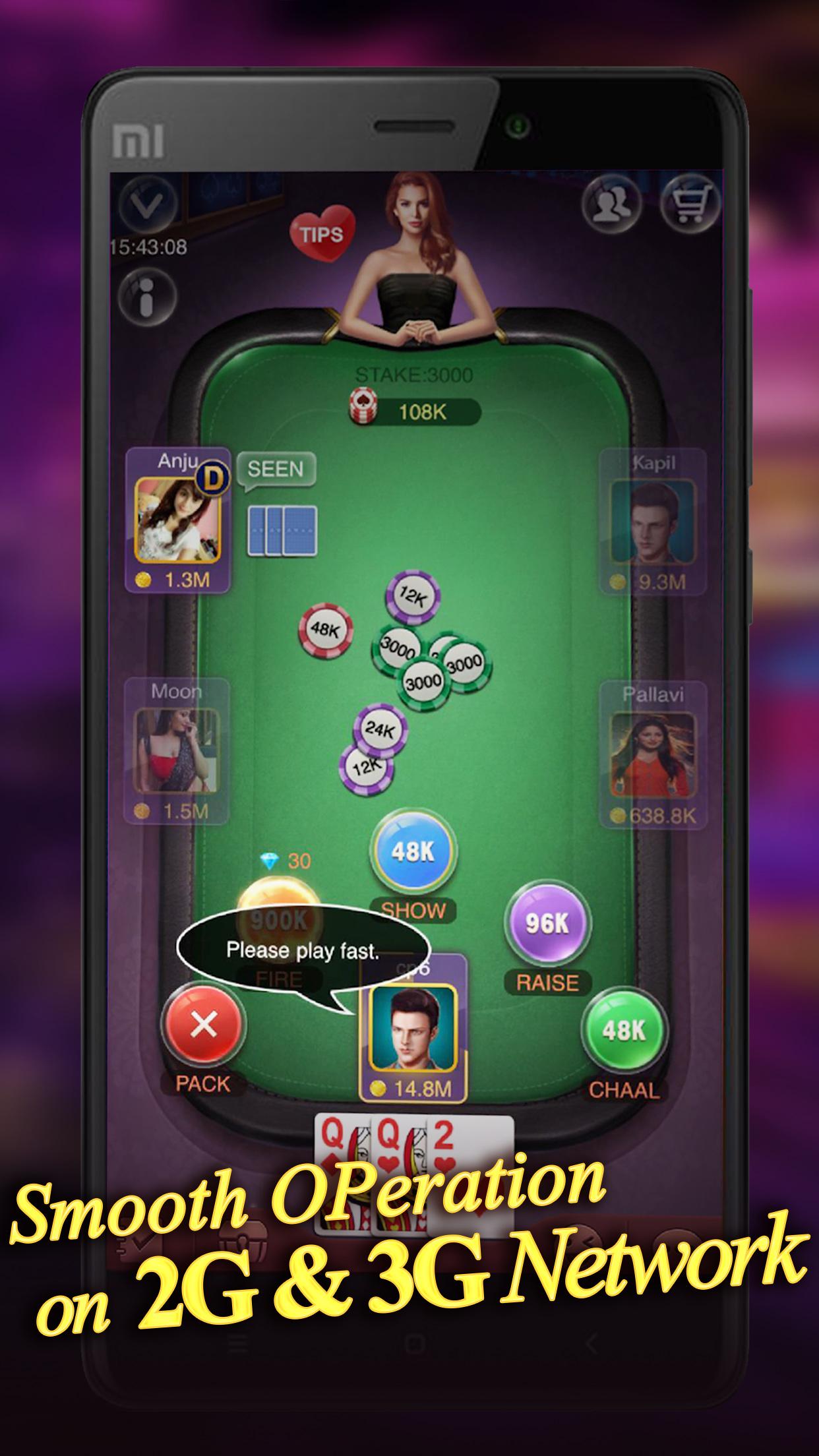 With the fun gameplay integrating Indian poker, gin rummy poker, Texas poker, British three card brag, and Indian poker gold, our Teen Patti Raja offers great game experience like talking with hot GMs to kill your time, online multiplayer mode to beat other competitors. Just enjoy and have fun!