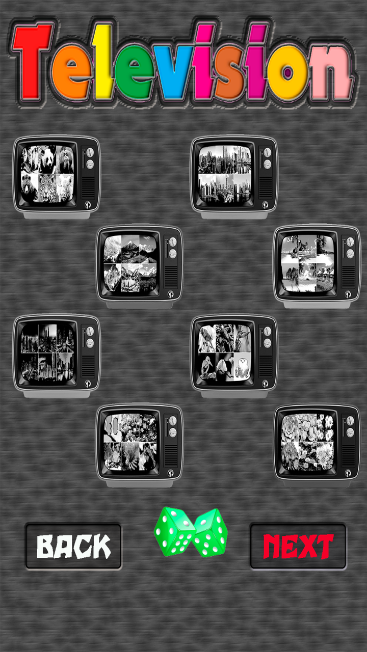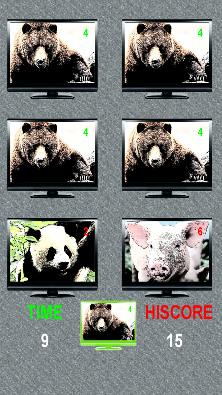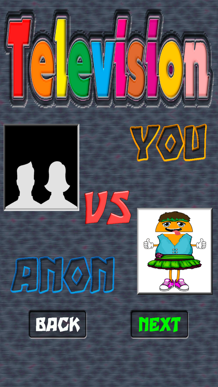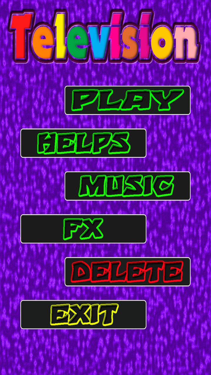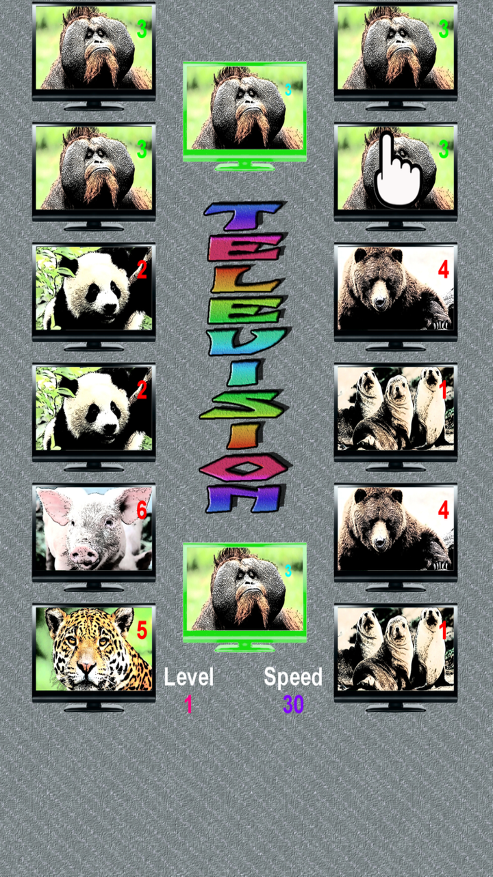 Television is a very addictive and entertaining game. Prepare to tune the images of the televisions with the chosen channel. Game instructions: Television, visual memory game and mental quickness. - You have to tune all the televisions with the image of the same channel and do it in the shortest time, to overcome the standard 15 seconds, in the time game mode. - Play against Anom and try to tune all the channels before Anom. - You can select the types of channels you want, you can choose between 8, you can also do it at random, that Anom chooses, by clicking on the dice. - Click on the images to tune the television, the images will change, until you tune the image with the channel that has been chosen, are the televisions that are flashing. - At the beginning of the game you have a help that tells you the channel number that corresponds to the image you have to tune, you will go much faster. - Anom is learning, each level you earn will become more intelligent and faster. Game features: - Eight television channels, six different images per channel. - Game of time or play against Anom - Unlimited levels, but there will come a moment that Anom will be a marvel and you will not be able to surpass him, or if, who knows, the portent can be you. - Auto saved highest score by television channels. - Auto saved of lower time, by television channels. - Music button, on or off. - Sound effects button, on or off. - Delete button (returning the game to its initial state). - Action game with exciting sounds, animations and catchy music. - Help button, to get more visual aids (the channel number you have to tune in will appear. - Good luck and beat records in the time game or win Anom and be faster than him.