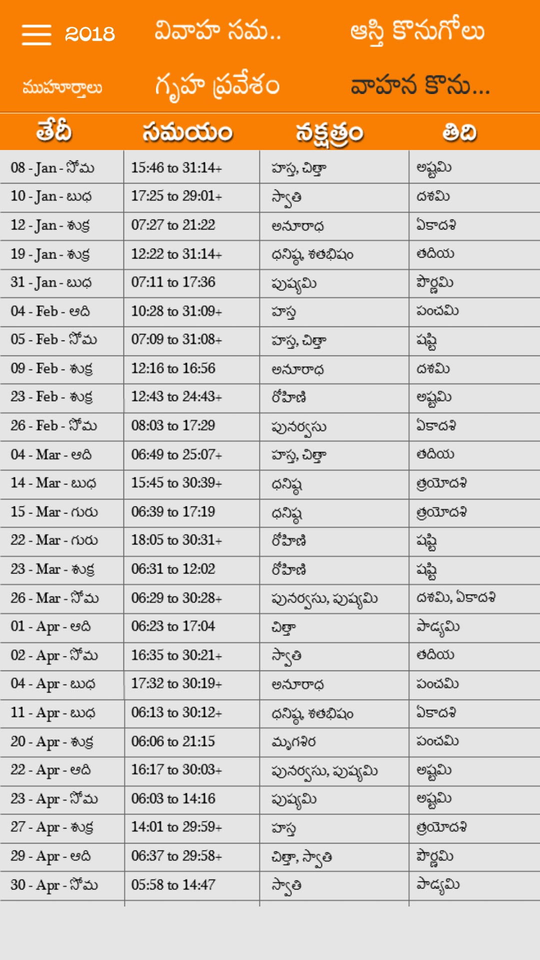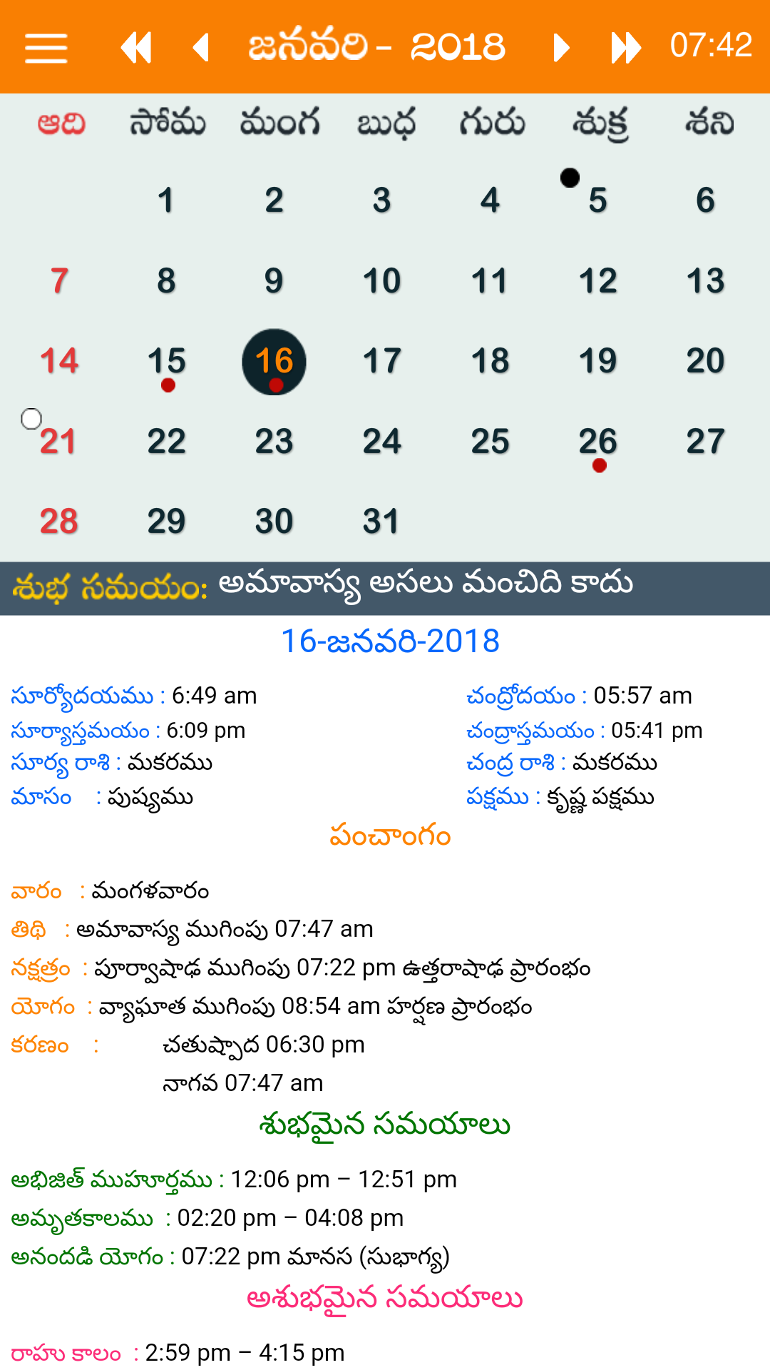 Telugu Panchangam Calendar is an informative app for people of Andhrapradesh and Telangana and Telugu speaking people across the world.Wherever you go! This application is a great tool to help you get the most out of your day, and plan your days for success. Telugu panchangam 2018 Telugu Calendar 2018 Telugu panchangam calendar 2018 is Day wise Calendar Application supports following features : 1) Masam, Paksham, Sunrise, Sunset, Moonrise, Moonset, Sunsign and Moonsign. 2) Panchangam (Thidi,Varam, Nakshathram, Yogam, Karanam) 3) Good Time (Amritakalam, Abhijit Muhurtham, Anandadi Yoga) 4) Bad Time (Rahukalam, Yamagandam, Varjyam, Gulik kalam, Dur Muhuratam) 5) Horoscope (Daily, Week, Month, Year) 6) Muhurtham (Marriage, Property, Housing, New Purchase ) 7) Festivals (Particular Month) * Users can select any date and get information for that particular date. * Users can select any month and year by clicking left and right arrow buttons