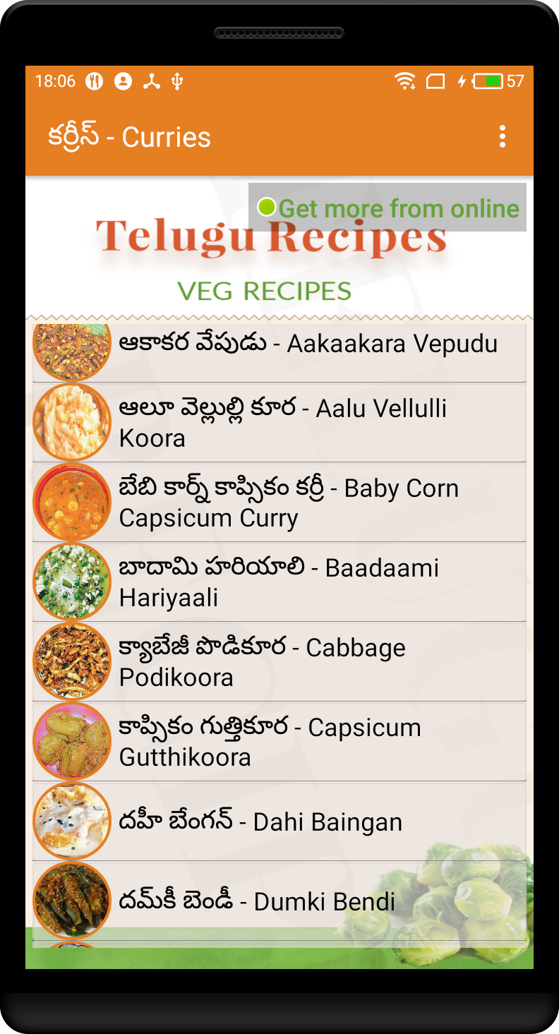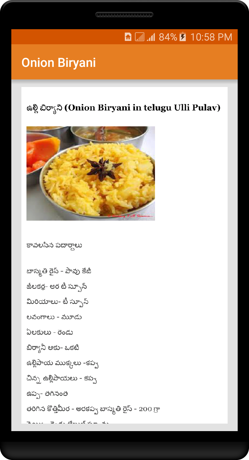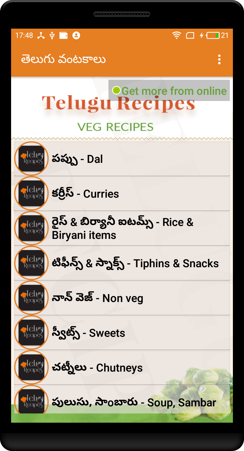Recipes from an Indian kitchen with a focus on Andhra cuisine. * Now added 103+ recipes. ఆంధ్ర వంటలు ఎలా చెయ్యాలో తెలుసుకోండి. స్వీట్లు, స్నాక్క్సు , బిరియాని, మటన్ మొదలగునవి చేసే విధానం Features. * No need internet connection . * Content in Pure Telugu language. Telugu recipes,Indian recipes,Recipes,Homemade,Hyderabad biryani.