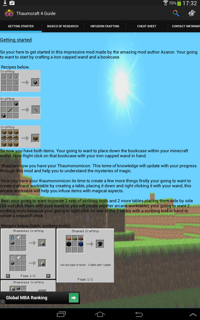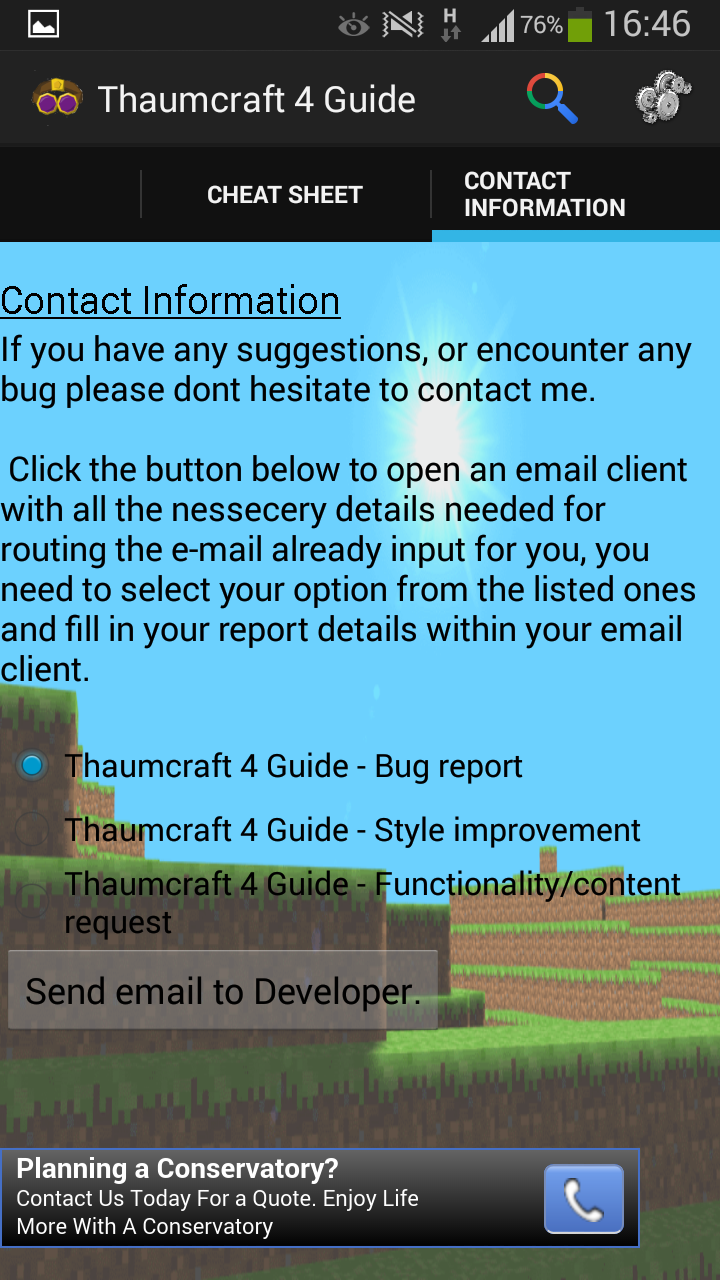 This application is a culmination of all the information out there on the web combined with my own knowledge of the amazing minecraft mod, thaumcraft 4. This minecraft mod was written and developed by Azanor. I have created this application to be used in conjunction with the thaumcraft 4 mod, the application is still under heavy development and new features are being implemented even now as you are reading this. Please don't hesitate to contact me by either using my contact details on this page or preferably using the feature inside the application as by using the email routing feature inside the application will help me get around to viewing you valued suggestions and reports and help me identify and fix any problem areas quicker. I thank you for you interest and i am looking forward to getting your feedback on how to improve this application.