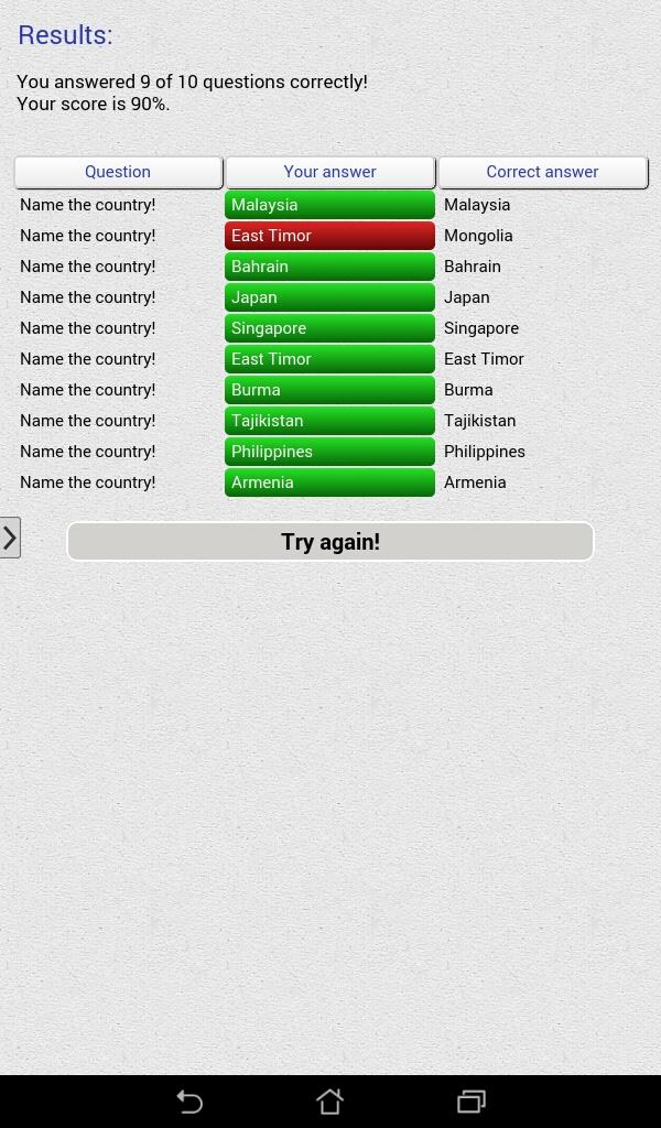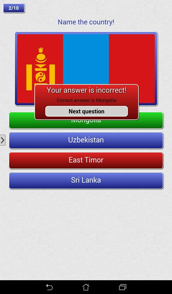 Test your knowledge of the flags of the countries of Asia. Features: • 50 flags of Asian. • 10 multiple choice questions. _____________________________________ Developed by Lixmi Studio Email: [email protected] _____________________________________ All flag images provided by Pixabay.
