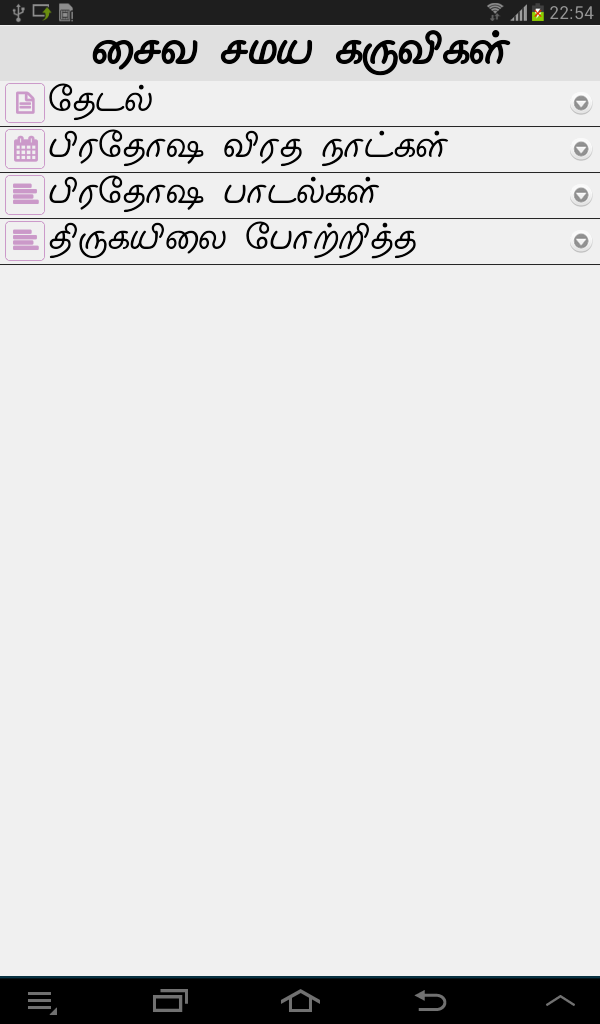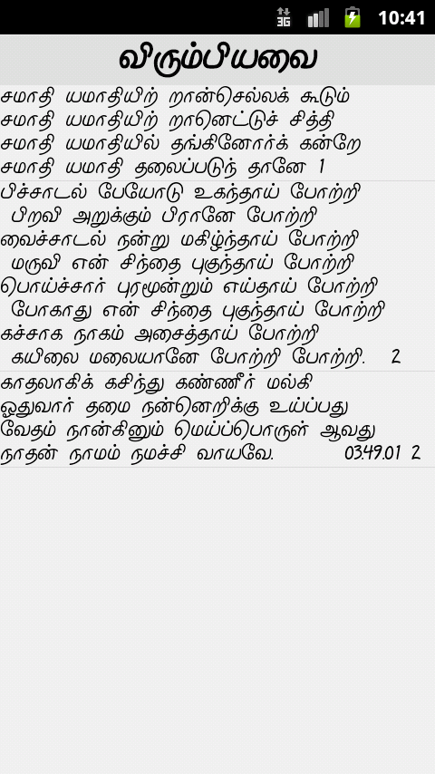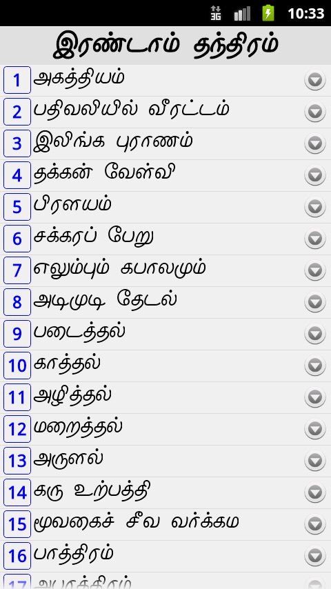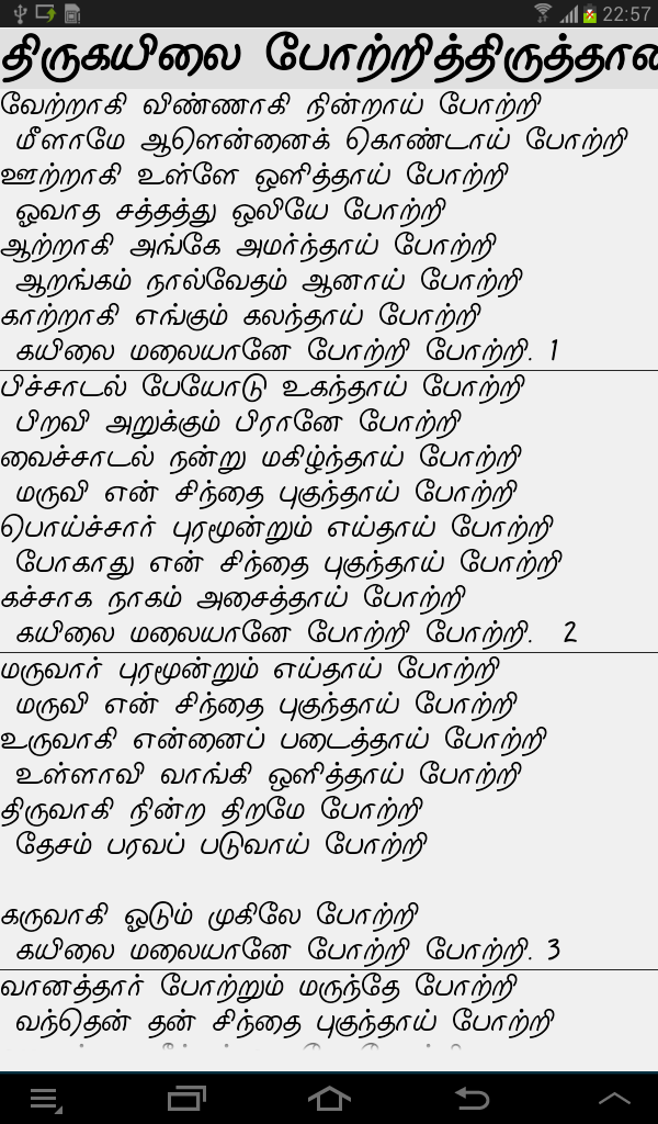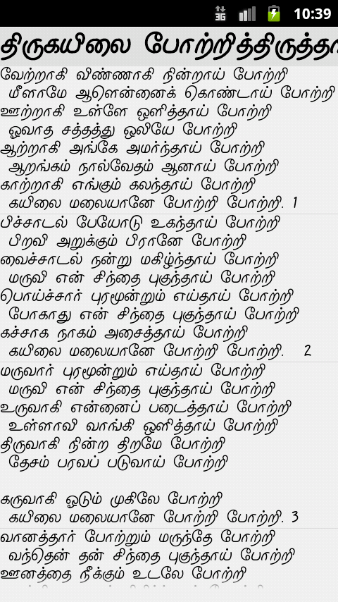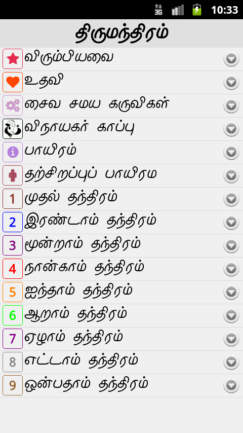 Sivayanama! iTab Technologies blessed with opportunity to bring this digitized version of ancient wisdom – Thirumanthiram, the 10th volume of Thirumurai. We believe this app will enlighten yourself and helps your yogic or spiritual progress. Features of this App: 1. Original Verses as well as Words seperated Verses 2. Meaning of each verses 3. Mark / Flag your favorite Verses 4. Search Verses (external Tamil Keyboard must be installed) 5. Forward verses by email. 6. List of Pradosham Days 7. Pradosha Virada Verses/Songs *** Your feedback and rating will help us to improve this app to benefit everyone, rate the app generously. *** Keywords: Thirumandiram, Tirumandiram, Thirumoolar, Thirumular, Thirumurai, Thevaaram, Saivam, Shiva, Siva About Thirumanthiram : It deals with how one may live a divine life in the midst of the worldly one. It fulfills the meaning of the word “Tantra” a “web” which joins the spiritual and the material dimensions of life. It expresses the thread of unity, which exists behind the many differences of time, country, language, religion, higher and lower, happiness and misery, wealth and poverty. It deals with all the aspects of life, which makes life worth-living by dealing with dharma, artha, kama, moksa, tapas, Yoga, jnana, siddhi, buddhi, mukti, planets, days, the art of breathing, mantra, tantra, yantra, cakras, meditation, medicine, etc. In short, it is a Tamil encyclopedia of philosophical and spiritual wisdom rendered in verse form.