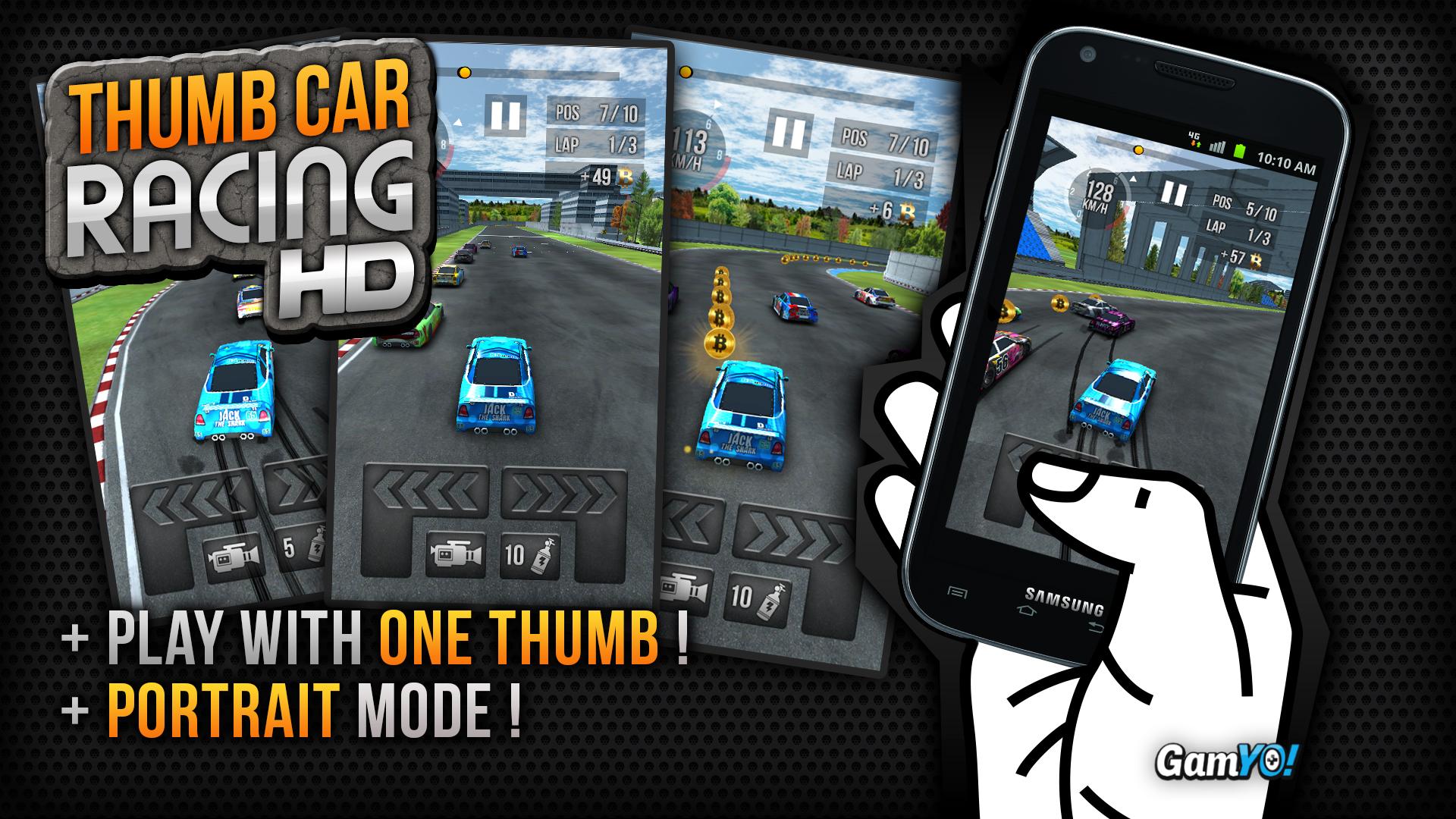 Discover Thumb Car Racing, the car racing game that can be played with the thumb in portrait mode, entirely free (all extra contents in the game are free) Thumb Car Racing is a stock car game with 120 tracks and 40 cars! Drive on wild tracks, challenge 9 opponents and try to make it to the podium and get virtual Bitcoins! Use this money to buy boosters and unlock new and more powerful cars! If you like full and free racing games, challenges and the smell of the asphalt, Thumb Car Racing is perfect for you! Key functionalities : - Car racing game against AI, - Optimized maneuverability for mobile (playable with 1 thumb in portrait mode), - 120 levels with rewards, - Coins to collect in each level, - 25 cars to unlock, - HD Graphics, sounds and interfaces, - Entirely FREE (no in-app purchase).