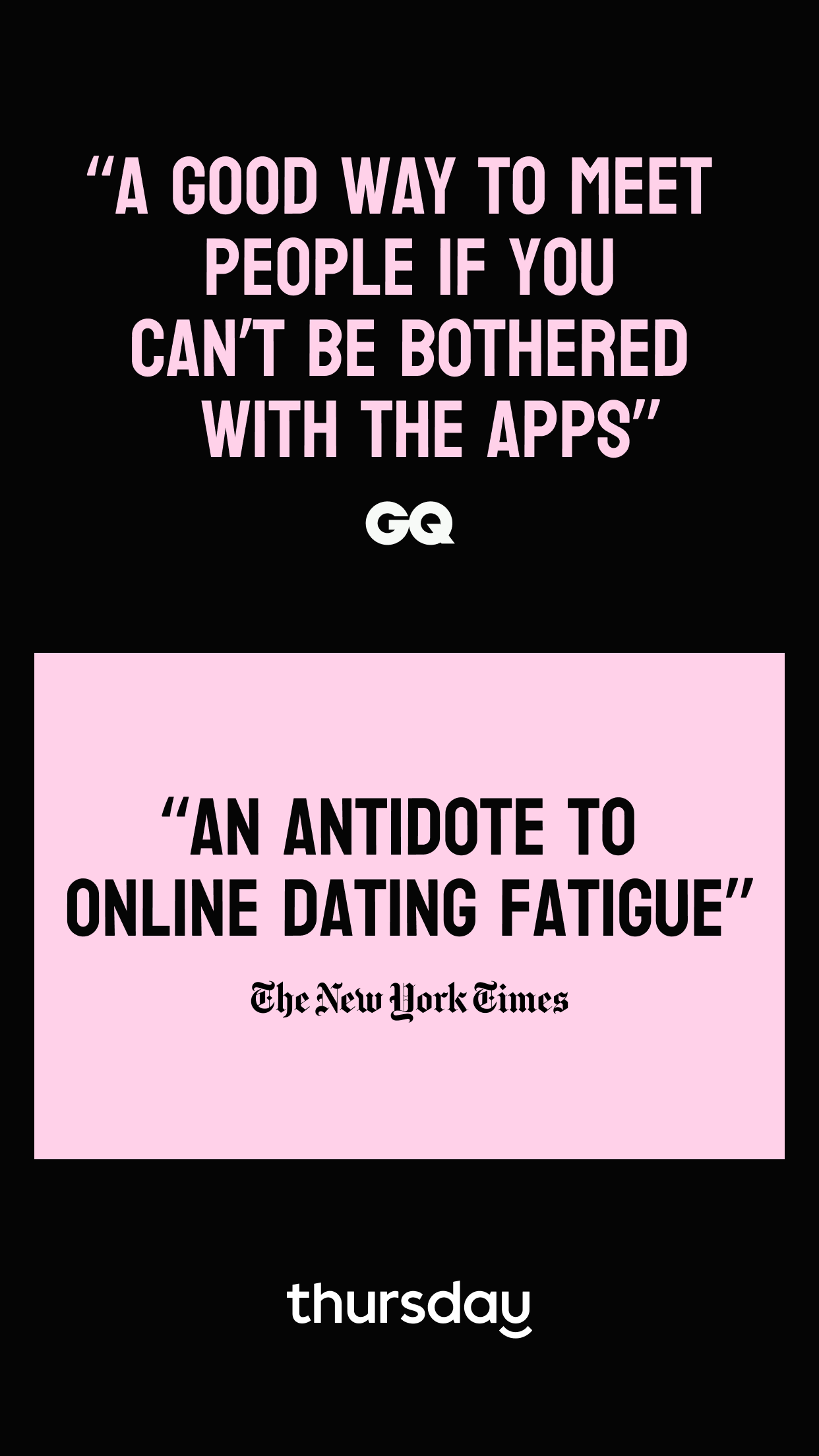We're Thursday - the dating movement that brings your city's single population together under one roof. We're not a traditional dating app, we're against the serial swiping culture with our matching featuring only being LIVE for 24 hours a week PLUS you'll also see events happening in your city.