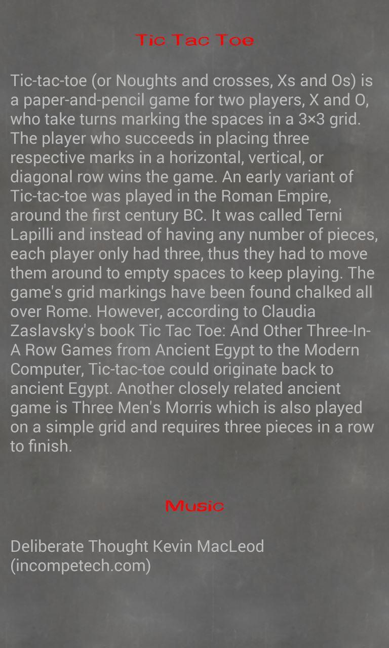 Tic-tac-toe (or Noughts and crosses, Xs and Os) is a paper-and-pencil game for two players, X and O, who take turns marking the spaces in a 3×3 grid. The player who succeeds in placing three respective marks in a horizontal, vertical, or diagonal row wins the game. An early variant of Tic-tac-toe was played in the Roman Empire, around the first century BC. It was called Terni Lapilli and instead of having any number of pieces, each player only had three, thus they had to move them around to empty spaces to keep playing. The game's grid markings have been found chalked all over Rome. However, according to Claudia Zaslavsky's book Tic Tac Toe: And Other Three-In-A Row Games from Ancient Egypt to the Modern Computer, Tic-tac-toe could originate back to ancient Egypt. Another closely related ancient game is Three Men's Morris which is also played on a simple grid and requires three pieces in a row to finish. [wikipedia] Also known as Tic-tac-toe, tick-tat-toe, o tit-tat-toe Noughts and crosses, hugs and kisses Drei Gewinnt, Kreis und Kreuz, XXO Ta-te-ti, tres en raya, juego del gato, triqui Morpion Boter, kaas en eieren Kryds og bolle Luffarschack o Tripp trapp trull Ristinolla, Jätkänshakki Trips-traps-trull X şi zero Jogo da velha, jogo do galo Τρίλιζα Zero kata, Phool aur chaukadi Maru batsu (円伐), Sanmoku narabe (三目並べ) Морски шах Kółko i krzyżyk Крестики-нолики Bondesjakk, Tripp trapp tresko, Tre på rad איקס מיקס דריקס איקס עיגול križić-kružić Jin Zi You Xi