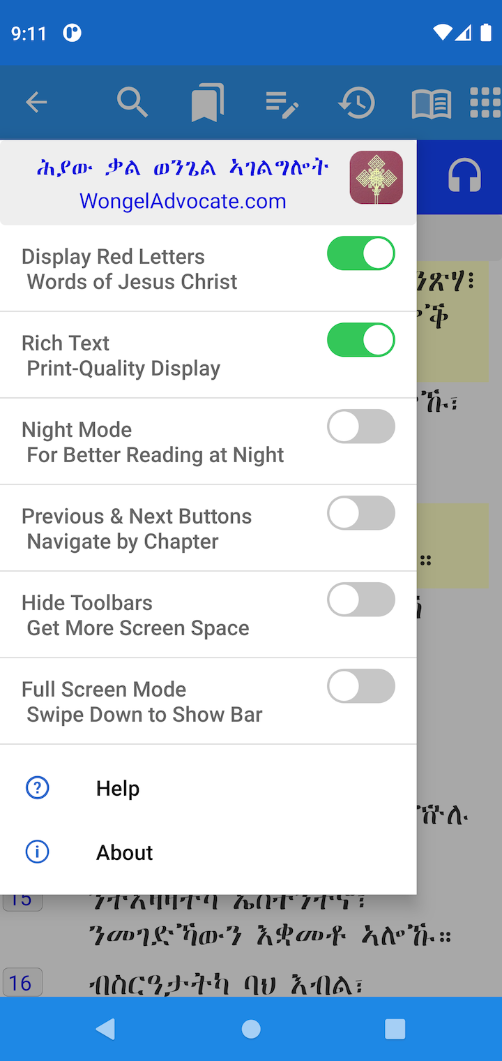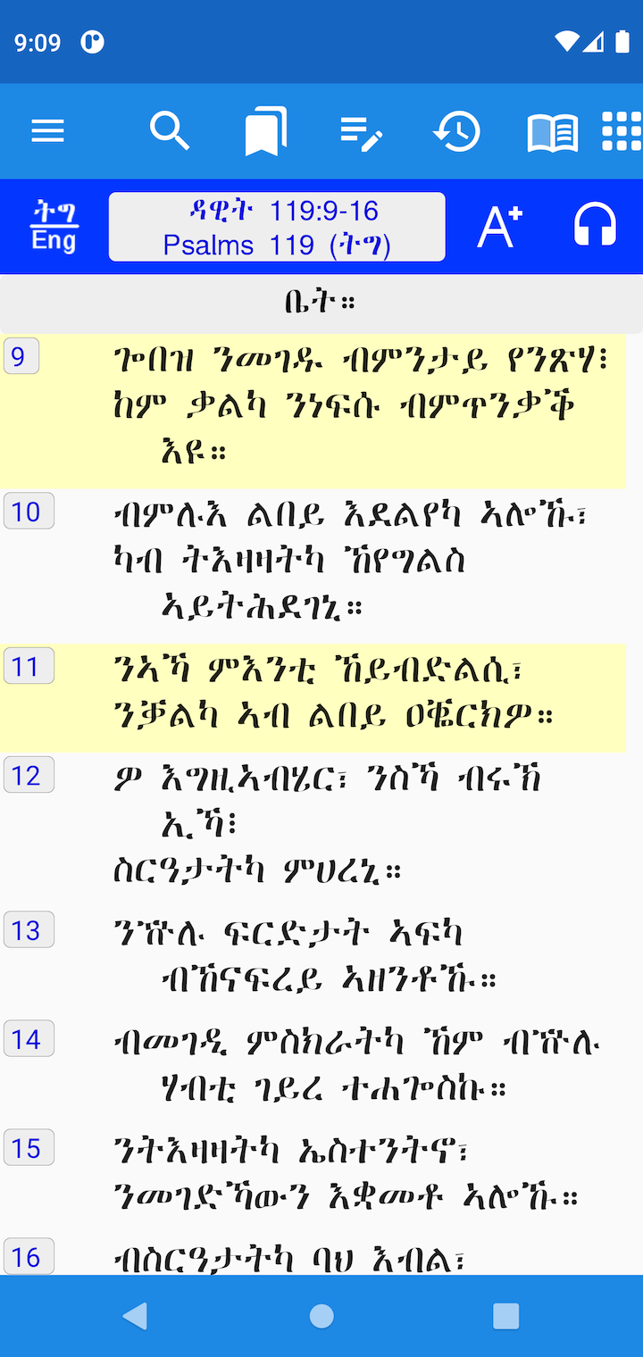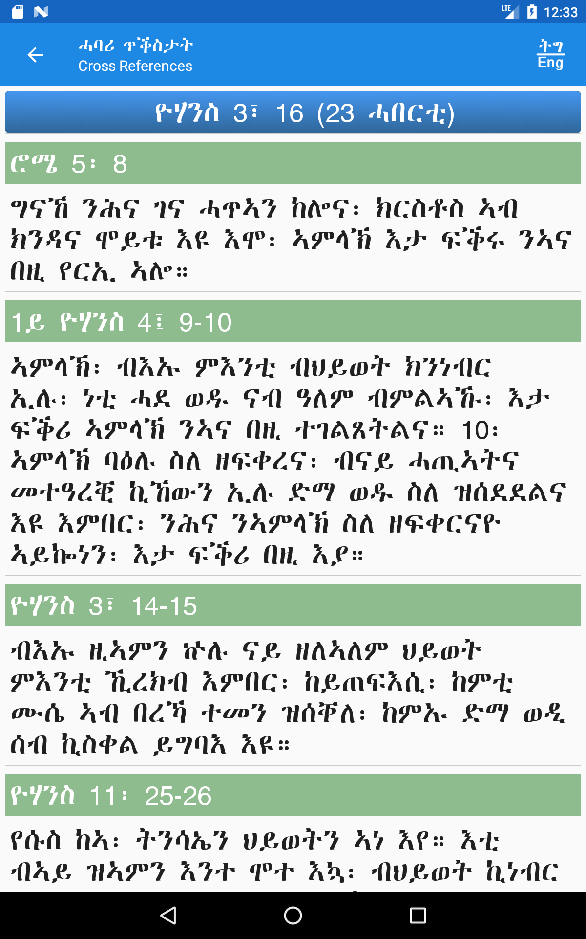 MAJOR FEATURES * Tigrigna, Geez, KJV, SEV, Amharic Bibles with Online Tigrigna Bible Audio * Rich Text display, Words of Jesus in Red, options user can turn On or Off * 250k Cross References - available in all included Bibles * Highlight one or more verses, touch the reference icon * Chapter subtitles in all Tigrigna Bible books, OT and NT * Section titles have color-coded cross reference links displayed in a mini-content window * Search by: verses only, titles only, or verses+subtitles * Great tool for serious Tigrigna Bible Study users, and beginners alike * Smart Loading, Continuous Scrolling & Reading * Word Search: Exact, All Words, Any Words (Search in Geez with installed keyboards) * Search Entire Bible, NT, OT, Moses, Prophets, Epistles... * Chapter Notes for all translations * Switch Versions and compare text - great study tool * Switch chapter by scrolling, with navigation buttons, or from a pop-up * Access reading history by simple back/forward buttons or select from the full list * Major UI Updates * Visit WongelAdvocate.com for more info Hebrews 4:12: "For the word of God is living and active, and sharper than any two-edged sword, piercing even to the dividing of soul and spirit, of both joints and marrow, and is able to discern the thoughts and intentions of the heart." (ቃል ኣምላኽ ህያውን መስለጥን እዩ እሞ) Tigrigna (Tigrinya) Bible Developed by WongelAdvocate.com. We are grateful to GeezExperience.com and to those volunteers who labored to make this available in electronic format - God bless you all. We are also grateful for the many users who continue to encourage us and send us feedback - because of your contributions, the quality and accuracy of the app continues to improve - GOD BLESS YOU! This app does not require Internet connection to operate once installed. Runs on all Android phones and tablets with versions 4.0.3 and higher. WongelAdvocate.com, Bible Apps in Geez, Tigrigna, Amharic, and the Tigray Calendar app - apps for iOS and Android - are products of The Tigray Project. We are dedicated to distribute bibles freely in electronic and print formats. For more, please visit our website http://WongelAdvocate.com. We value your feedback a great deal. Thank you to all who write to us, we respond to each and every request and suggestion. We value God's Word highly and spend the time to fix bugs, correct text typos, and try to make the app very useful to those who are committed to the study of God's Word. (We wish you all Ezra's dedication: "For Ezra had devoted himself to the study and observance of the Law of the Lord, and to teaching its decrees and laws in Israel." 7:10) We have received freely, and so we give freely. We praise God for those who dedicated their time to reproduce God's Word in electronic format freely. We are grateful to: ASV, JKV, WEB, Treasury of Scripture Knowledge and Open Bible...
