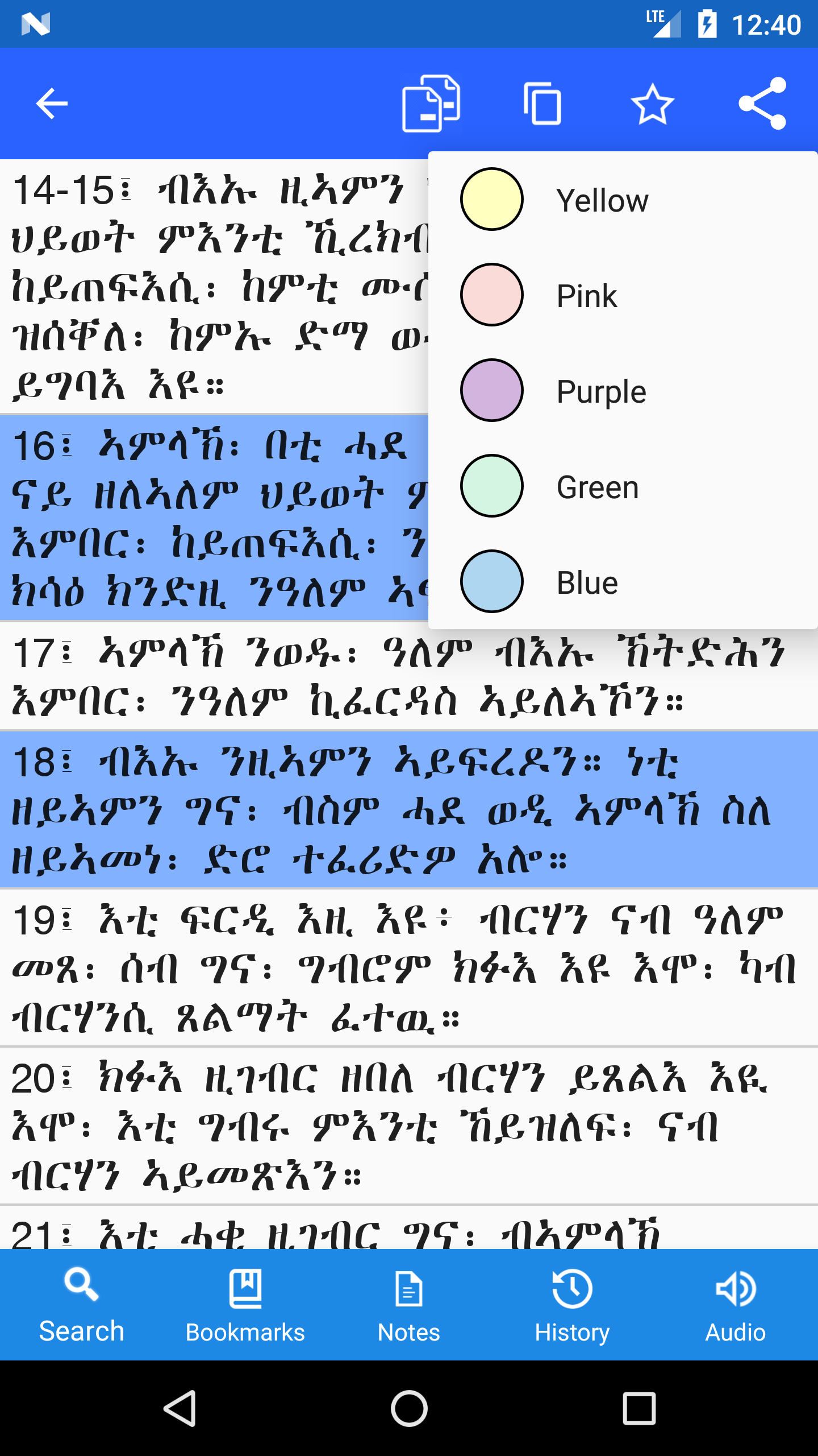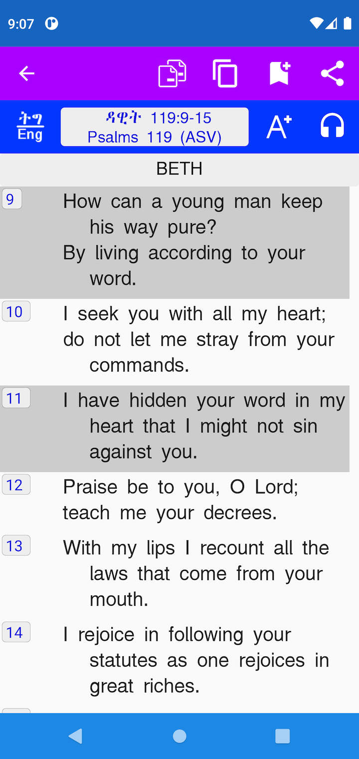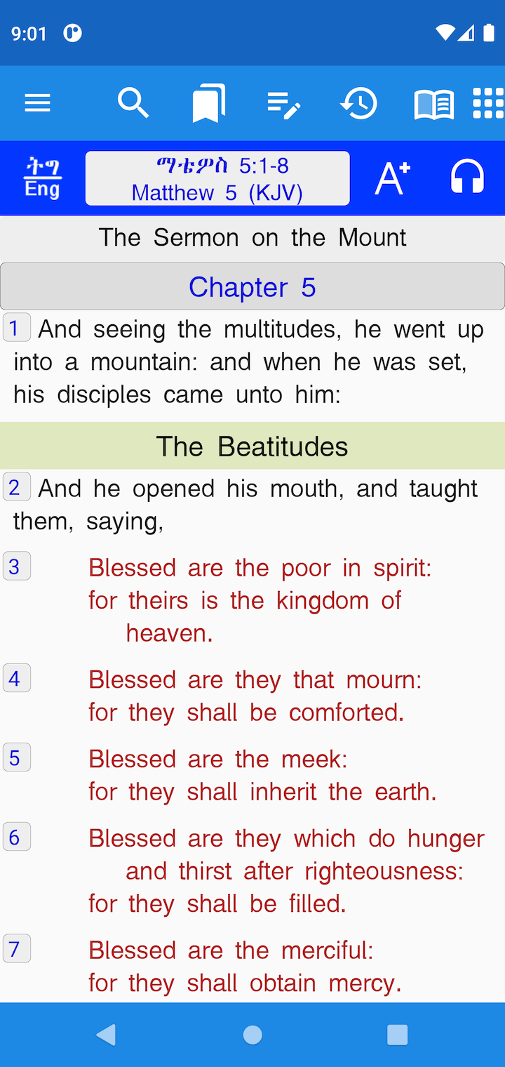 MAJOR FEATURES * Tigrigna, Geez, KJV, SEV, Amharic Bibles with Online Tigrigna Bible Audio * Rich Text display, Words of Jesus in Red, options user can turn On or Off * 250k Cross References - available in all included Bibles * Highlight one or more verses, touch the reference icon * Chapter subtitles in all Tigrigna Bible books, OT and NT * Section titles have color-coded cross reference links displayed in a mini-content window * Search by: verses only, titles only, or verses+subtitles * Great tool for serious Tigrigna Bible Study users, and beginners alike * Smart Loading, Continuous Scrolling & Reading * Word Search: Exact, All Words, Any Words (Search in Geez with installed keyboards) * Search Entire Bible, NT, OT, Moses, Prophets, Epistles... * Chapter Notes for all translations * Switch Versions and compare text - great study tool * Switch chapter by scrolling, with navigation buttons, or from a pop-up * Access reading history by simple back/forward buttons or select from the full list * Major UI Updates * Visit WongelAdvocate.com for more info Hebrews 4:12: "For the word of God is living and active, and sharper than any two-edged sword, piercing even to the dividing of soul and spirit, of both joints and marrow, and is able to discern the thoughts and intentions of the heart." (ቃል ኣምላኽ ህያውን መስለጥን እዩ እሞ) Tigrigna (Tigrinya) Bible Developed by WongelAdvocate.com. We are grateful to GeezExperience.com and to those volunteers who labored to make this available in electronic format - God bless you all. We are also grateful for the many users who continue to encourage us and send us feedback - because of your contributions, the quality and accuracy of the app continues to improve - GOD BLESS YOU! This app does not require Internet connection to operate once installed. Runs on all Android phones and tablets with versions 4.0.3 and higher. WongelAdvocate.com, Bible Apps in Geez, Tigrigna, Amharic, and the Tigray Calendar app - apps for iOS and Android - are products of The Tigray Project. We are dedicated to distribute bibles freely in electronic and print formats. For more, please visit our website http://WongelAdvocate.com. We value your feedback a great deal. Thank you to all who write to us, we respond to each and every request and suggestion. We value God's Word highly and spend the time to fix bugs, correct text typos, and try to make the app very useful to those who are committed to the study of God's Word. (We wish you all Ezra's dedication: "For Ezra had devoted himself to the study and observance of the Law of the Lord, and to teaching its decrees and laws in Israel." 7:10) We have received freely, and so we give freely. We praise God for those who dedicated their time to reproduce God's Word in electronic format freely. We are grateful to: ASV, JKV, WEB, Treasury of Scripture Knowledge and Open Bible...