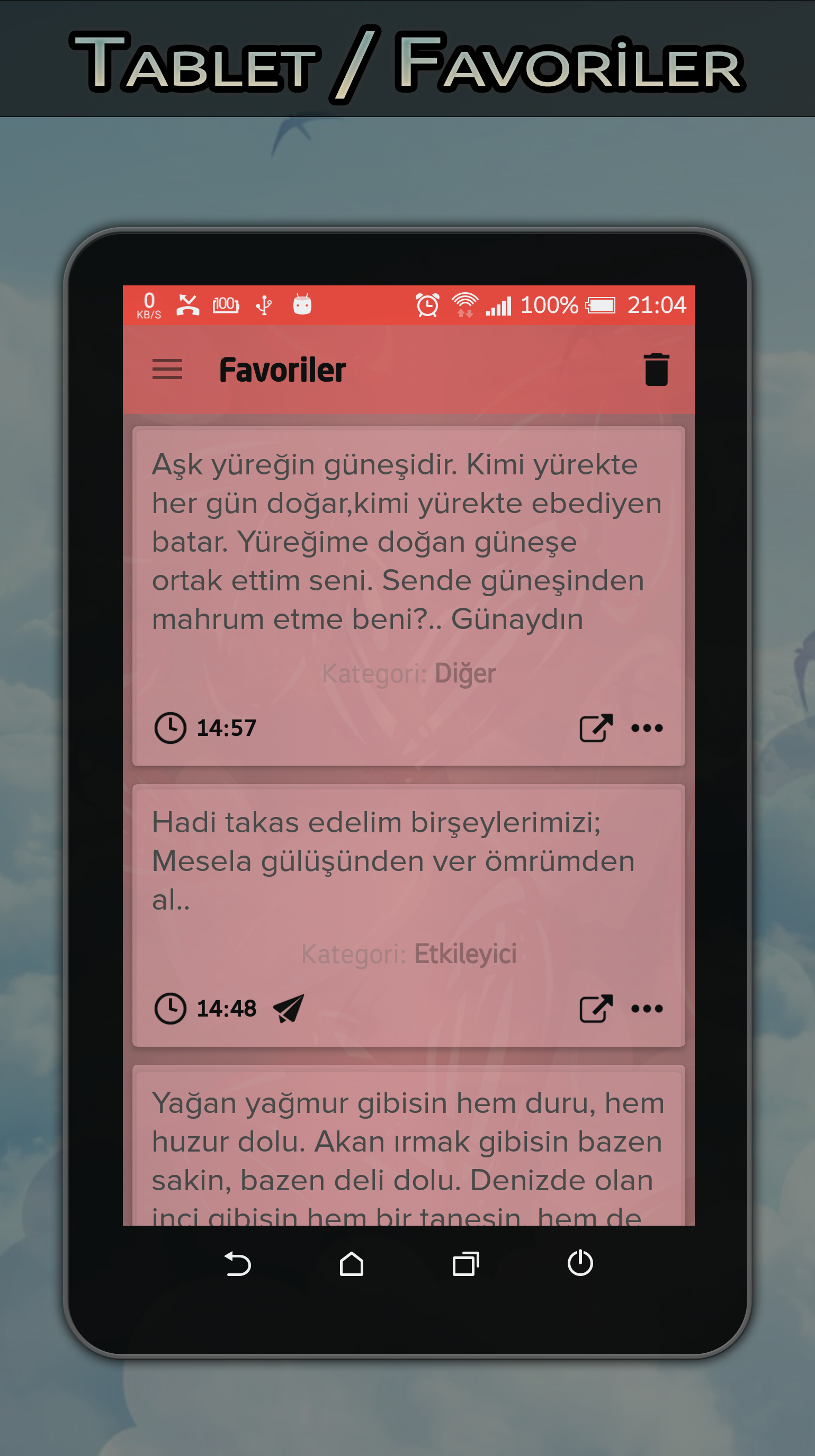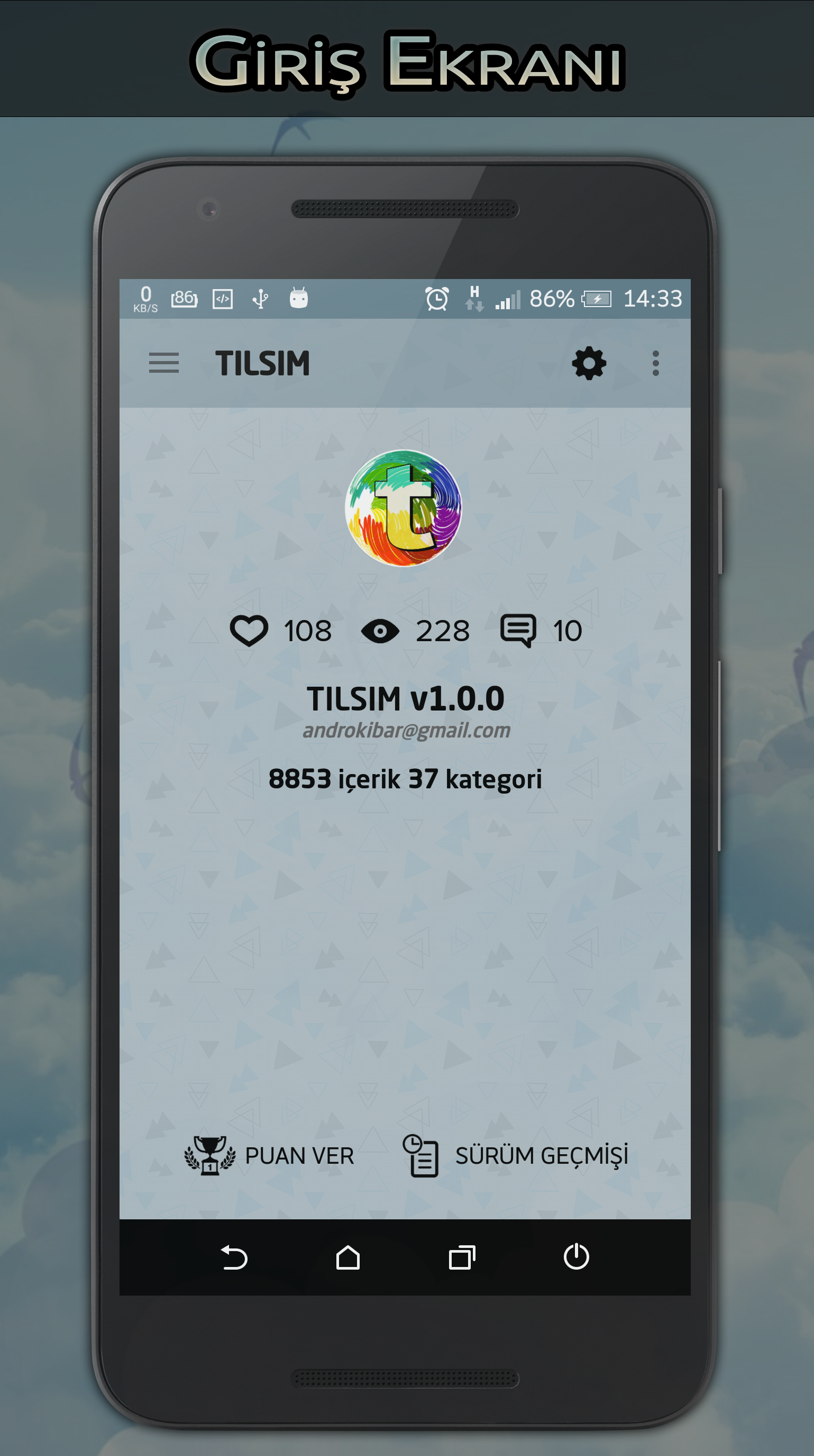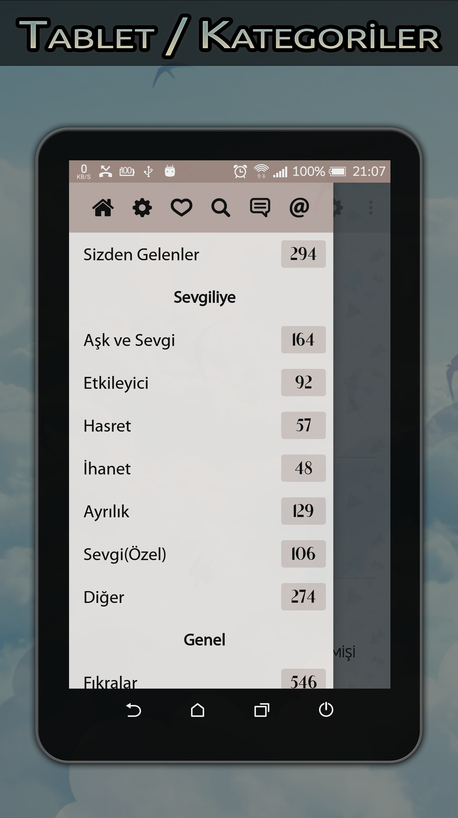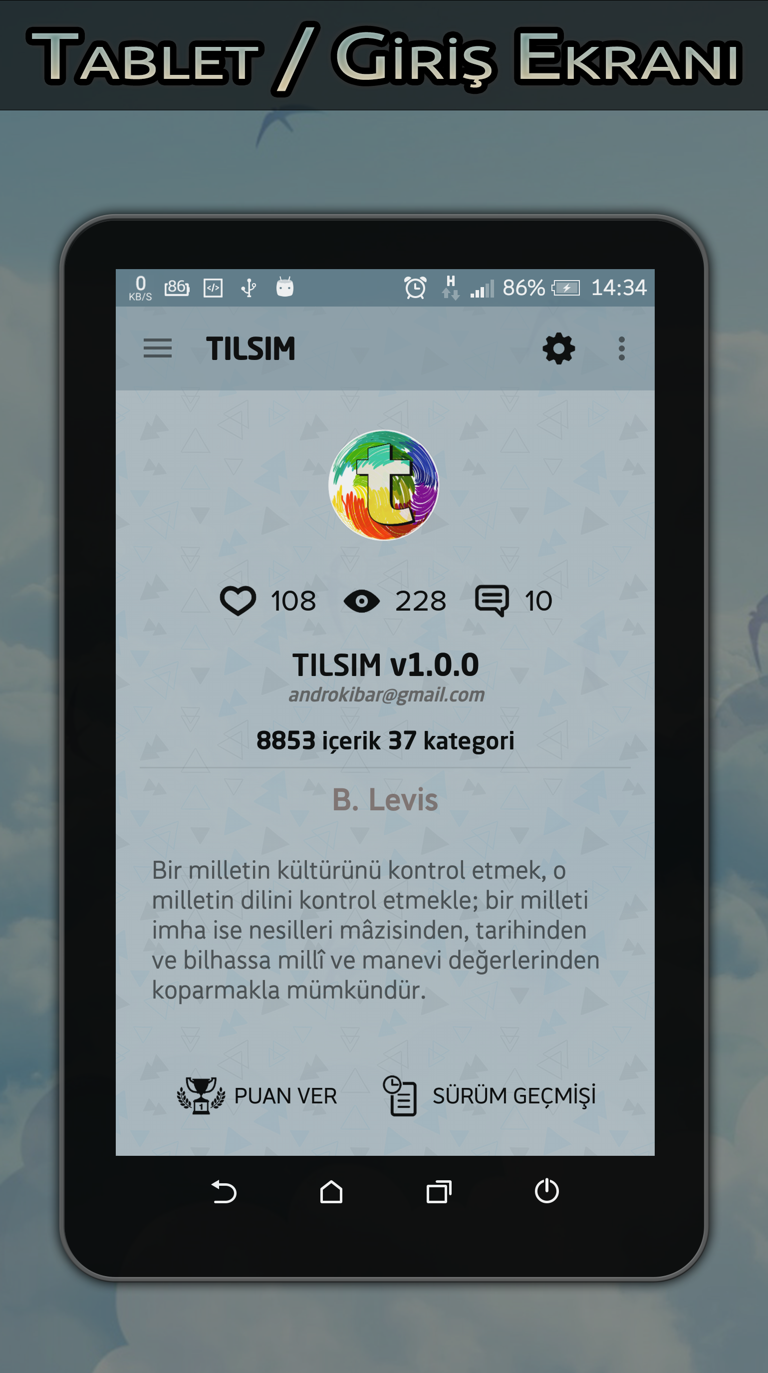 ★★ TILSIM sahip olduğu sade, hoş tasarımı ve gelişmiş özellikleri ile; aşk, sevgi, hasret, doğum günü, yazarlar, genel kültür, fıkralar, bilmeceler, dini gibi 15bin+ içerik 70+ kategori ile bunlara dilediğiniz gibi erişebilirsiniz. Her geçen gün eklenen yeni özellikleri ile uygulama sürekli güncellenmektedir. ★★