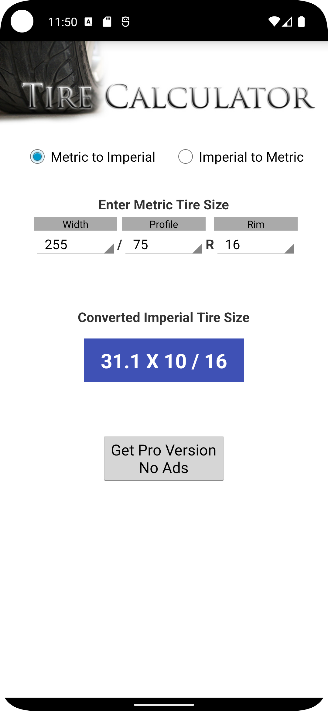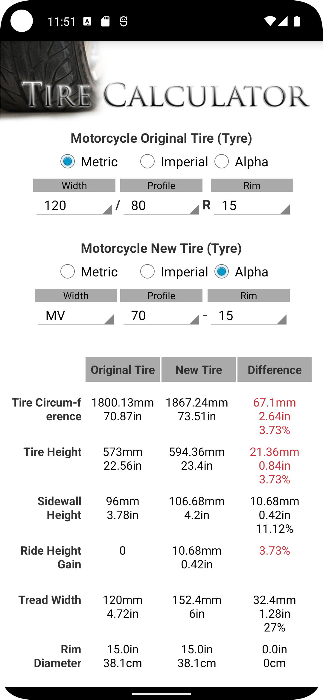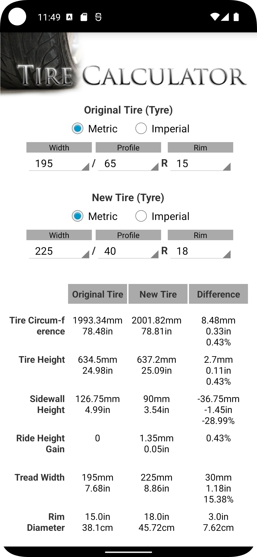 -Added Imperial (inches/US) tire/tyre sizes and its conversion into Metric sizes -Added suggestions for your tire/tyre sizes -Now you can compare any metric tire with imperial tire sizes. -Added more rim and tire sizes.