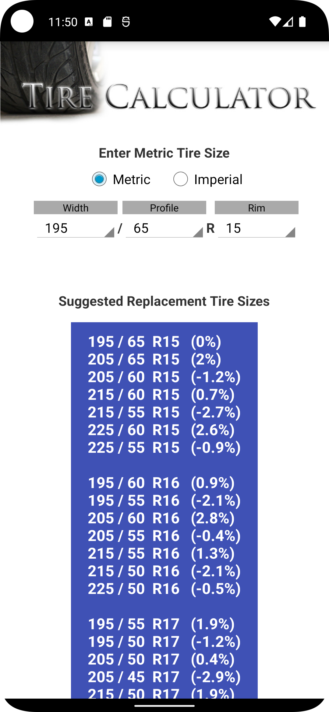 Tire Size Calculator (Package Name: com.aimenrg.tyrecalc) is developed by Aimen RG and the latest version of Tire Size Calculator 4.8 was updated on May 11, 2023. Tire Size Calculator is in the category of Tools. You can check all apps from the developer of Tire Size Calculator and find 186 alternative apps to Tire Size Calculator on Android. Currently this app is for free. This app can be downloaded on Android 4.4+ on APKFab or Google Play. All APK/XAPK files on APKFab.com are original and 100% safe with fast download.