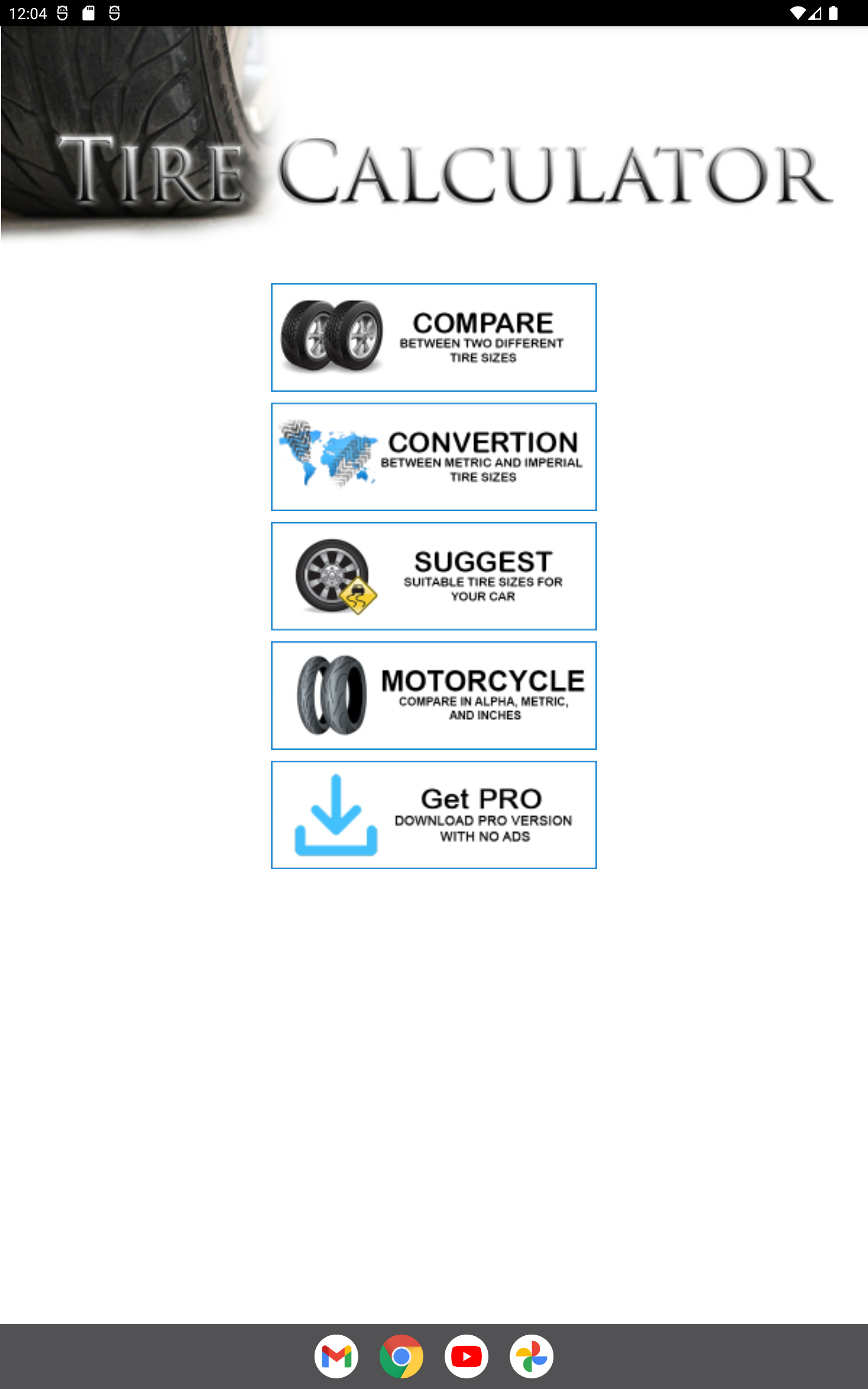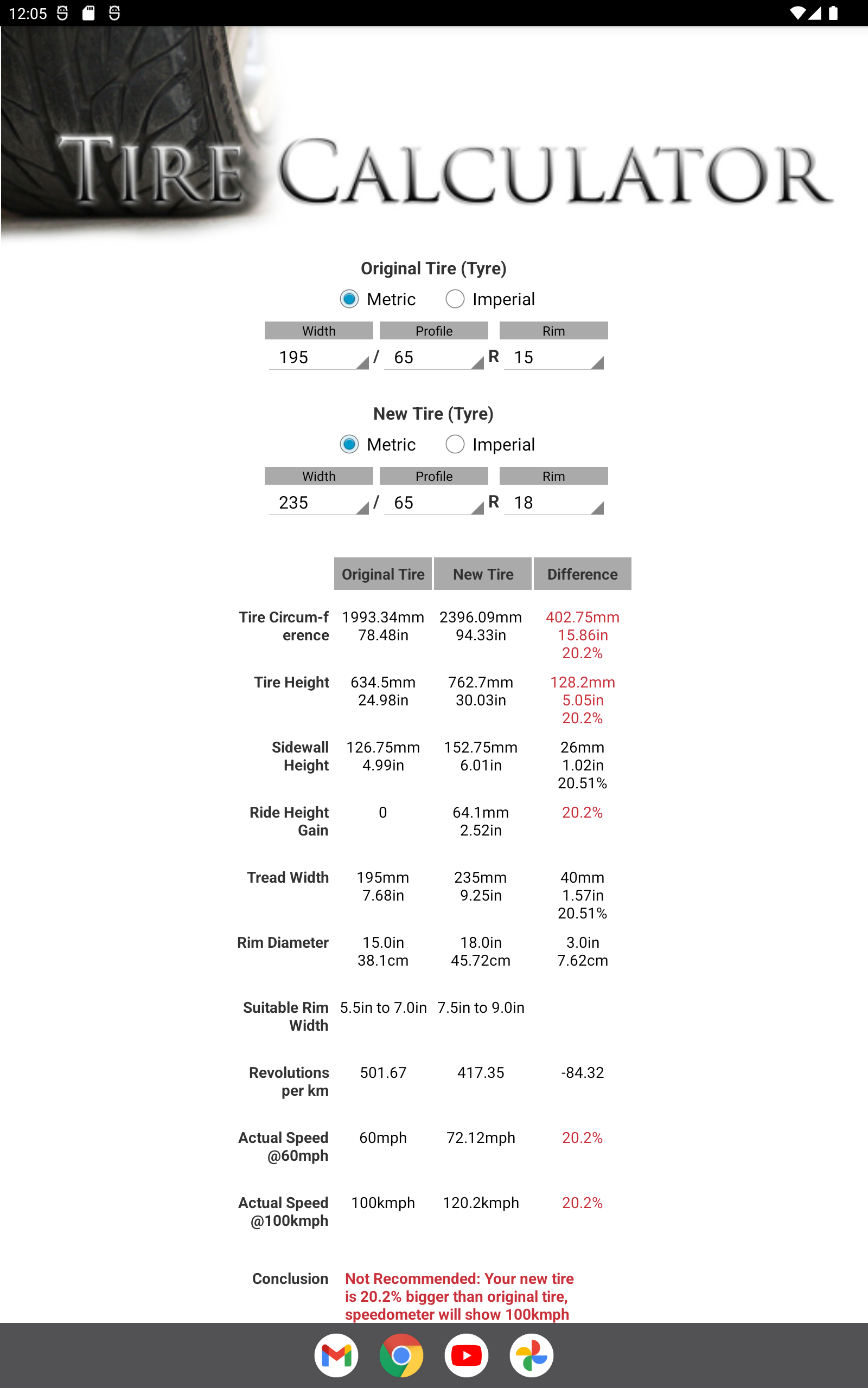 The most comprehensive tire (tyre) comparison tool and size calculator on the store. Suitable for Cars, SUVs, 4x4s, Buses, Trucks, ATVs and Bikes. Only calculator that will let you compare metric tire (tyre) sizes with Imperial (US) tire sizes, automatically converts mm into inches. Includes Four modes -Comparison between two tire (tyre) sizes, either can be metric or imperial. -Convert Metric to Imperial or Imperial to Metric -Suggest a list of tire (tire) sizes that match your original car tire size. -Convert Bike tire sizes including Alpha sizes. Compares tire (tyre) circumference (rolling distance), Height, Sidewall Height/profile, Ride Height Gain, Thread Width, Rim Diameter, Suitable Rim Width, Revolutions per Km, Speed Comparison at 100kmph and 60mph and displays the result in mm, inches, and percentages. To maintain accurate reading of speedometer and proper function of vehicle, one must always use tyres (tires) that have overall circumference within 3% that of factory fitted tyres (tires). If you are currently in the market for new tyres (tires), this is a must have calculator. It is very important to know what tyre (tire) size, or range of tyre (tire) sizes are suitable for your vehicle. Always follow your car manufacturer recommendations.