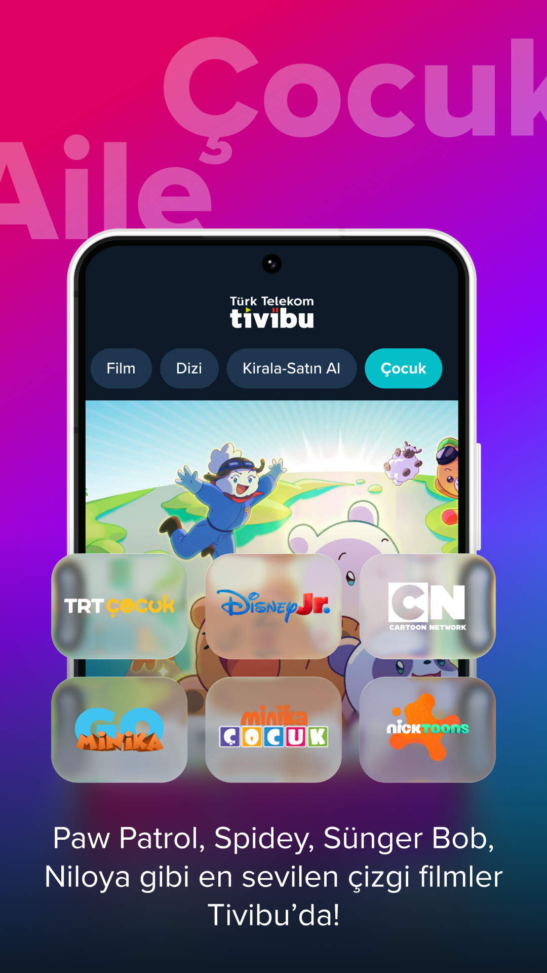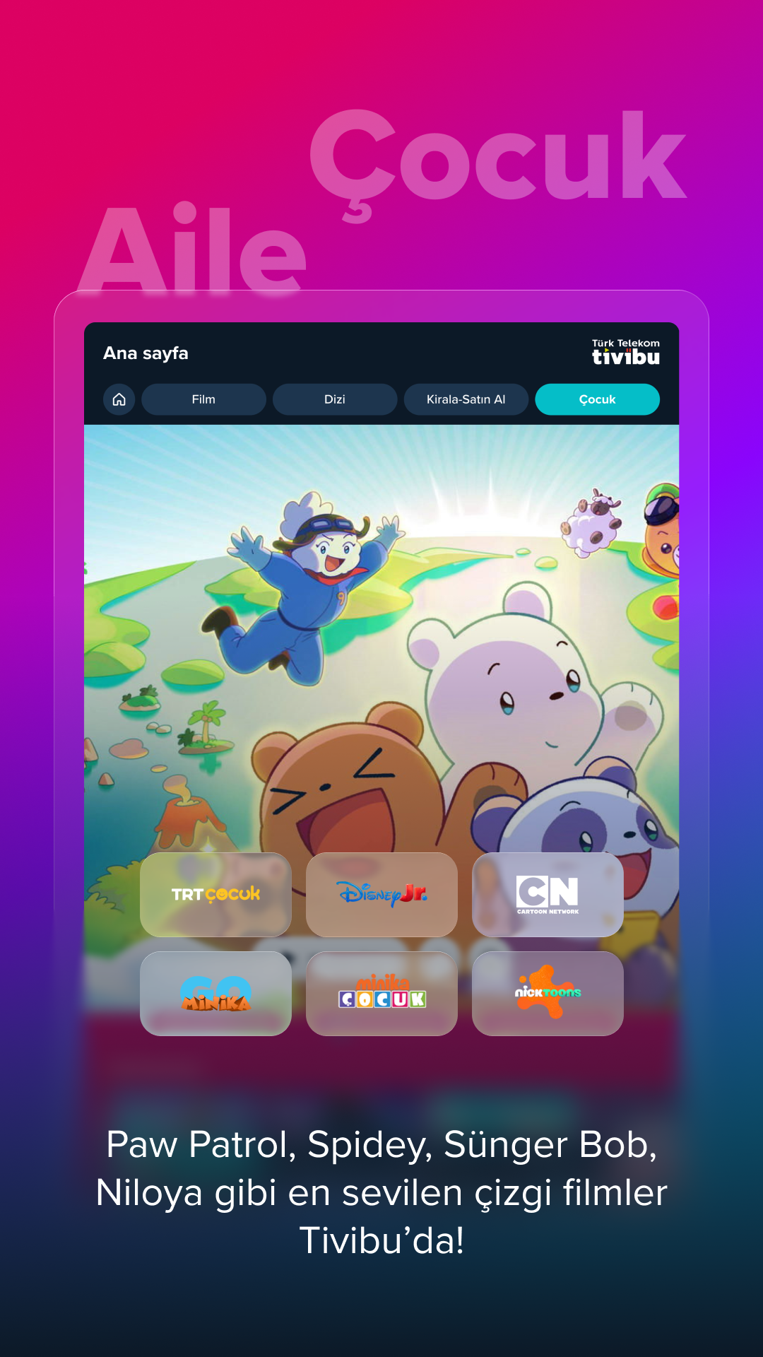 Cartoons and animations special for children; TRT Çocuk, Disney Junior, Minika Çocuk, Minika GO, TRT Diyanet Çocuk, Cartoon Network, Moonbug Baby TV, Nicktoons, Da Vinci kids channels are on Tivibu. The most popular children's animations such as Paw Patrol, Bluey Sponge Bob, Niloya and more are waiting for you in the "Children" category.