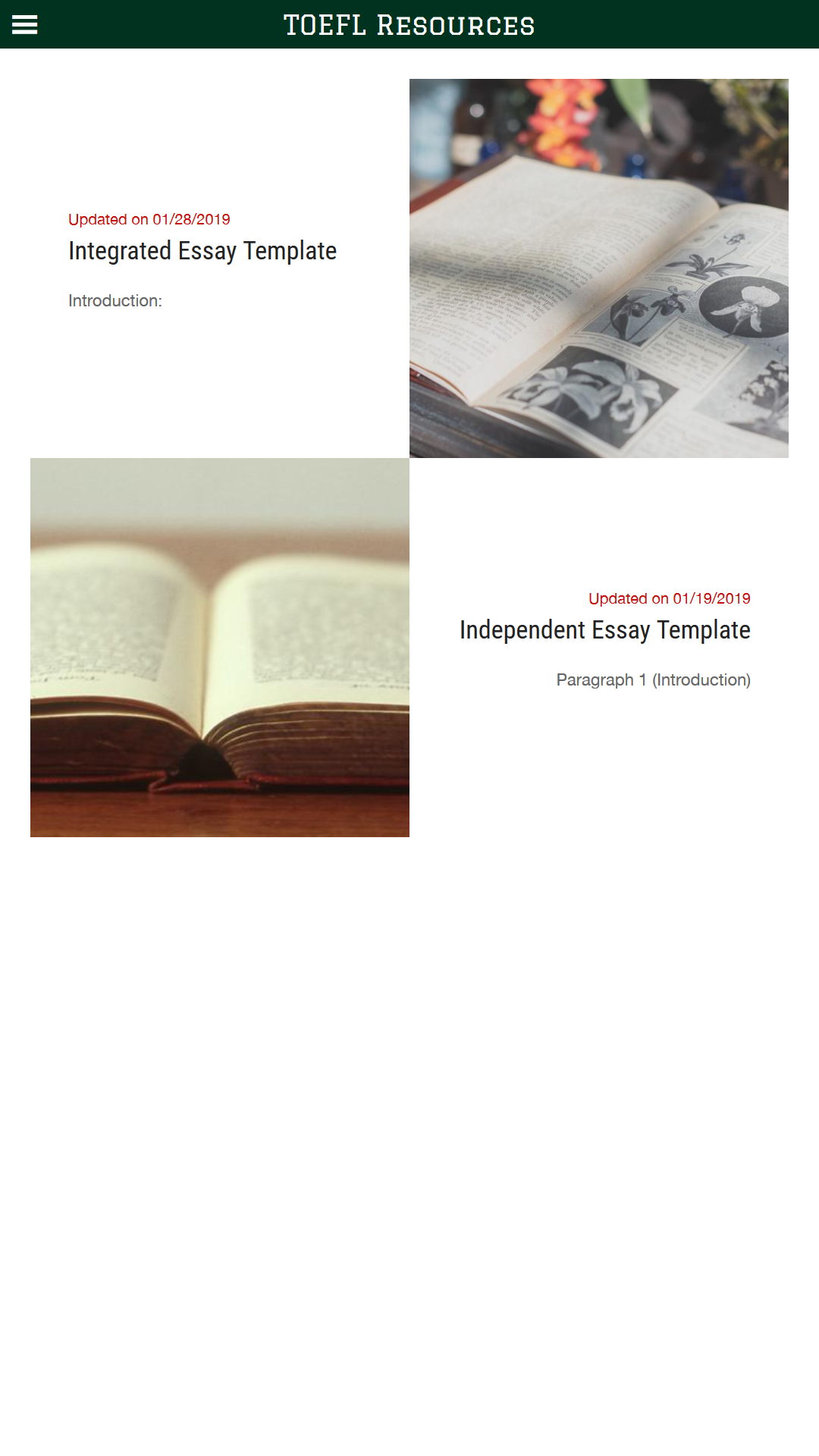 -New User Interface -All questions and essays have been revised to match current TOEFL trends -Essays are now categorized into question styles -One new integrated essay with sources -New templates coming soon -Watch for new speaking content (will be added without app update)