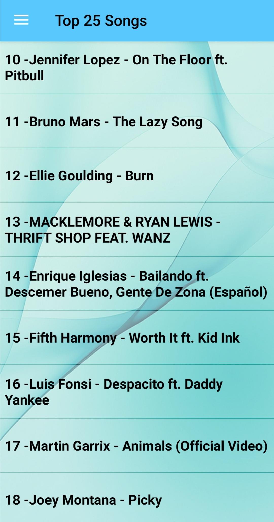 Top 25 Songs (Package Name: com.fabiapp.Top25Songs) is developed by muzikdunyasi and the latest version of TOP 25 Most Popular Songs Offline 1.0 was updated on January 2, 2020. TOP 25 Most Popular Songs Offline is in the category of Music & Audio. You can check all apps from the developer of TOP 25 Most Popular Songs Offline. Currently this app is for free. This app can be downloaded on Android 4.0.3+ on APKFab or Google Play. All APK/XAPK files on APKFab.com are original and 100% safe with fast download.