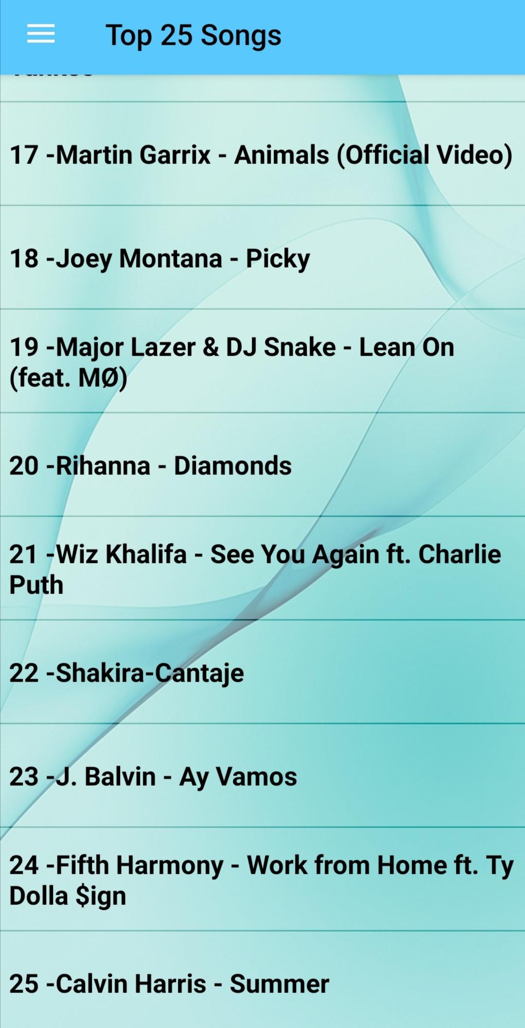 Now, you no longer need to browse the internet to listen of 25 global Most Popular Songs Offline. In this application you will find the 25 Most Popular Songs Offline .Download the free application on your smartphones for unlimited duration and enjoy the best hits with high quality sound and without Internet. ====================================== "1 -Charlie Puth - We Don't Talk Anymore (feat. Selena Gomez)", "2 -Ariana Grande - Problem ft. Iggy Azalea", "3 -Ed Sheeran;Justin Bieber- I Don't Care", "4 -Maroon5-Memoies", "5 -Clean Bandit - Rockabye (feat. Sean Paul & Anne-Marie)", "6 -Eminem - Love The Way You Lie ft. Rihanna", "7 -Ed Sheeran - Shape of You", "8 -Shawn Mendes - Treat You Better", "9 -Taylor Swift - Bad Blood ft. Kendrick Lamar", "10 -Jennifer Lopez - On The Floor ft. Pitbull", "11 -Bruno Mars - The Lazy Song", "12 -Ellie Goulding - Burn ", "13 -MACKLEMORE & RYAN LEWIS - THRIFT SHOP FEAT. WANZ", "14 -Enrique Iglesias - Bailando ft. Descemer Bueno, Gente De Zona (Español)", "15 -Fifth Harmony - Worth It ft. Kid Ink", "16 -Luis Fonsi - Despacito ft. Daddy Yankee", "17 -Martin Garrix - Animals (Official Video)", "18 -Joey Montana - Picky", "19 -Major Lazer & DJ Snake - Lean On (feat. MØ) ", "20 -Rihanna - Diamonds", "21 -Wiz Khalifa - See You Again ft. Charlie Puth ", "22 -Shakira-Cantaje", "23 -J. Balvin - Ay Vamos", "24 -Fifth Harmony - Work from Home ft. Ty Dolla $ign", "25 -Calvin Harris - Summer", ====================================== I wish you fun while listening to music at Music Store. 25 Most Popular Songs Offline - Don't forget your comments about the Best Offline Music app and 5-star support, rate the app in the statement, so we can develop new apps in the future. Your comments will help us develop a more complete application.