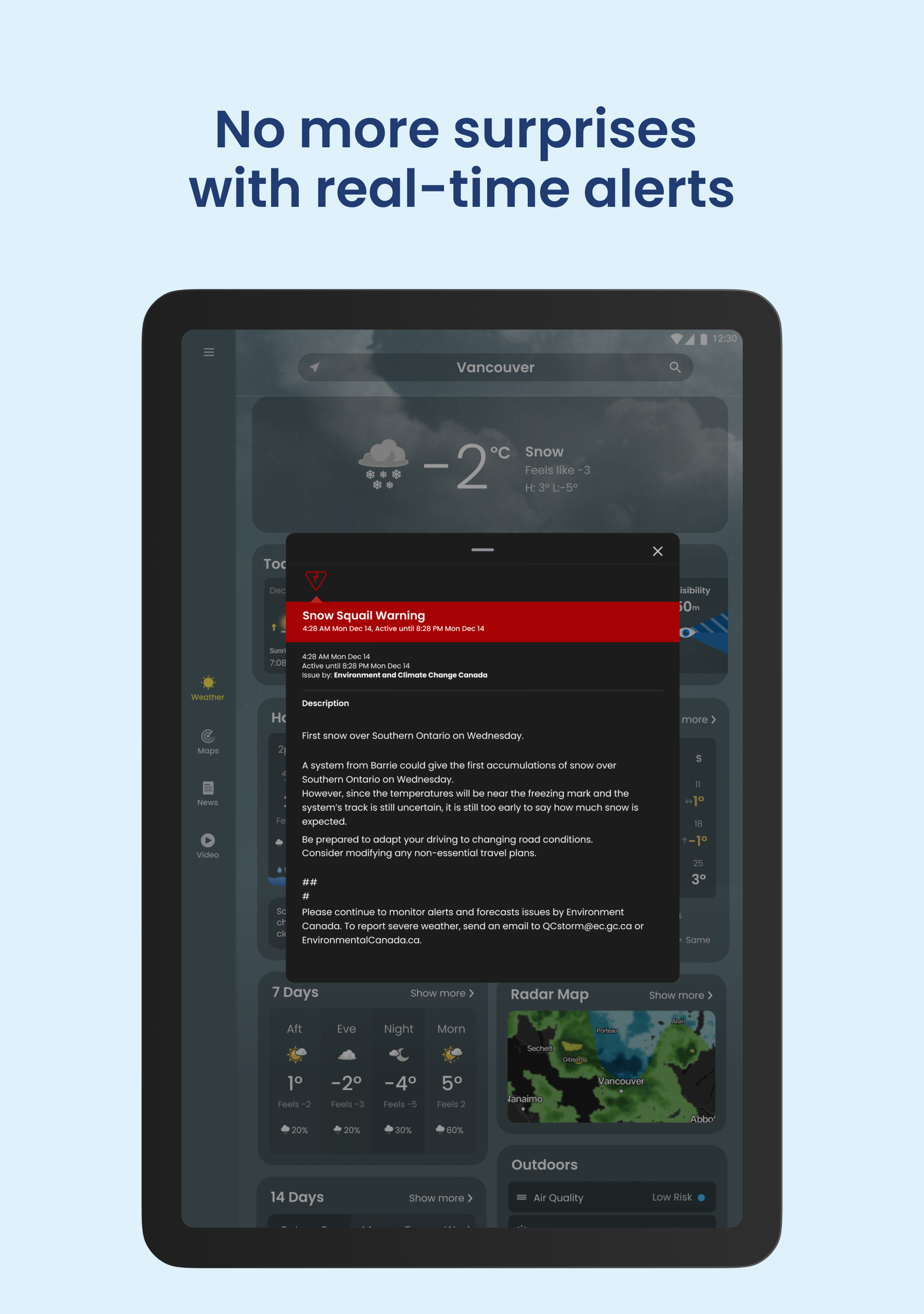 - Wind, storm, rain warnings are provided, keep you safe and sound.