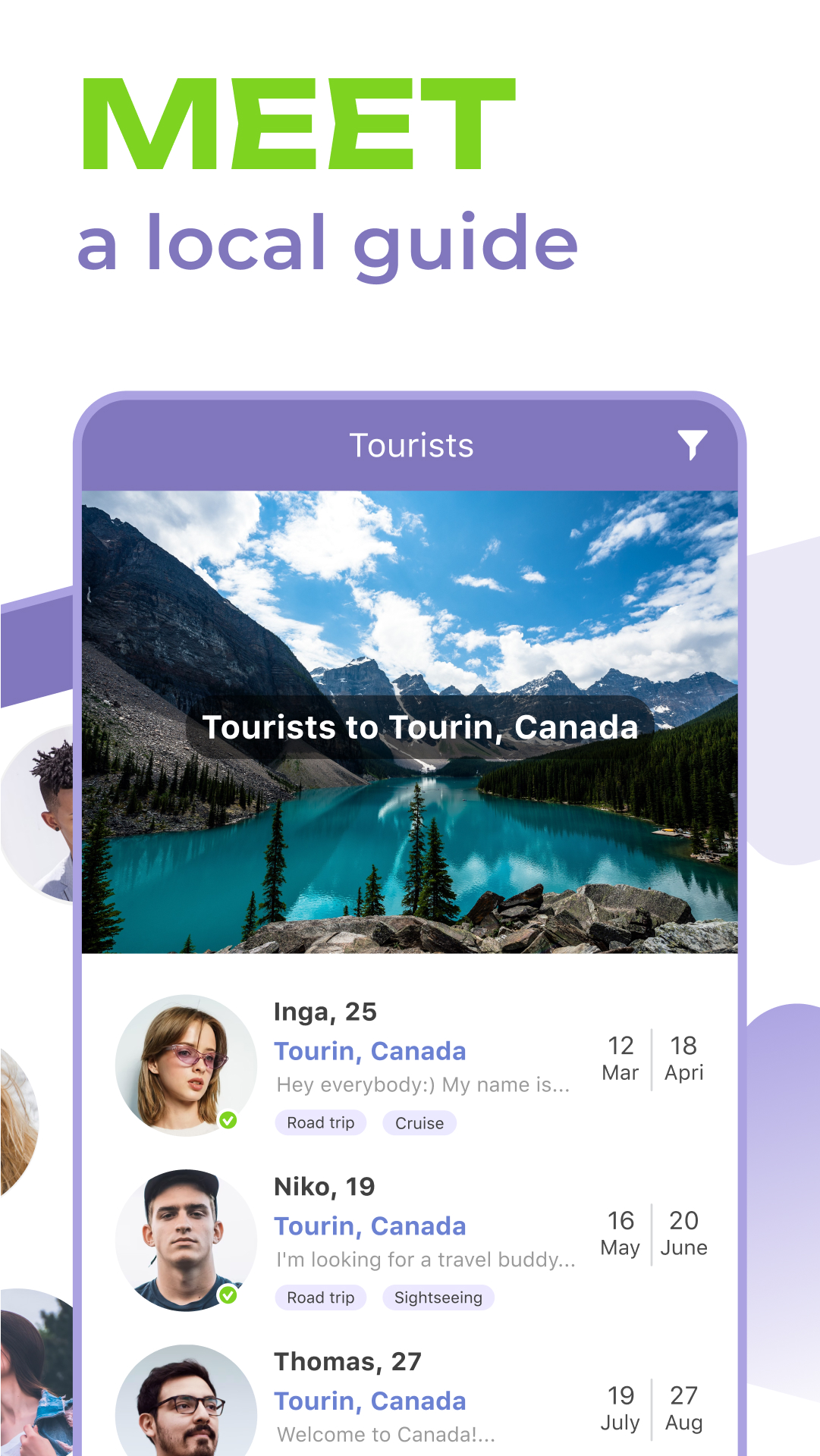 TourBar is a travel app and dating site in the USA and over the world. It is a chance to find friends worldwide, visit a place of your dream, meet your soulmate and start a new relationship, find a travel partner or a local guide when you are traveling. It easy and free! You can use your Facebook or Google account to log in to our travel app. Find travel buddy or interesting places over the world - it's totally free! Download Tourbar today and start traveling together! • Wherever you are going, choose from plenty of cool, friendly travel buddies to help you feel the real thing. • Plan trip together, go out, shop, eat, explore beaches or nature, or just hang out. • Visit your dream destinations and receive adventure travel companions where you are. It’s safe, easy, and takes just seconds. • Find your travel mates for backpacking, an upcoming business trip, convention or unite with new friends for a short break away. • Whether you are interested in dating with Asian, Arabic, European, Russian, South or North American people, you will find plenty of profiles. Meet new people, enjoy unique travel and cultural experience. • Also you can meet the most beautiful women and handsome men from all over the world, make international friends or even find your love not stirring out of the house. Your most awesome vacation starts right here with Tourbar!