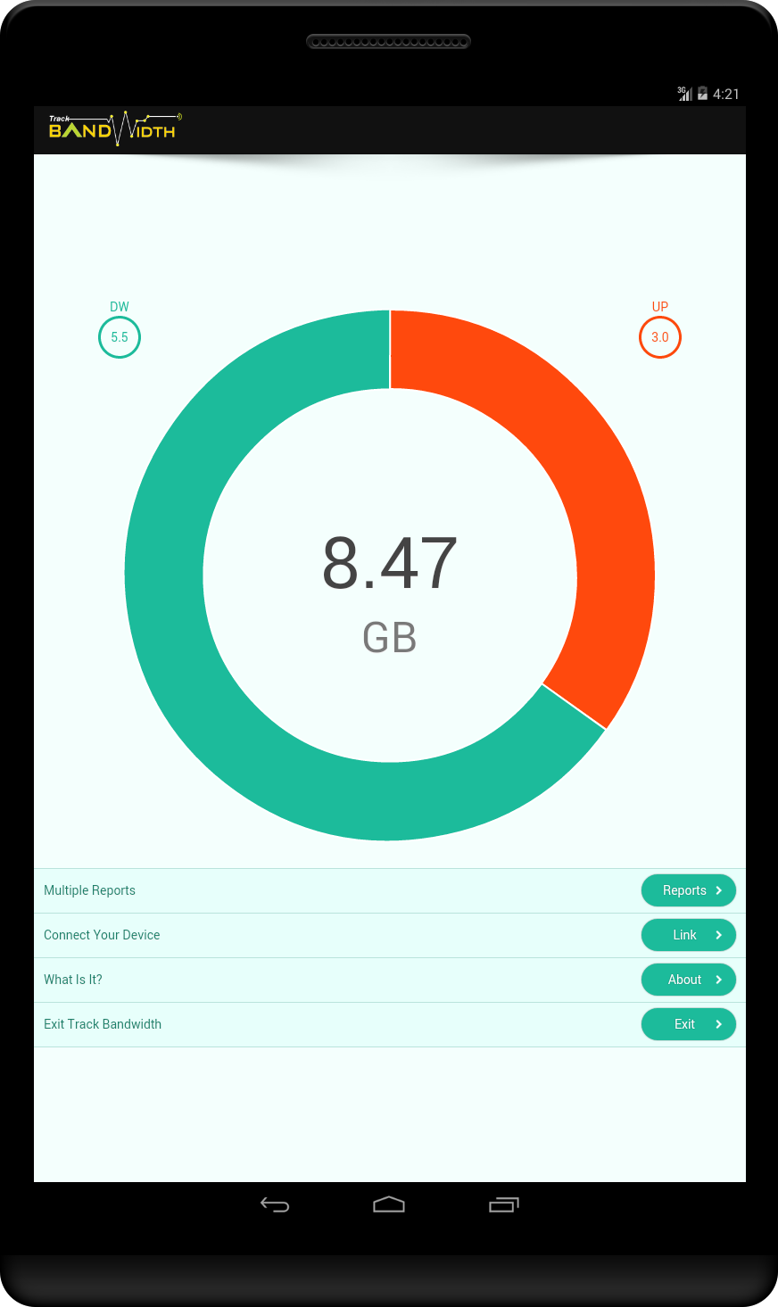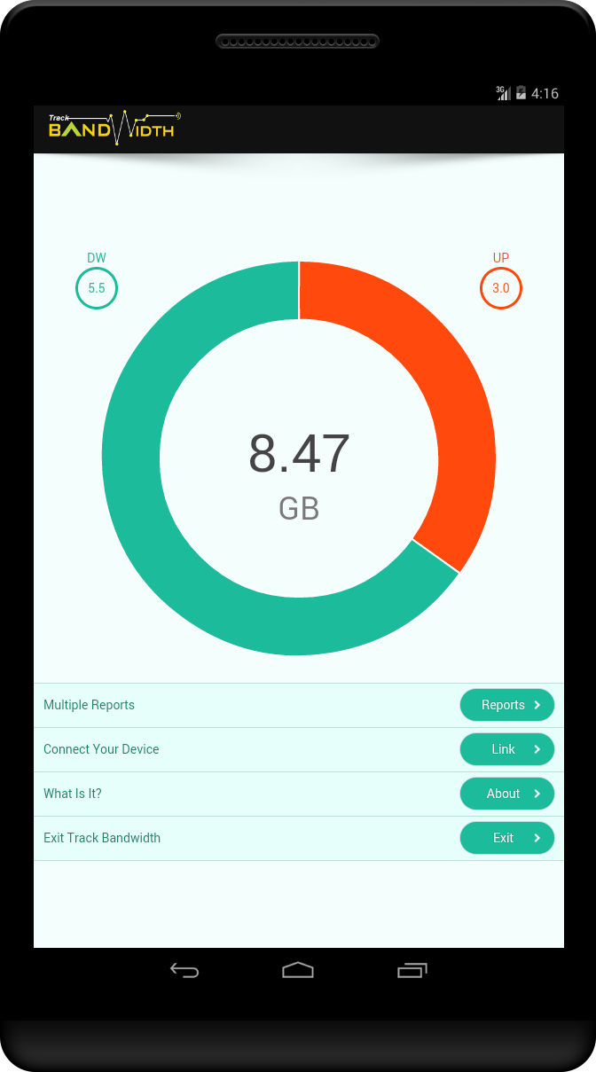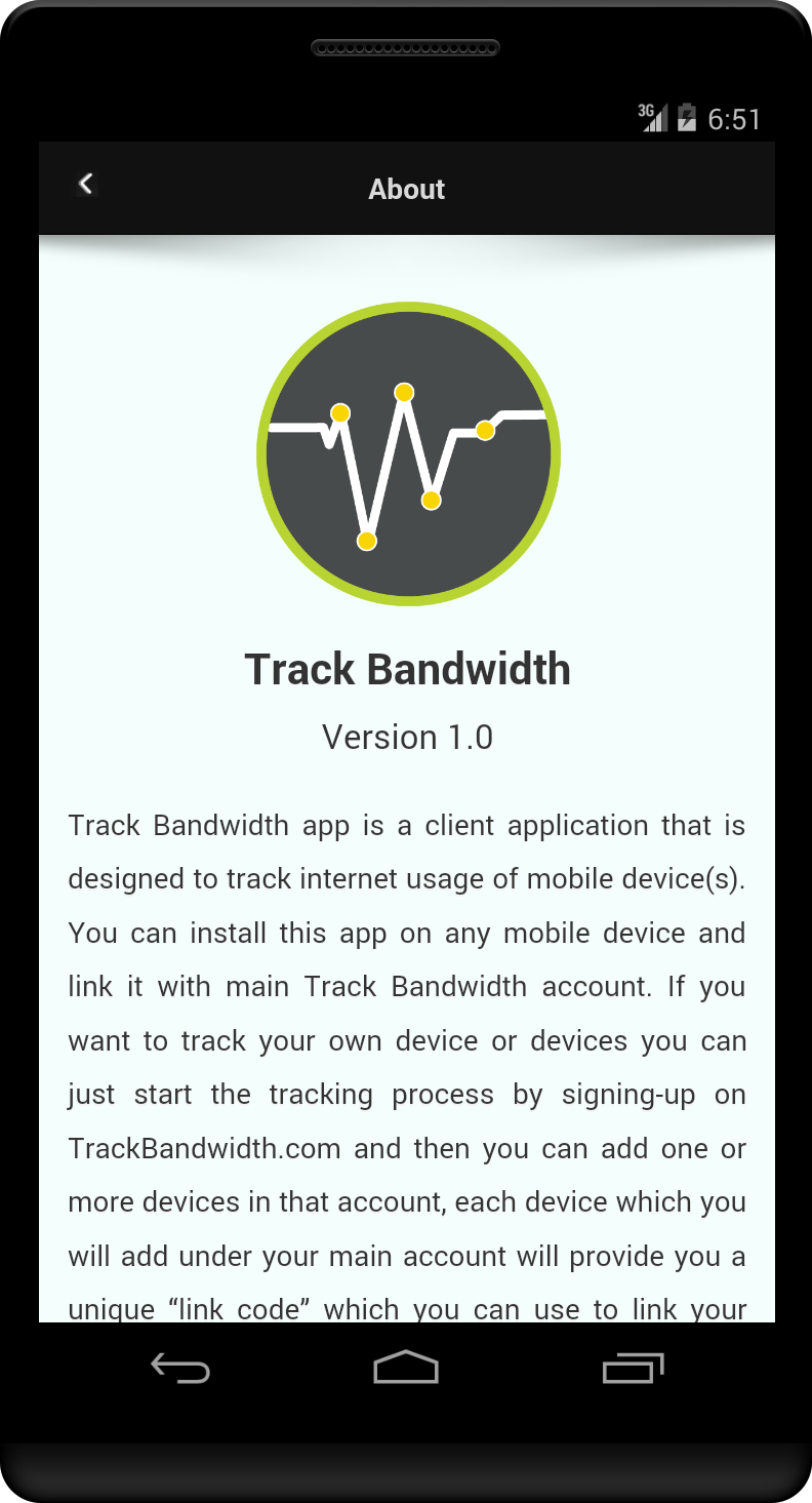 In the era of smart phones internet usage has increased dramatically and internet is not something that is free or unlimited, that is why internet usage or bandwidth tracking is essential, especially when multiple users use single or shared internet connection on their devices. Few examples: a) An Organization (Where multiple employees use same internet connection, especially those organizations which belongs to internet, like software, web houses, web related businesses, etc… ) b) At Home (where single connection shared with all family members, for example… Husband, Wife, Kids and other family members) Basically, Track Bandwidth app is a client application which you can install on all the devices in which you want to track internet usage, it is very useful in order to get control of your internet bandwidth. It shows powerful reporting with the help of “Charts” and “Tables” where you can see who was online at what time and how much he/she has used your internet connection. To start this app to actually work, you have to link it with main Track Bandwidth account and after linking you can start tracking internet usage on your main internet account. If you do not have your account on TrackBandwidth.com yet, so you can create it form here http://www.trackbandwidth.com. - Track Bandwidth app can track Wi-Fi Data, Mobile Data (3G / 4G) separately or it can track both networks at the same time, it depends on the setting on main Track Bandwidth account. - Powerful Reporting “Hourly”, “Monthly”, “Yearly” and “Billing Month” report. - It can Track specific Wi-Fi usage only, so if same device connects with any other Wi-Fi for example in restaurant or somewhere else, so it will not include that usage detail in report. - Track Bandwidth app users can see his/her own usage report. - No need to start the app manually in order to tracking.