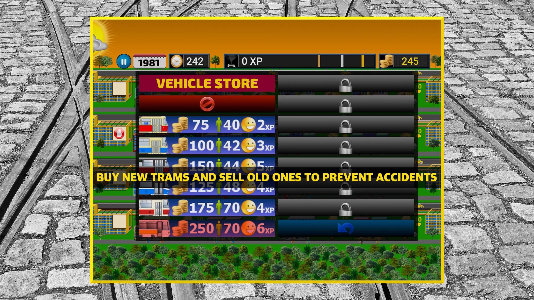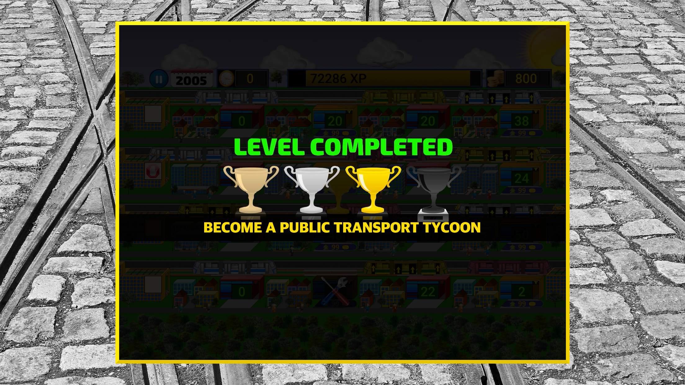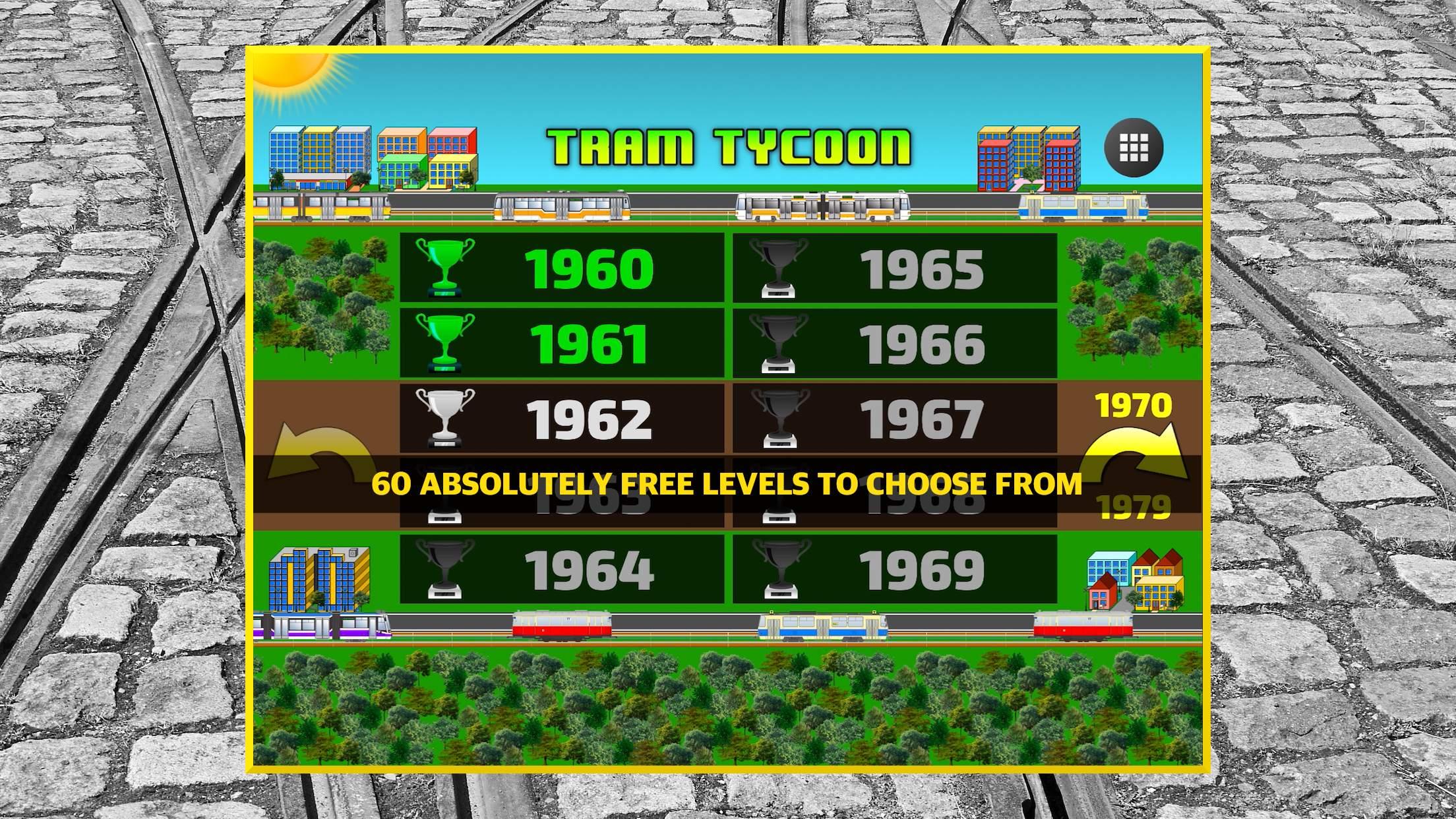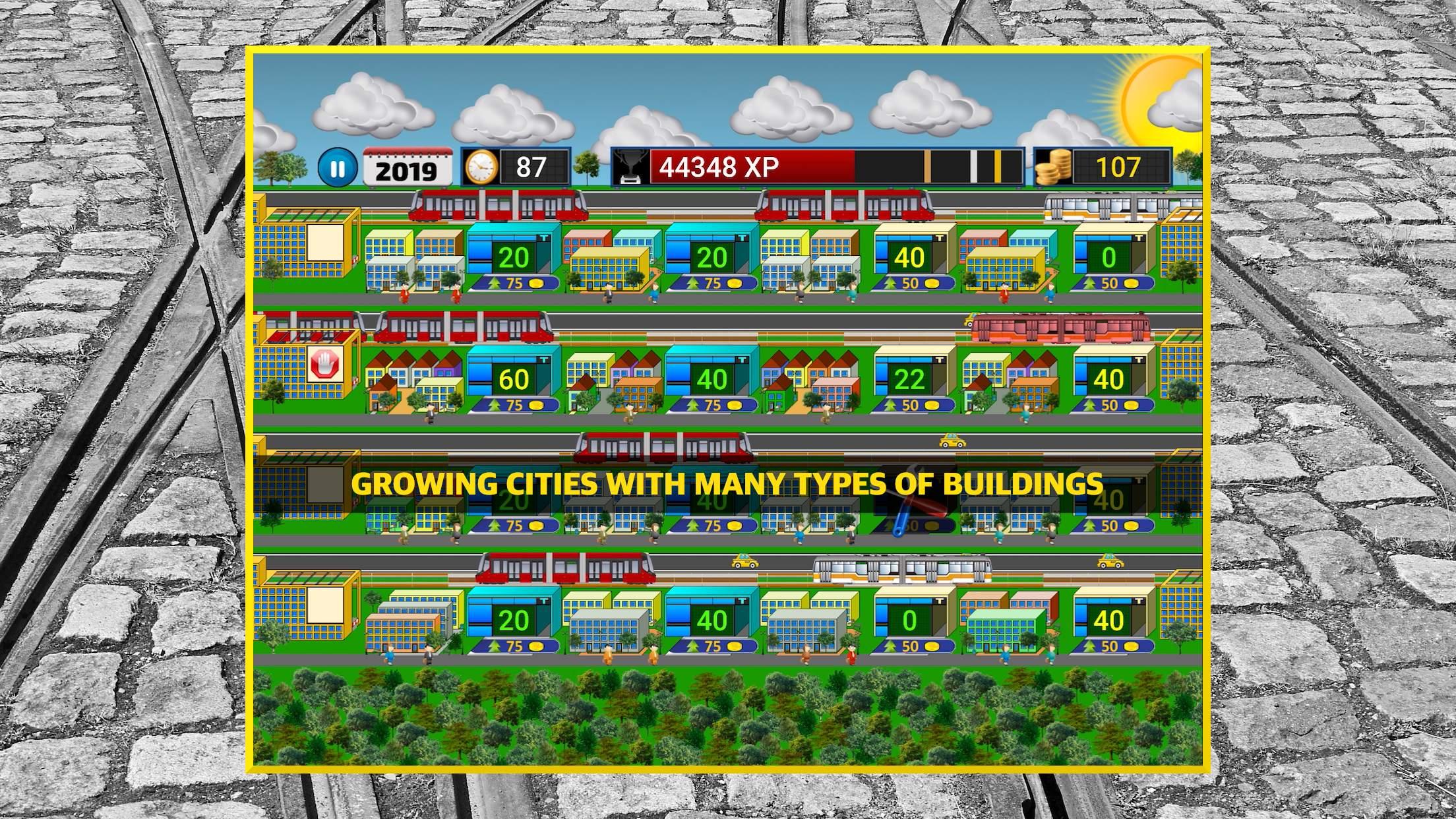 Tram Tycoon is a city railway transportation time management strategy game in which you have to transport as many citizens as possible before the time runs out (do not let them travel by a taxi). It is necessary to regularly buy new tram vehicles (electric city train vehicles), send them to an appropriate rail line, and sell them to replace old ones (accident prevention) to grow your pocket rapid transit business. Tram stops are also an indispensable part of the game. You will be responsible for building, repairing, and upgrading each city train station and of course for the budget of your virtual transport empire. Earn as many experience points as possible on each level before the time runs out. Every tram car has a different capacity and will give you a different amount of experience points for every transported passenger during service, so choose wisely what train to buy before each contract. GAME FEATURES: - 60 absolutely free levels to choose from - 14 tram models (from historic to modern) - Growing cities with many types of buildings - Go through tramway history from 1960 to 2020 - Day phases and different weather conditions - A quick, accessible, well explaining tutorial Set all cities in motion with trams and become a successful traffic giant!
