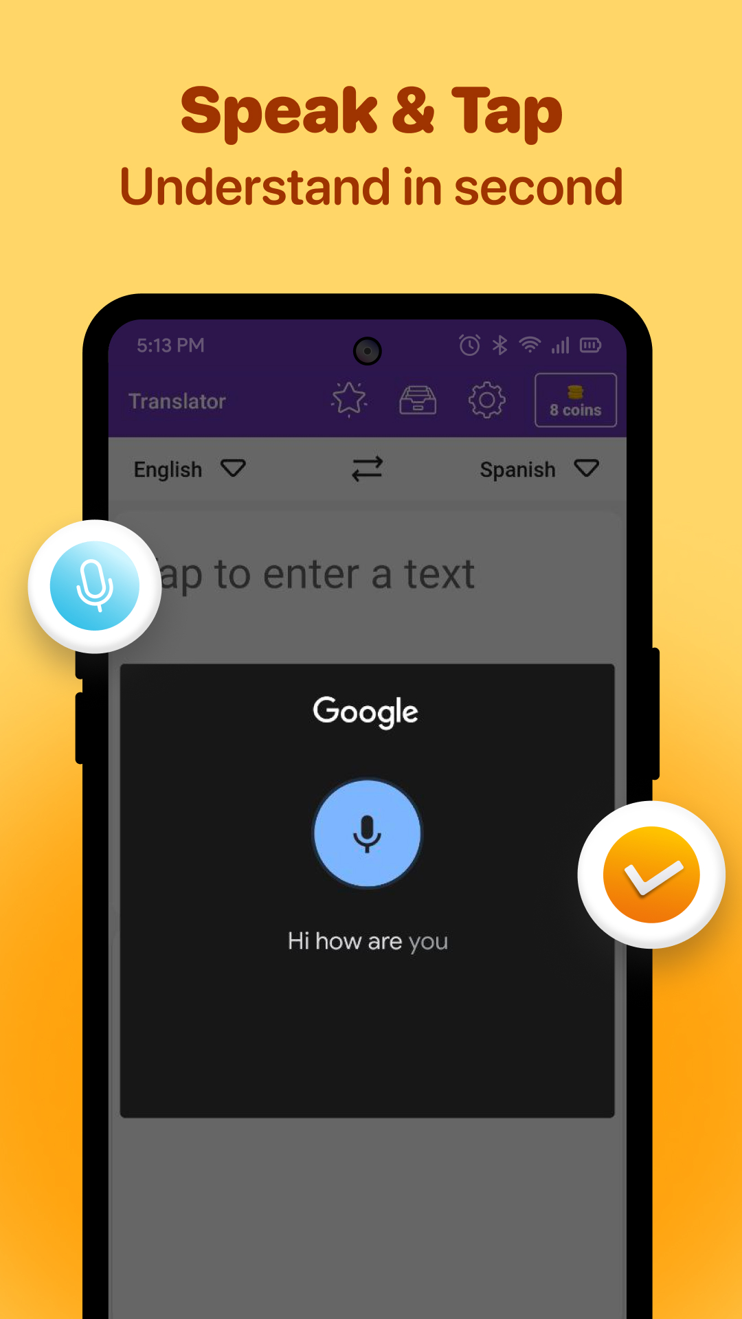 English - Spanish Language Translator App Free: Easily translate English to Spanish and Spanish to English in seconds with our free translator. You can just speak, and our AI will translate it automatically. Free English to Spanish Keyboard Translator App The Free English to Spanish Translator app has an AI voice-based translator feature. You can translate English to Spanish, and Spanish to English by just talking to your phone. the app will detect the English or Spanish words and phrases you are saying and automatically translate and provide you the result It's Simple - English to Spanish Voice Translator This easy English to Spanish translator is designed for anyone who needs a fast and accurate translator. Whether you are using the voice translator for conversations or copying a text and pasting it in the app, you’ll receive instant English to Spanish translation or Spanish to English translation Struggling to understand a Spanish or English book or document? Our text and voice translator free for quick English to Spanish translations or Spanish to English translations. It works seamlessly with any text or voice inputs, ensuring you never get stuck again Voice Translator App – Unique Features for Accurate Translation Our English to Spanish translator free app comes packed with unique features designed to enhance your translation experience, you have multiple options to translate—use the voice translator, text translator, or simply copy and paste. The results are fast, reliable, and accurate. Use our text, audio, or voice translator app to get reliable Spanish to English translations or English to Spanish translation The voice recognition in our app makes it easy to convert speech into translated text. This feature is ideal for anyone needing to conduct regular conversations or business discussions in English and Spanish Practice Pronunciation – Learn Spanish and English with Ease Our English to Spanish translator app also allows you to practice pronunciation for both languages. With the speak button, you can improve your ability to speak both English and Spanish clearly and accurately. The app uses advanced voice input and voice output features to make sure your pronunciation practice is top-notch, helping you master both languages faster. Whether you’re practicing for school, travel, or work, this tool will help you sound like a pro! Learn and Translate – The Ultimate Bilingual Learning Tool Start learning and translating today with this all-in-one language learning app! This tool is the perfect companion for anyone wanting to learn to speak Spanish or improve their Spanish-English translation skills. Whether you're a beginner or advanced learner, this app will help you navigate through words, phrases, dialogues, and even grammar explanations It’s ideal for learners who want to boost their vocabulary, improve their conversation skills, discover new words, sentences, and Spanish grammar explanations in an interactive way. The exam will make your learning journey both enjoyable and effective Key Features: ✔️ Translate English to Spanish with voice recognition ✔️Copy and paste text for quick and efficient translation ✔️Spanish Conversation Practice ✔️Improve your Spanish and English pronunciation ✔️Bilingual Translation ✔️Access past translations in your search history for quick reference ✔️Instant translations results ✔️Easily share your translations ✔️English to Spanish Dictionary ✔️Traductor de Inglés a Español Gratis ✔️Diccionario Inglés Español ✔️Aprender a hablar inglés ✔️Save your favorite words or phrases for easy reference and learning later ✔️ Perfect for travelers, students, and language learners Grab our Halloween offer translate & learn effortlessly, with the convenience of voice recognition, a dictionary, & ability to share translations easily. Make communication in Spanish and English smoother than ever with our Free English to Spanish Translator app
