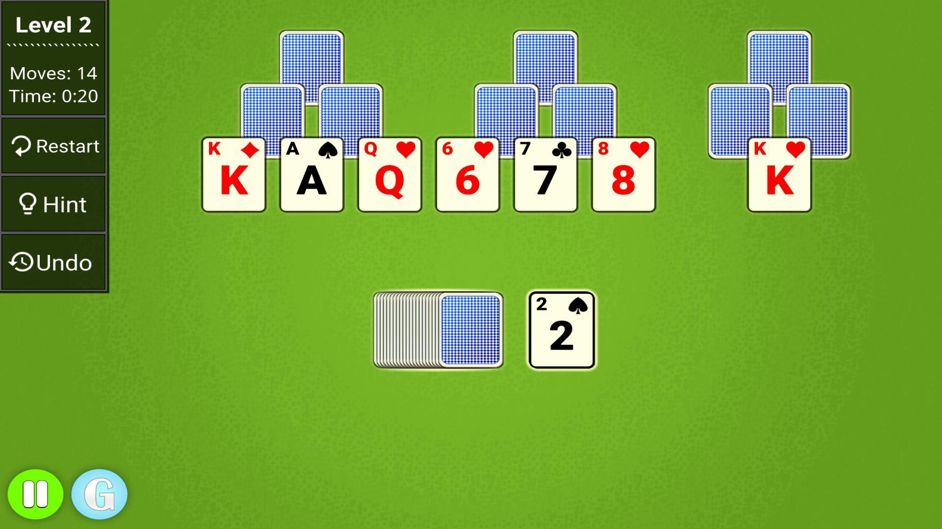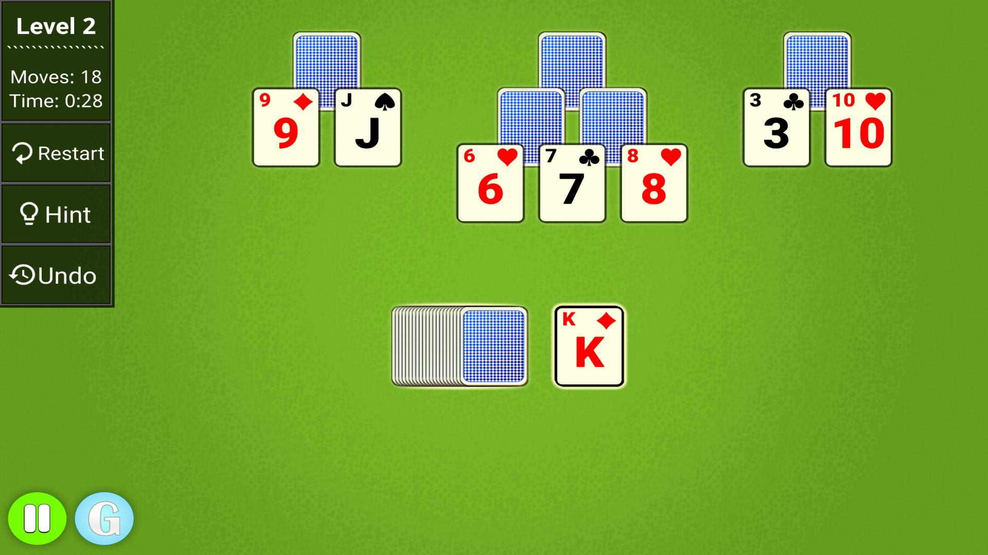 *** How to play ***- Match the top card from the waste pile with a card from the board that is one lower or one higher. Match as many as you can to clear the board.