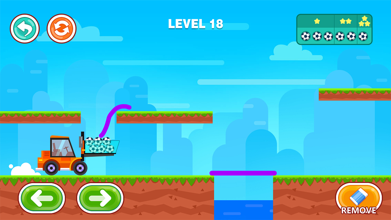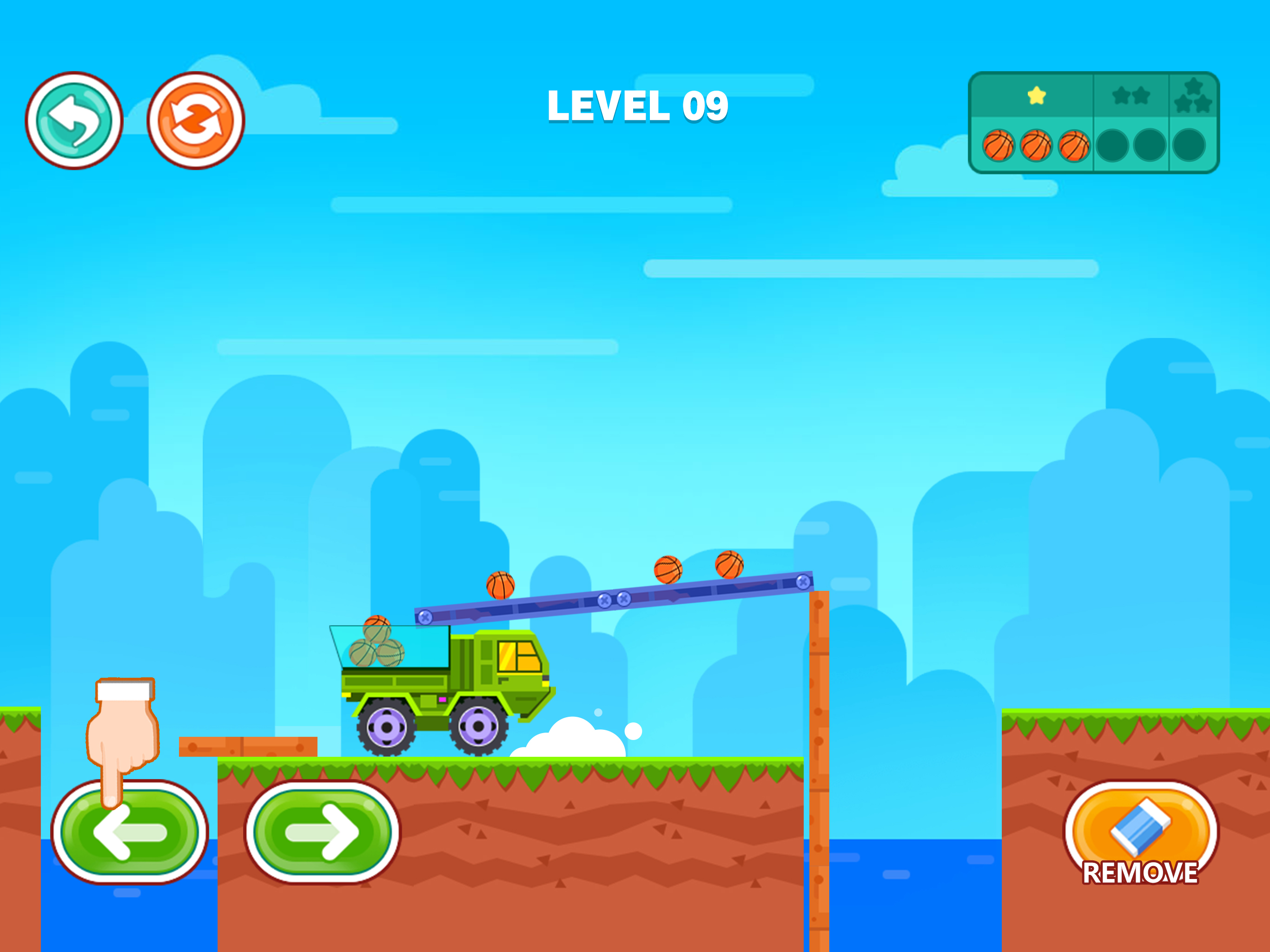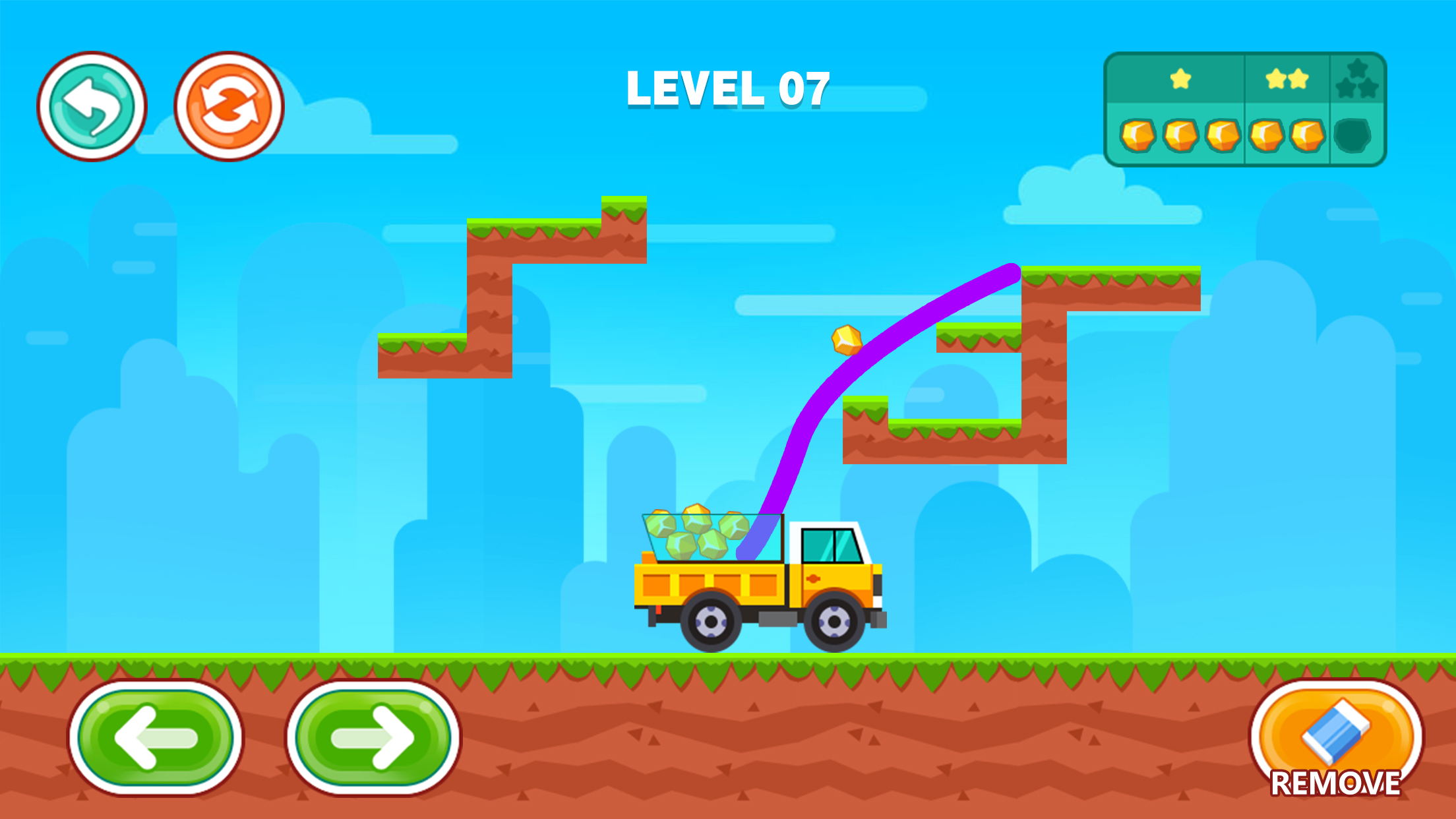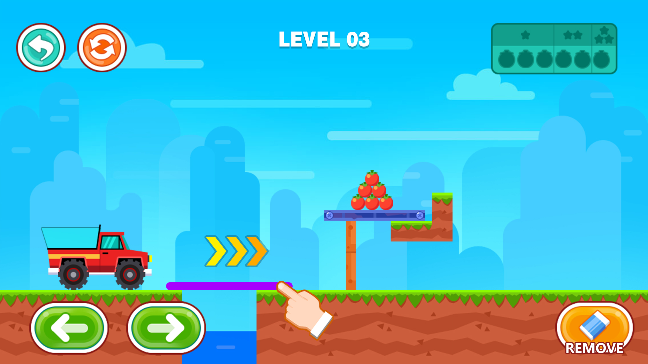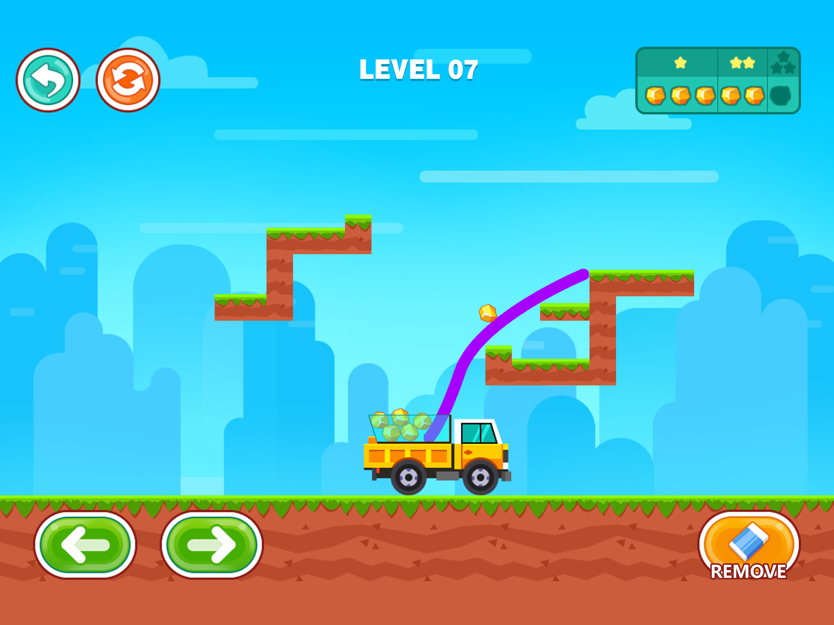 A game that draw lines to solve puzzles tests your brain! By drawing various shapes on screen to help the truck get through variety of landscpaes and load fruits and vegetables in truck. Take advantage of physical common sense you know to make your trip more successfully. What's more, just give the rein to your imagination and you will figure out more funny solutions in the same game level. When you are stuck, don't forget the key tips at the bottom of screen. Features -Build bridge, pave path...The drawing ways can be changing. -Truck, forklift and dump truck can be helpful -Practice your brain