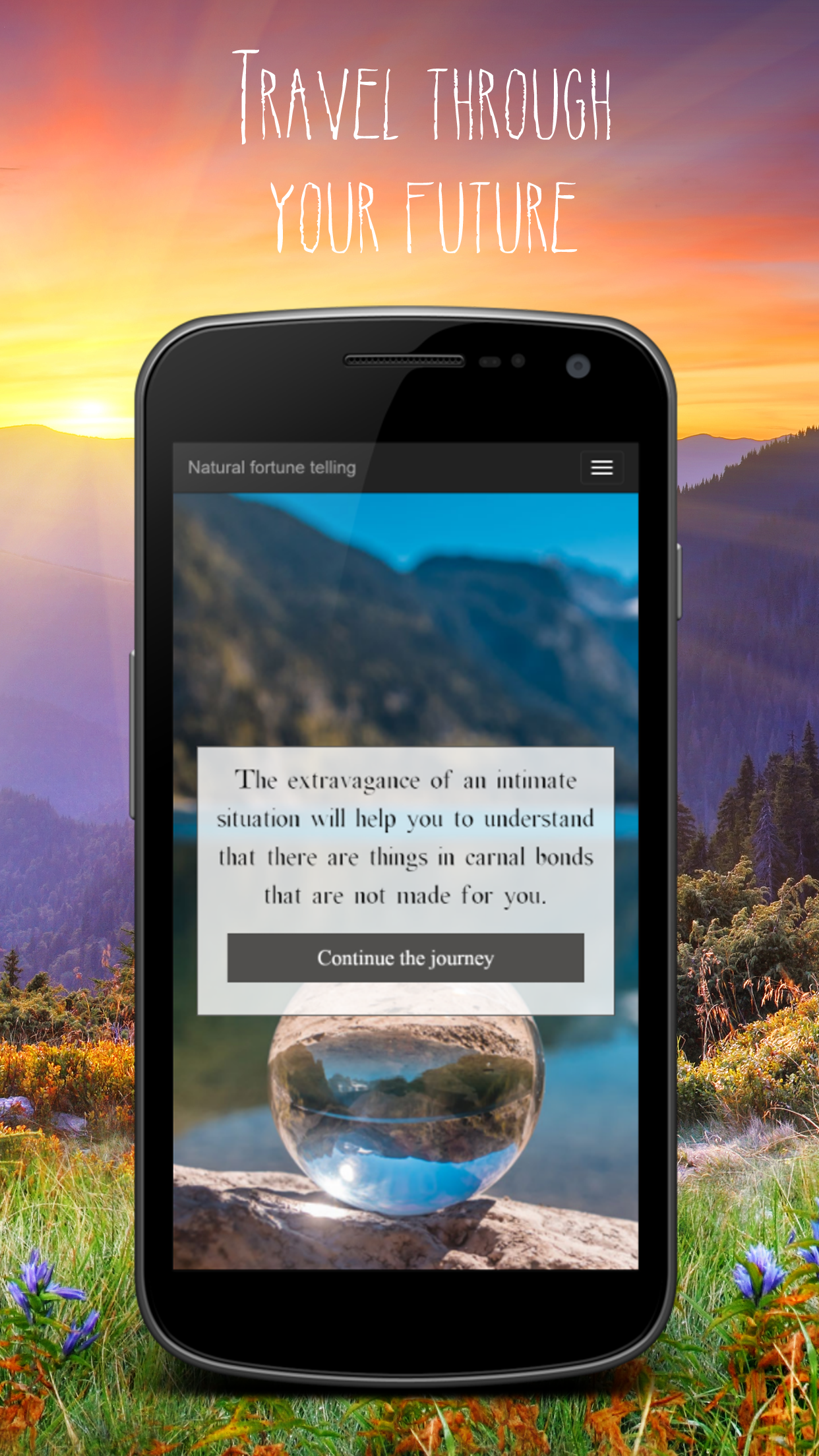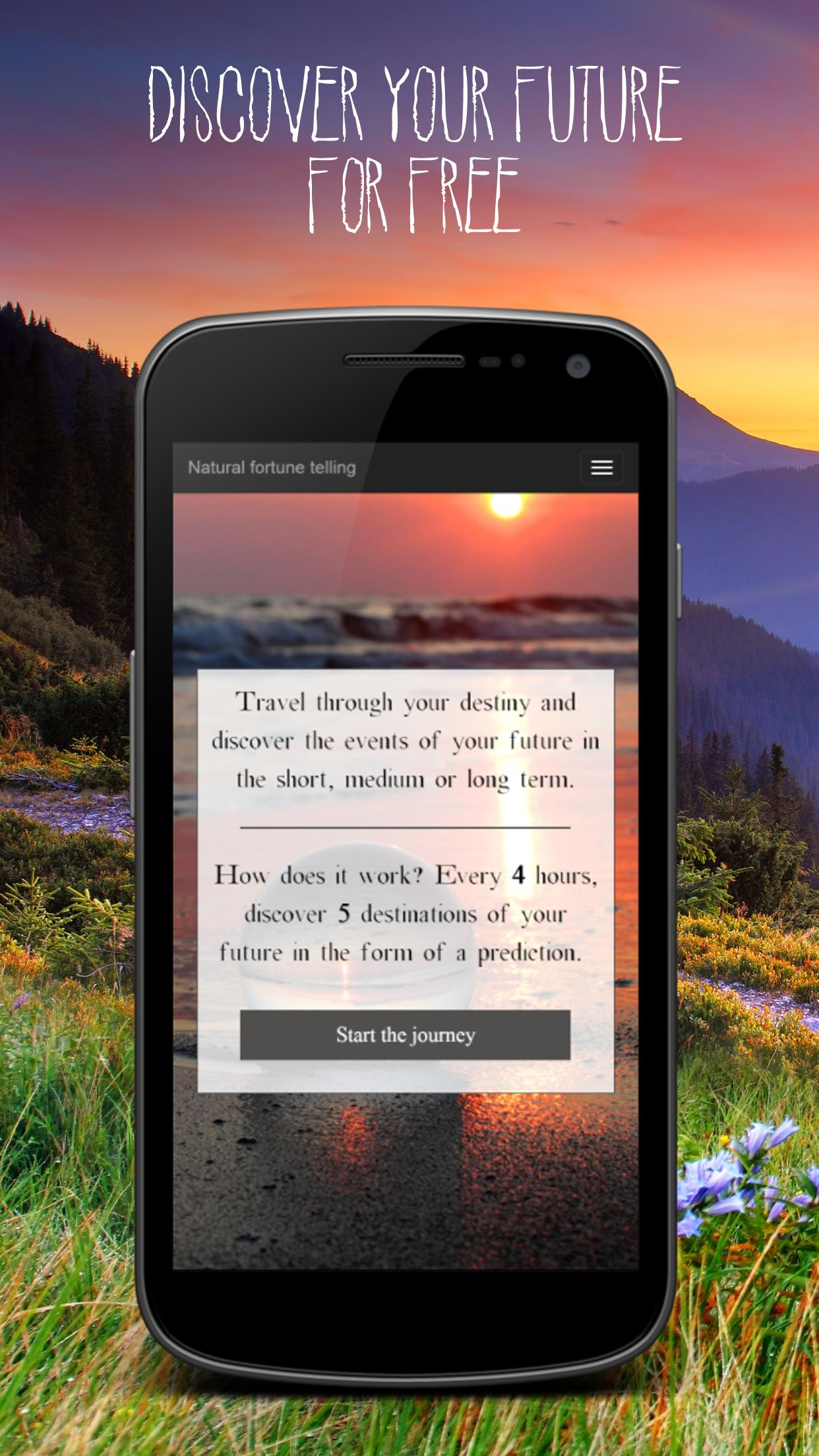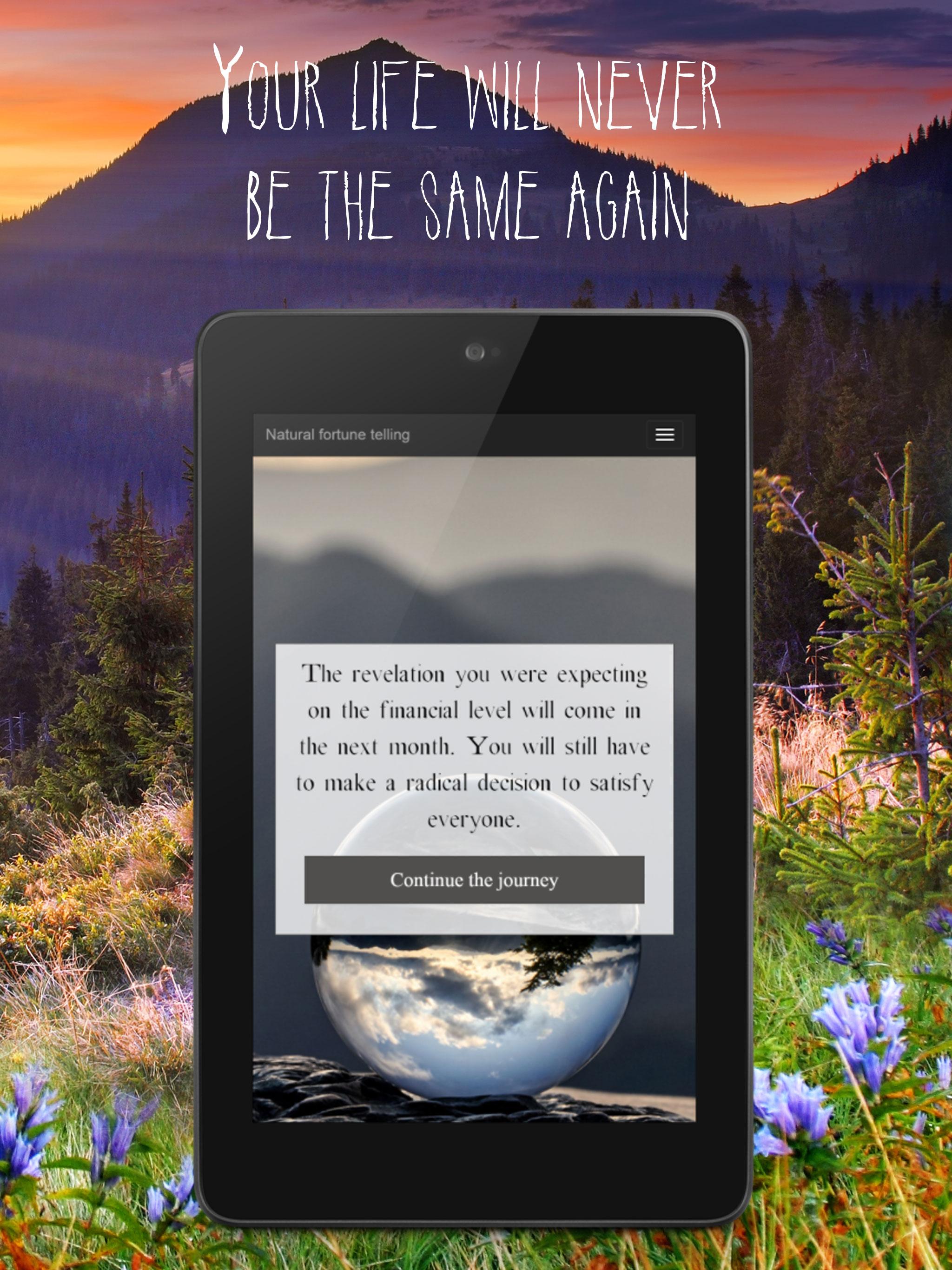 Really natural and real psychic readings ! This free fortuneteller application allows you to take a fascinating journey through your future and destiny. Thanks to the combined power of the crystal ball and the forces of nature, you will obtain a clear vision of your future, 100% natural and true. Your destiny is intrinsically linked to that of the planet Earth. It is for this reason that listening to it gives this psychic readings app an extraordinary ability to read the events that will punctuate your future life. Letting this free energy invade you is probably one of the best ways to stay in touch with yourself today. This application will help you do that. The natural fortune telling that uses the planet's natural vectors is undoubtedly the purest, most powerful that exists. You will get truly powerful and true psychic readings. This journey will simply take place through our ball of vision that will explore your destiny. Choose a direction without thinking, and the application will reveal one of its natural readings, yours. You will be able to navigate from step to step, 5 times every 4 hours, until all energies are fully recharged. If you have doubts, fears, questions about your love life, fears or if you don't know where you stand in this over-urbanized world, then this application will be right for you. It's free and you'll get more than answers because this fortune teller will be a guide for you.