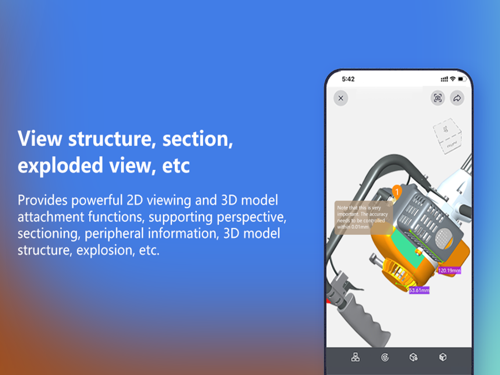 It supports quick viewing of more than 40 kinds of 3D models and 2D CAD drawings on mobile phones or PC, such as SolidWorks, Creo, NX, CATIA, inventor, solid edit, step, IGES, STL, DWG, DXF and DGN.