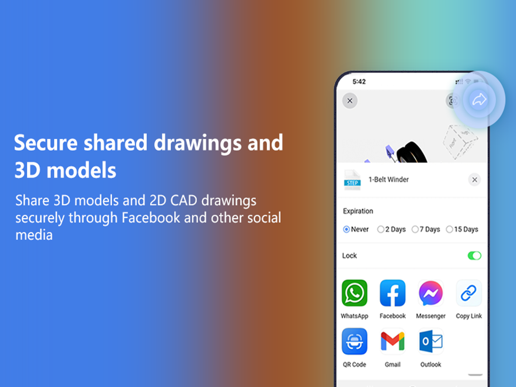 Share 3D models and CAD drawings stored on mobile phones, computers to others with one click, and provide [public sharing] and [encrypted sharing]. Encrypted sharing can set access password, validity period, access times, viewing authority, etc., so as to realize secure sharing.