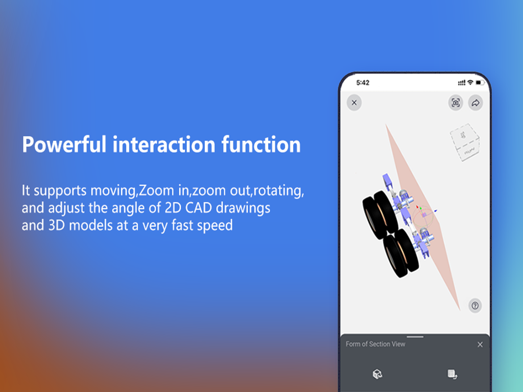 It supports moving,Zoom in,zoom out,rotating,and adjust the angle of 2D CAD drawings and 3D models at a very fast speed.