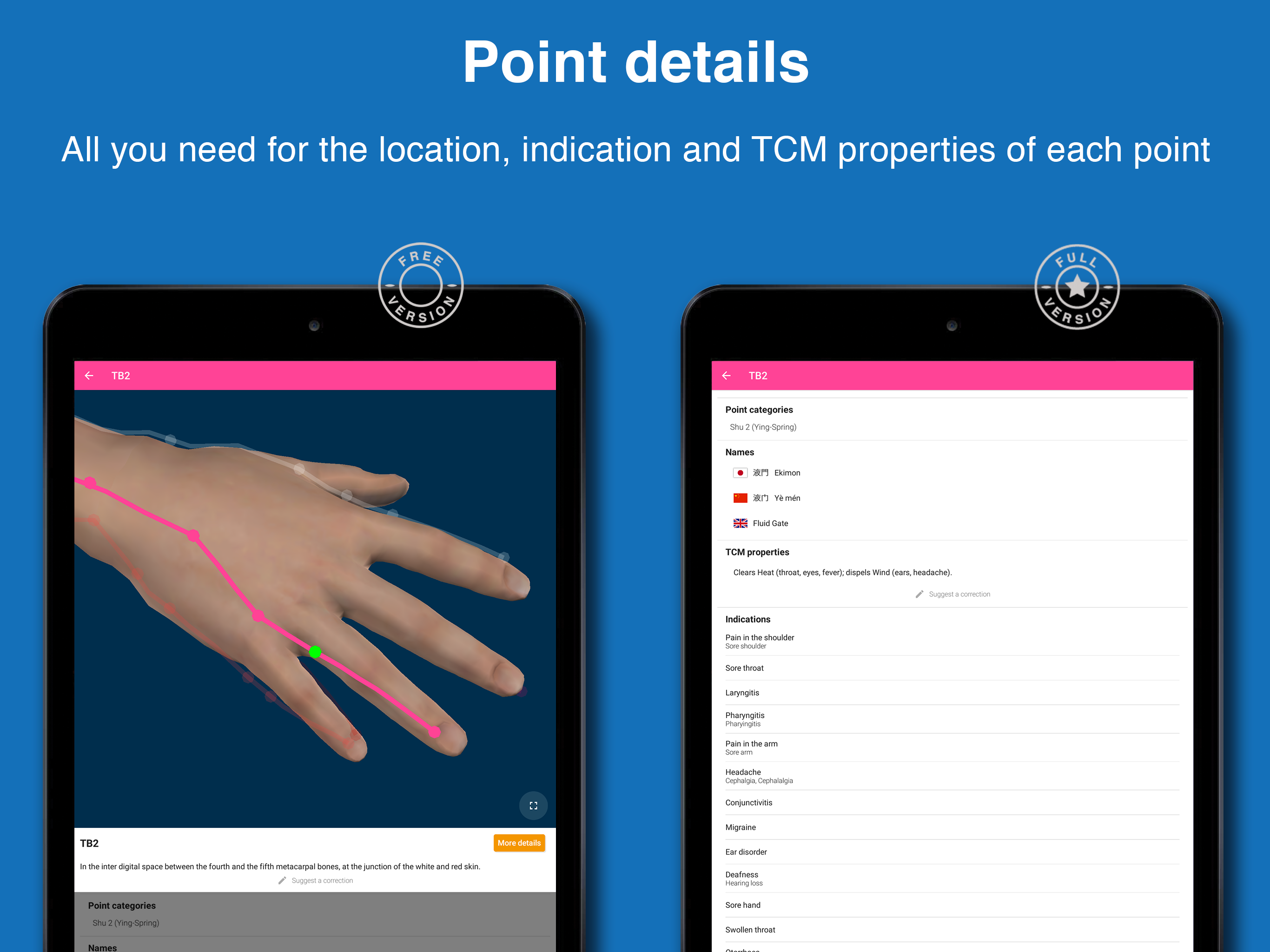 This app will be useful to students and therapists of acupuncture, shiatsu (Koho, Masunaga, Ohashi, etc), acupressure, tuina, digitopressure, digitopuncture, Traditional Chinese Medicine, kinesiology, reflexology, Qi Gong and more. If you miss relevant information for your technique, please tell us: http://www.tsubook.com/contact
