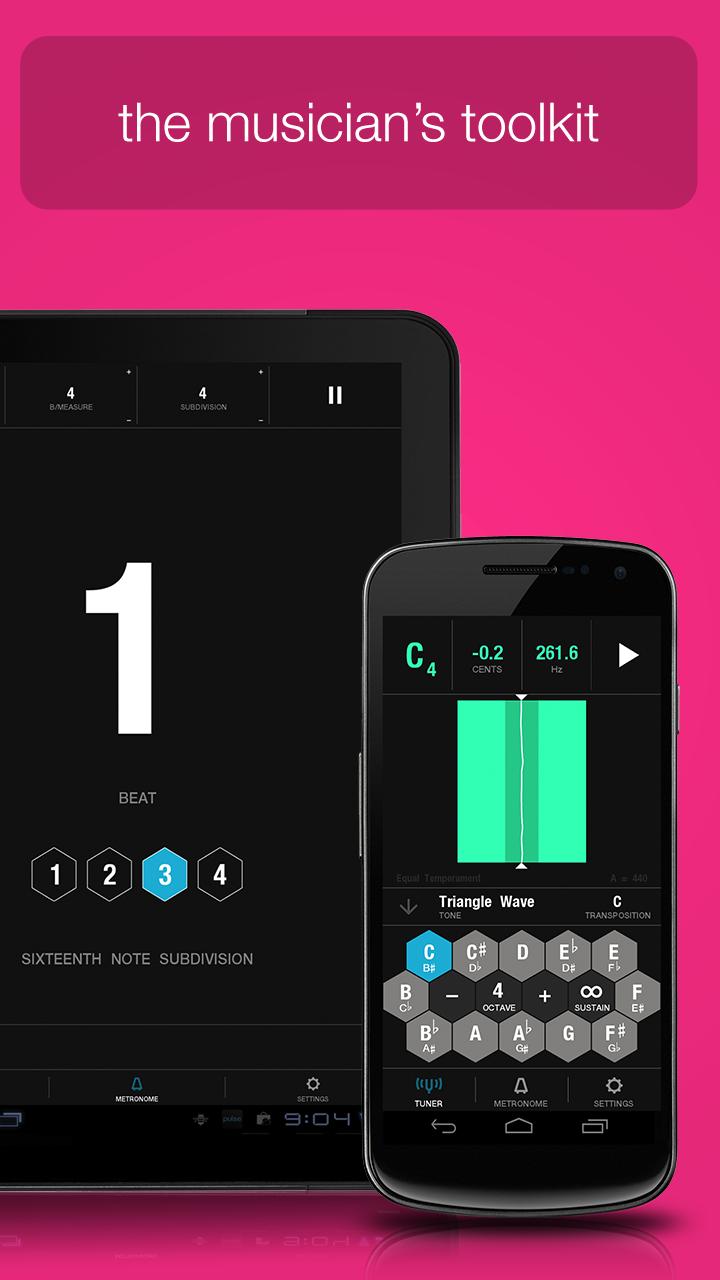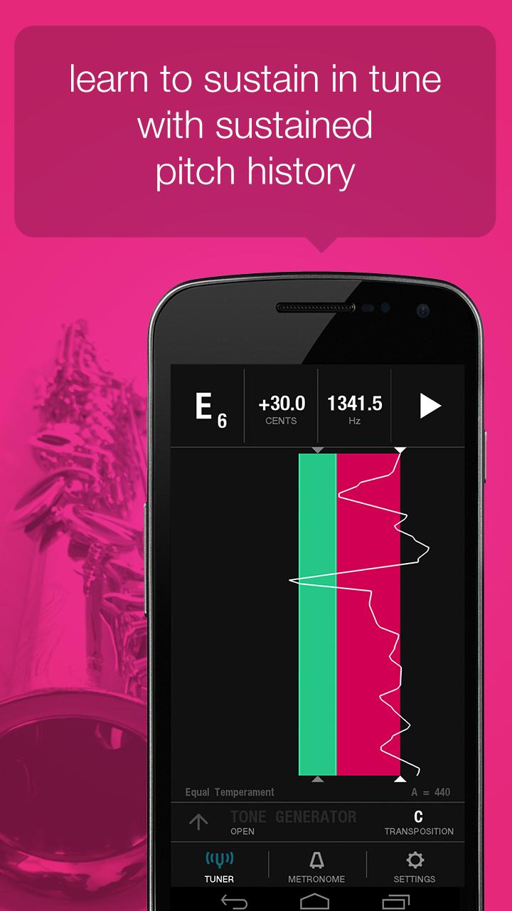 From the creators of NodeBeat comes Tunable, the most intuitive visual toolkit for musicians. Tunable is a chromatic tuner, tone/chord generator, metronome, and recorder that helps you learn to play steadily, in tune, and on beat. Featuring a unique “tuning history” display for visualizing pitch over time, Tunable is the perfect toolkit for beginning to professional musicians. ★ Learn to play in tune with sustained pitch history ★ Visualize how steadily you play or sing. As notes are held out, a white line draws how steady the pitch is. The straighter the line, the more consistent the pitch. ★ Improve your ear with tone and chord generator ★ Need a reference tone or chord? Use the tone and chord generator to play and sustain chords with various tone options. Choose from different temperaments to hear how they compare. ★ Keep tempo with an accurate and simple metronome ★ See the pulse with a visual metronome. View subdivision and current beat, with a large display and visual flash. ★ Record and share ★ Record your practice and performances. Add reverb for a professional sound. Share recordings through e-mail, SoundCloud, Dropbox and more. ★ Features ★ Tuner • Large, colorful tuning indicator clearly shows when in tune (green fills the screen) • Clear, visual tuner with note, octave, cents (+\-), and frequency (hz) display • Tuning history to see how well you’re sustaining notes over time • Especially suited for wind instruments and strings with note detection from Tuba to Piccolo (24hz to 15khz+) • Horizontal and vertical tuning displays • Adjustable A=440 reference tone • Change between equal, just, pythagorean, and 18 other tuning temperaments Tone and Chord Generator • Chromatic Tone Generator with multiple tone options and sustain • Play and sustain chords • Auto Octave rounding for easy note access Metronome • Large number display with visual flash to see the downbeat, subdivision, and pulse • Adjust tempo, beats per measure, and subdivision • See tempo markings to quickly jump between standard tempos • Tempo Tap (tap metronome center to set a tempo) • Continues to play when screen is locked or in the background Record • Record and save unlimited recordings • Share recordings through e-mail, SoundCloud, DropBox, and more Other • Highly accurate (1/100 of a cent) and responsive • Transpose notes to any instrument • Dark and light themes Tunable is a great tuner and works especially well for tuning wind and string instruments such as: • Guitar, Ukelele • Piccolo, Flute • Oboe, English Horn, Bassoon • Eb, Bb/A Soprano Clarinet, Bass Clarinet • Soprano, Alto, Tenor, and Baritone Saxophone • Trumpet and Cornet • French Horn • Tenor and Bass Trombone • Euphonium and Tuba • Violin, Viola, Chello, and Bass ______________________ ★ ★ ★ NOTE ★ ★ ★ The current version of Tunable for Android does NOT include practice stats (ie. practice score, note cents display, etc). The next version of Tunable for Android will take time to include these features. ★ ★ ★ PERMISSIONS ★ ★ ★ Tunable uses the Record Audio permission in order to listen and tune your instrument. Tunable also uses read and write access to your external storage in order to save and display recordings created within Tunable. ★ ★ ★ KNOWN ISSUES ★ ★ ★ On some devices, Google Assistant can interfere with the microphone. If the tuner does not appear to be working, try turning the "Ok Google" or "Google Assistant" settings "always-on" off to see if that solves the problem. This only applies to some devices and the device manufacturers are working on a solution. ______________________ For the latest updates and to connect with the Tunable community: • Follow @AffinityBlue on Twitter • Become a fan of Tunable on Facebook: www.facebook.com/AffinityBlue ★ ★ ★ Have a problem? Please contact us so we may help: apps[at]affinityblue.com. We can only fix problems we know about. ★ ★ ★