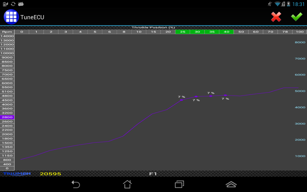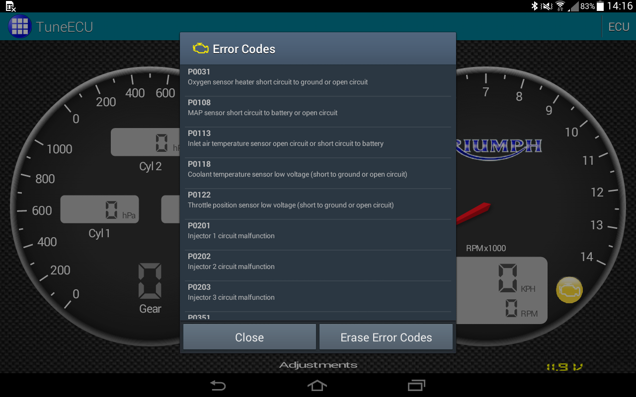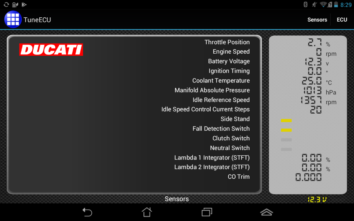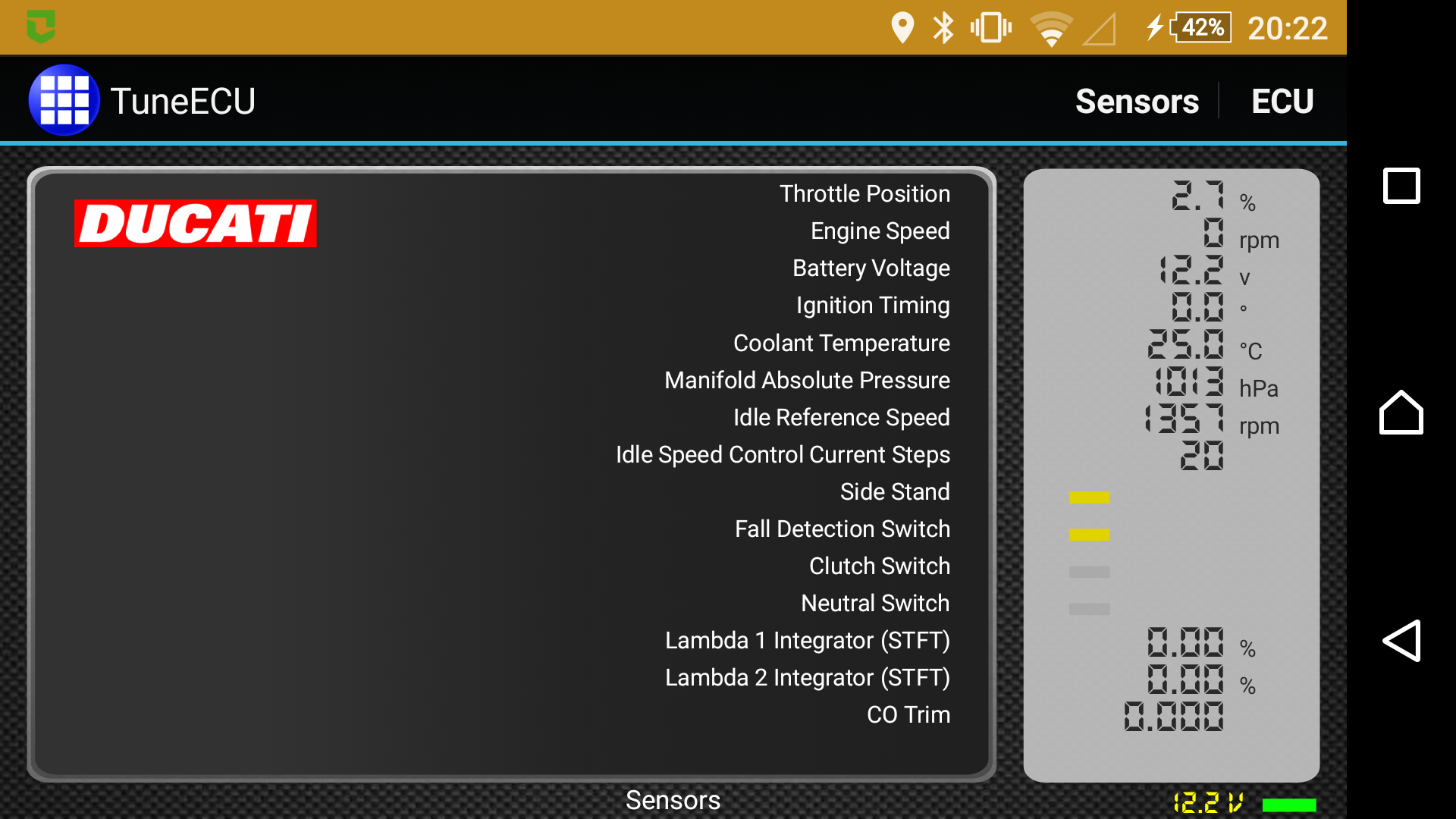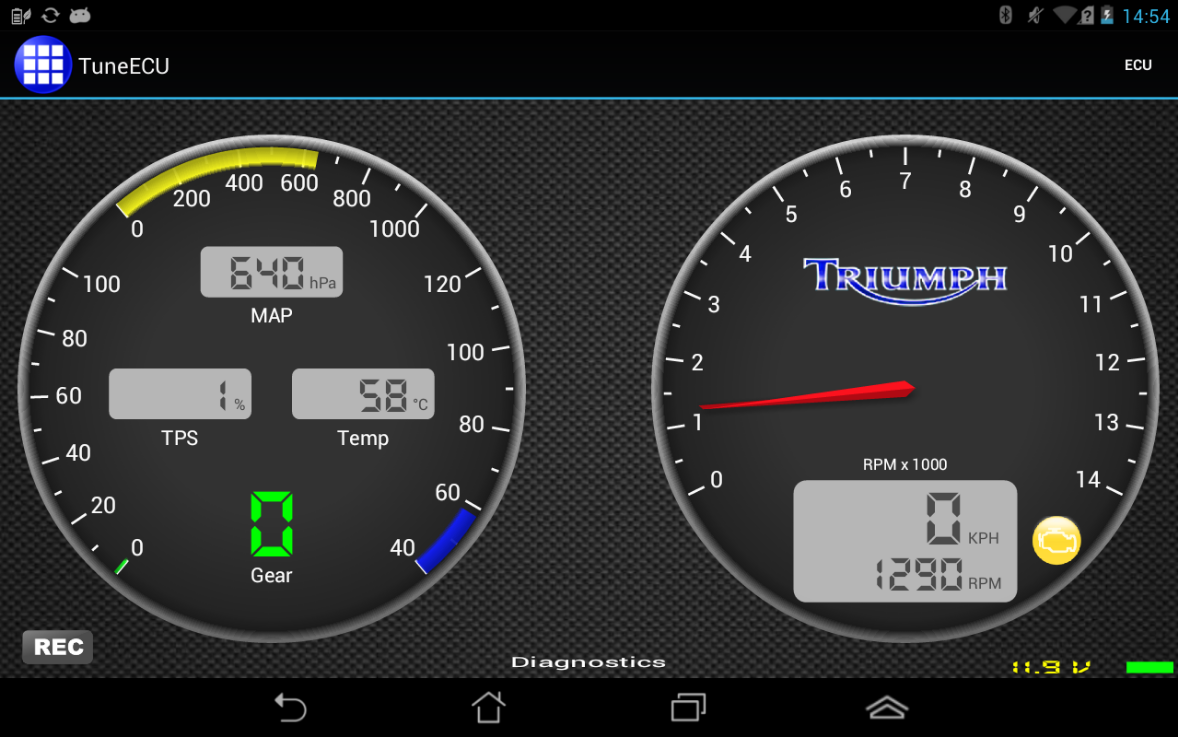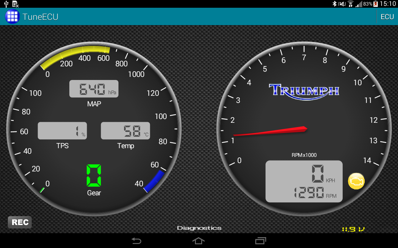 TuneECU is an application that allows reprogramming (1), diagnosis and test of the Engine Control Unit (ECU) of motorcycles Aprilia, Benelli, Ducati, KTM, Moto Guzzi, Triumph. This application requires an USB/OBD2 cable with FTDI chipset or a Bluetooth ELM327 adapter. *Warning* There are currently a lot of clone ELM327 adapters circulating that are not working with TuneECU, you must use adapters recommended for TuneECU (2). (1) https://tuneecu.boards.net/thread/493/bikes-list-compatibility (2) https://tuneecu.boards.net/thread/494/bluetooth-adapter It is highly recommended to visit the site http://tuneecu.boards.net before using this application.