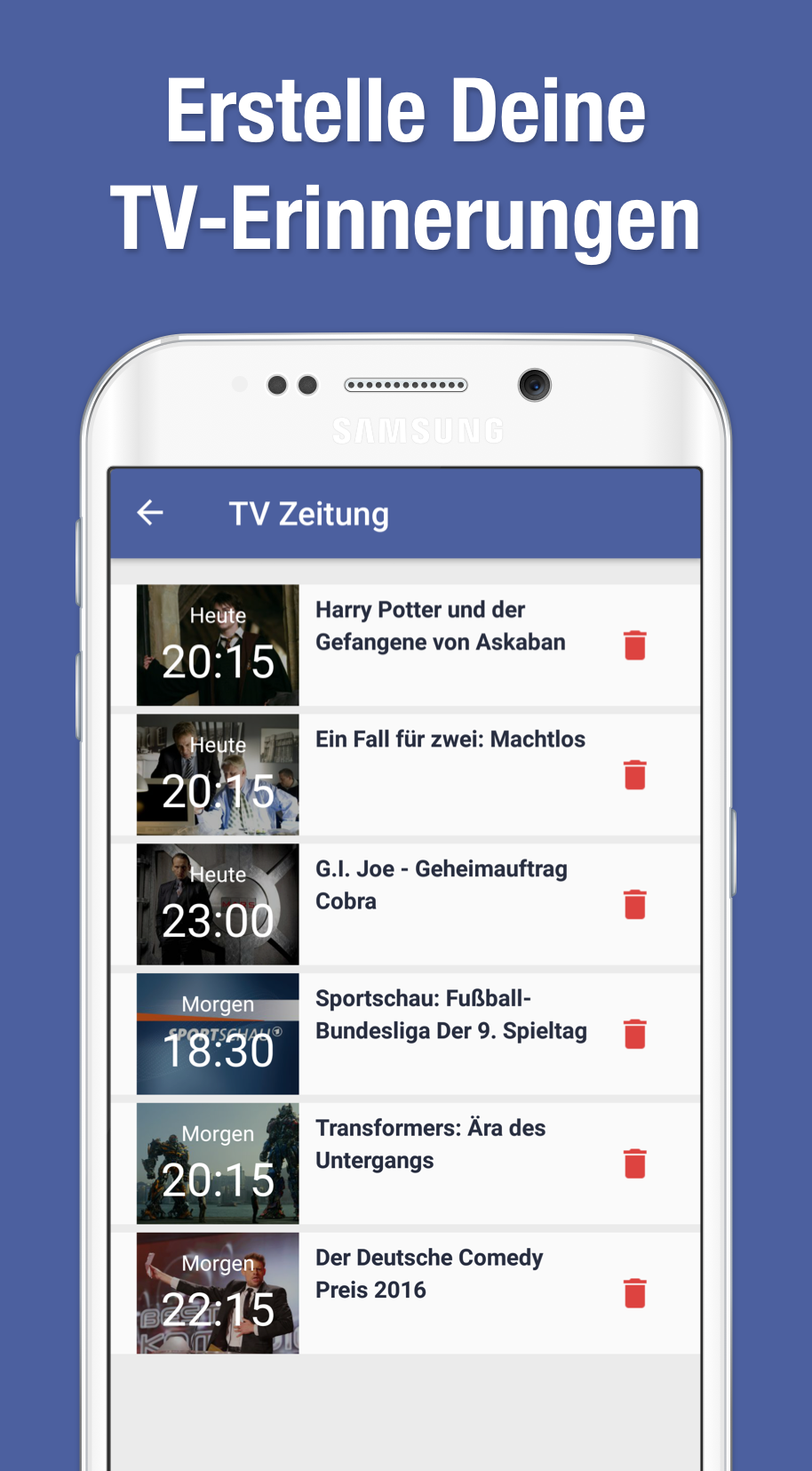 Set RemindersSetting reminders makes sure that you will never again miss your favorite shows, no matter if it's crime shows like Tatort, Polizeiruf, Midsomer Murders or CIS, news programs like Tagesschau or heute, sport events like the German Bundesliga, Formula 1 or Boxing, sitcoms like How I Met Your Mother (HIMYM), The Big Bang Theory (TBBT) or Two and a Half Men (TAAHM) or motion pictures, TV shows, documentaries, talk shows, reality shows or gossip news.