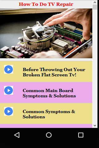 TV Repair Guide This is the most comprehensive do it yourself guide All the TVs repair tips, service manuals or repair guide and also the manufacturer training manuals & much more Learning how to repair your TV yourself can be a great exercise for you because it can save you a lot of money and perhaps even let you earn extra cash by doing the same service for others This App comes with expert level advice and information for those on a quest to learn, improve and excel in the field of electronics repair It can be useful for all skill levels— from novice to expert level technicians. The App continually gets updated with new info so you can be sure you’ll get up to date information as the technology moves ever forward With the right kind of information, learning how to repair televisions is no longer that hard for anyone willing to learn No need to go to formal TV repair schools to learn complicated theoretical concepts. All you need is some enthusiasm to learn, a computer, the right tools and the detailed step-by-step visual how to’s complete with schematic diagrams, TV repair and service manuals and hundreds of pages of information on different brands of TVs Get this App and become an expert in TV repair and troubleshooting within days