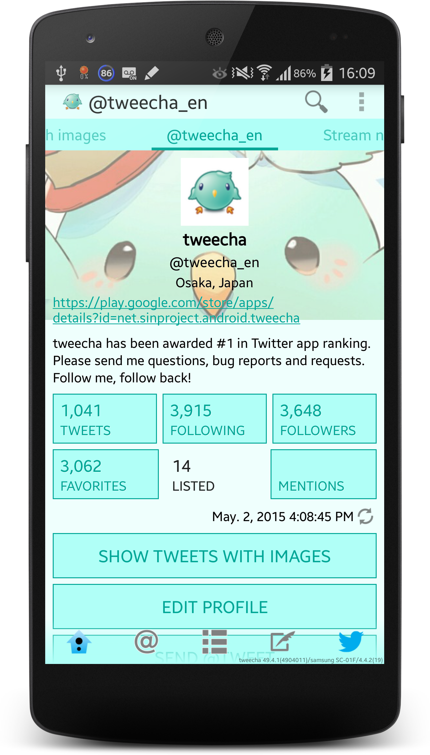 Tweecha Lite (Package Name: net.sinproject.android.tweecha.lite) is developed by sinProject Inc. and the latest version of Tweecha Lite for Twitter 77.1.3 was updated on January 17, 2020. Tweecha Lite for Twitter is in the category of Social. You can check all apps from the developer of Tweecha Lite for Twitter and find 23 alternative apps to Tweecha Lite for Twitter on Android. Currently this app is for free. This app can be downloaded on Android 4.0.3+ on APKFab or Google Play. All APK/XAPK files on APKFab.com are original and 100% safe with fast download.