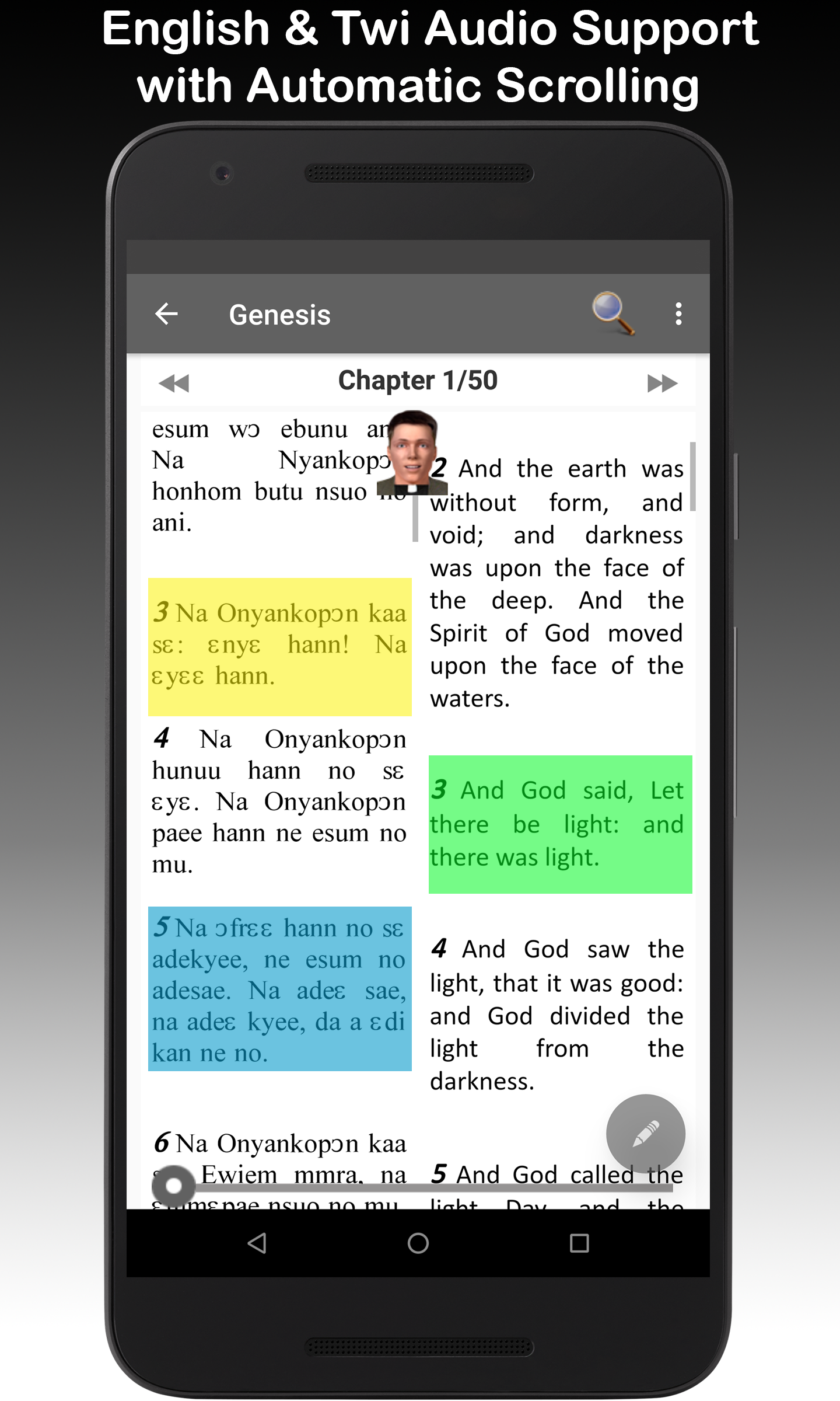 - Automatic scrolling feature allows the Bible to scroll automatically when audio is being played or read by the Kofi