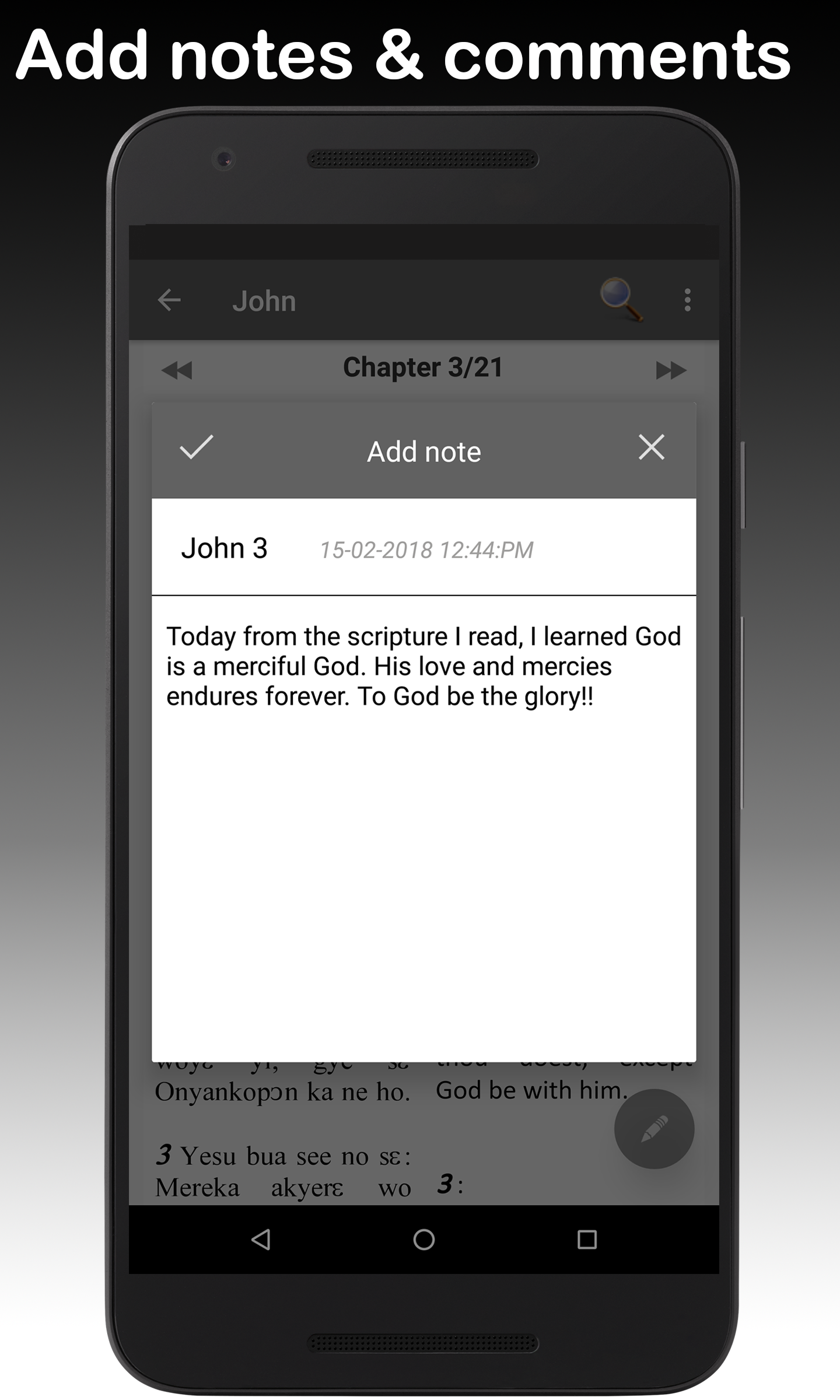 - Add your own commentaries, text notes, voice notes, sermons, and record preachings, sermons, songs, praise, worships, church services and personal notes