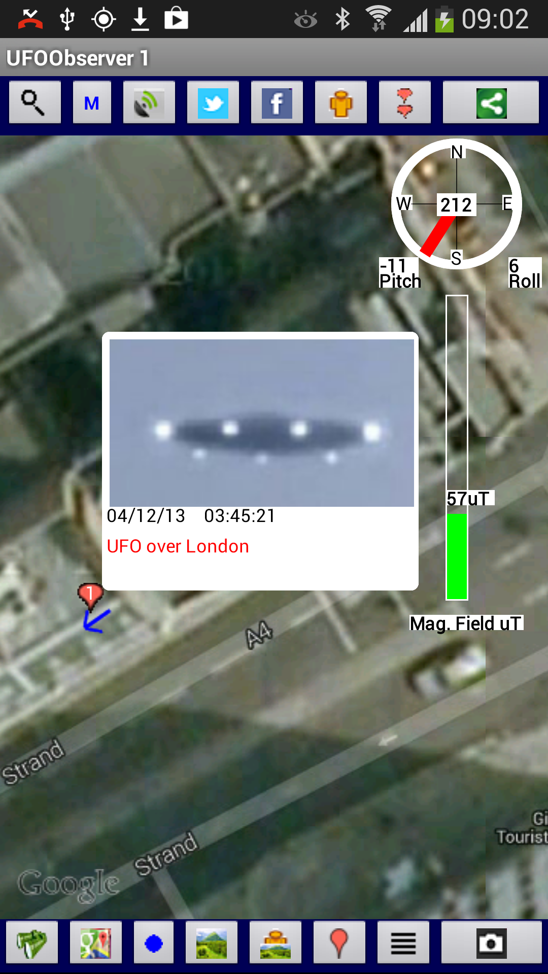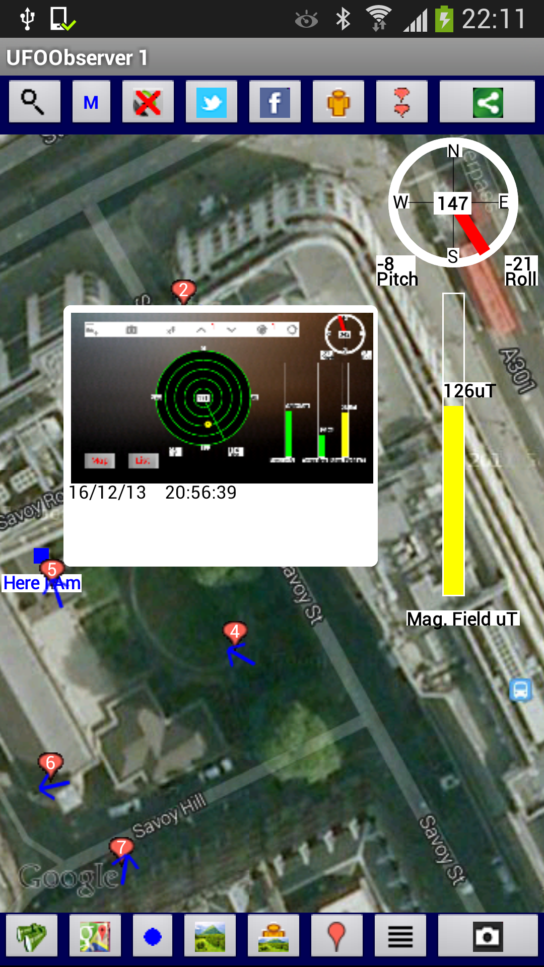 Sleep peacefully! knowing no entities, paranormal or aliens will be attempting to disturb or abduct you as this App will Alert you and scare off for good these intruders.The more people having this App, the more these entities will be deterred Select the screen icon on the SENSORVIEW SCREEN top bar to turn on NIGHT VISION. Select the flash icon on the SENSORVIEW SCREEN top bar to turn it into a TORCH. NEW - This has a new SENSORVIEW SCREEN recording continuously with a real time colour coded trace of the Magnetic Field on a grid as well MIN/MAX/TIME of Field Strength as well as the Directional Radar view,ready for instantaneous screen capture. FOR EXAMPLE - the magnetic trace above was obtained by moving the App around a laptop, with the RED peaks appearing where the Wifi Antenna was, in this case at the top of the screen. Try it, but not too close as the measurement (in micro Teslas) can go from normal background values ie 50 uT, to OVER A 1000 uT. It also has Alarm Sounds indicating when the Magnetic field reaches certain thresholds. Plus a new Filter Search feature on the Database LISTVIEW SCREEN. Pictures now display Magnetic Field Strength, Atmospheric Pressure and Temperature data in Map View. SENSORVIEW SCREEN now has Camera Zoom Slider and Picture Gallery display button (Pics). Now with new buttons Cam(Camera) and Vid(Video) on the SENSORVIEW SCREEN , to enable Pictures and Videos to be taken by the phones Camera. A Screen Grab can still be taken by pressing the Camera Icon on the top control bar of the SENSORVIEW SCREEN. Also the Pictures can be viewed in either an ImageView or Other (which provides a choice of the phones viewers). Welcome to the UFO/Ghost/Emf Detector App.. This App enables you to take and store Pictures/Videos of UFO's/Unusual Phenomena together with the Geo Location,Compass Direction,Camera Elevation/Tilt, Magnetic Field Strength, Atmospheric Pressure and Temperature data then display the location with image on a on a Google Map and in Google Street View. The Picture/Video can be shared along with the associated data through E-Mail, Facebook, Twitter, YouTube Bluetooth among others. Along with the Map View showing the location/images of your observations , there is a Sensor View which replaces the Map with a view from the Camera. Superimposed on the camera view are the Radar,Compass, Magnetic Field Strength (micro Teslas), Temperature (degrees Celsius) Atmospheric Pressure (milli Bars) and Camera Controls. (The Radar/Sensors/Sound can be removed/displayed by selecting the appropriate options from the the menu) When the App begins there are 7 separate databases to chose from. The default names are UFOObserverX, where X is from 1 to 7. The names of each database can be changed using the Config utility in the Map screen menu. This enables you to have 7 separate Observation projects. Along with the automatically saved data, you can enter your own observation notes in 8 Fields which can be named as you choose using the Config utility . The database can be E-mailed to a Computer where the data can be read in to an Excel Spreadsheet from a CSV file. A STREETVIEW Viewer also enables the selected database to be viewed in a combined Street/Map View on your computer in an Internet Explorer Browser, RADAR detecting direction/magnitude of Magnetic Sources with appropriate sounds/warnings/alarms. GRAPHS plotted of Magnetic Field Strength/Atmospheric Pressure and Temperature recordings Tested On Samsung s2 , S4 and S7 . The S4 has all the sensors required, other phones may not, and this will be indicated. Night Vision works better on S2,S7 in SensorView,( as shown in the final image showing a Fire Exit Sign in low light conditions), than the S4 and may vary from phone to phone in effectiveness. Although primarily used for observation of UFO/Unusual Phenomena, by using SensorView, unusual Environmental Conditions can be detected and Pictured/Videoed, eg unusual High Magnetic Field areas.