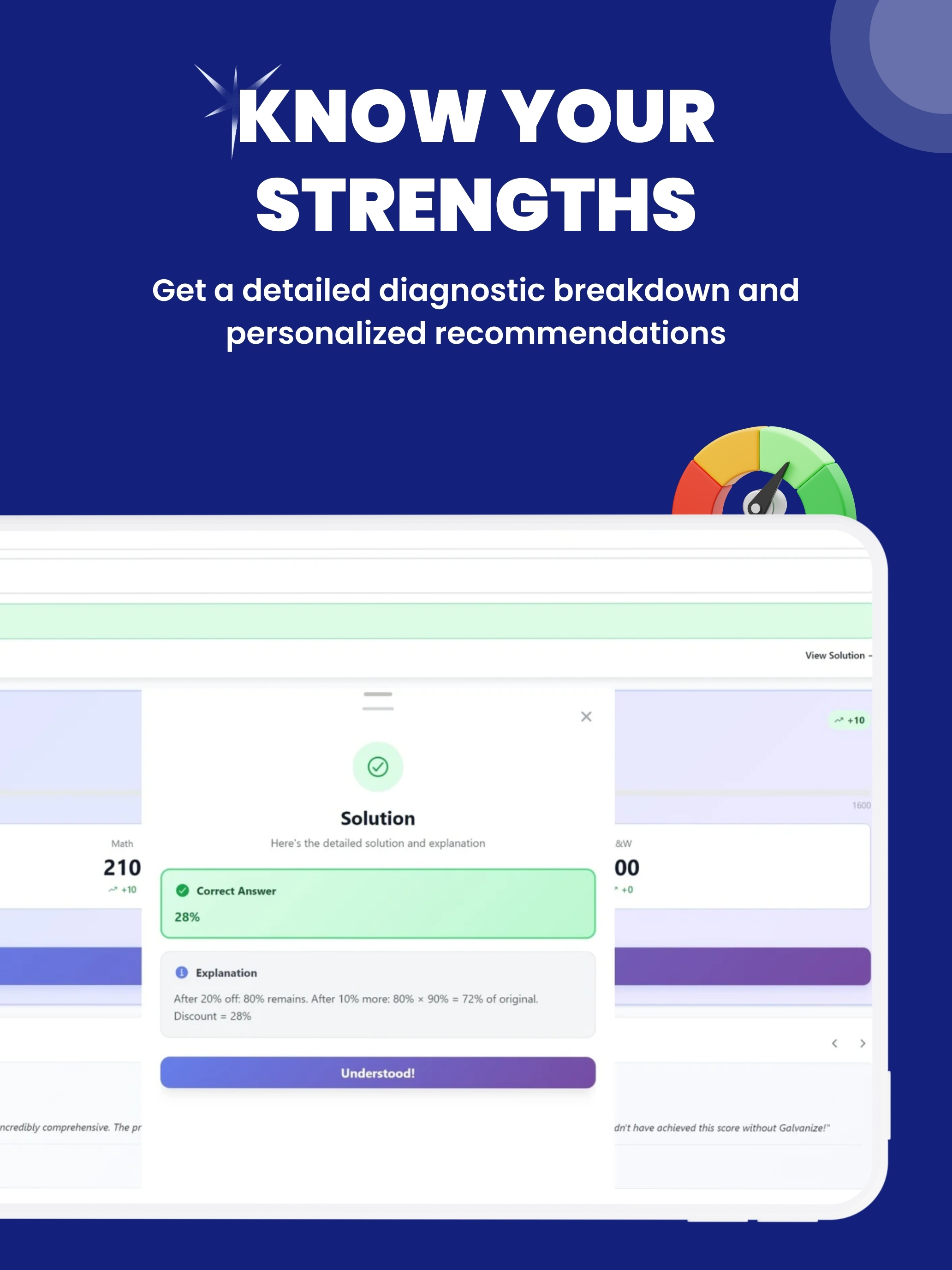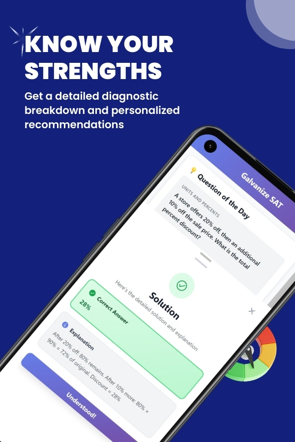• In-depth explanations During your SAT prep, all you need is a platform with crystal clear explanations to help you understand all concepts. Our SAT app is that platform. Never skip your question reviews.