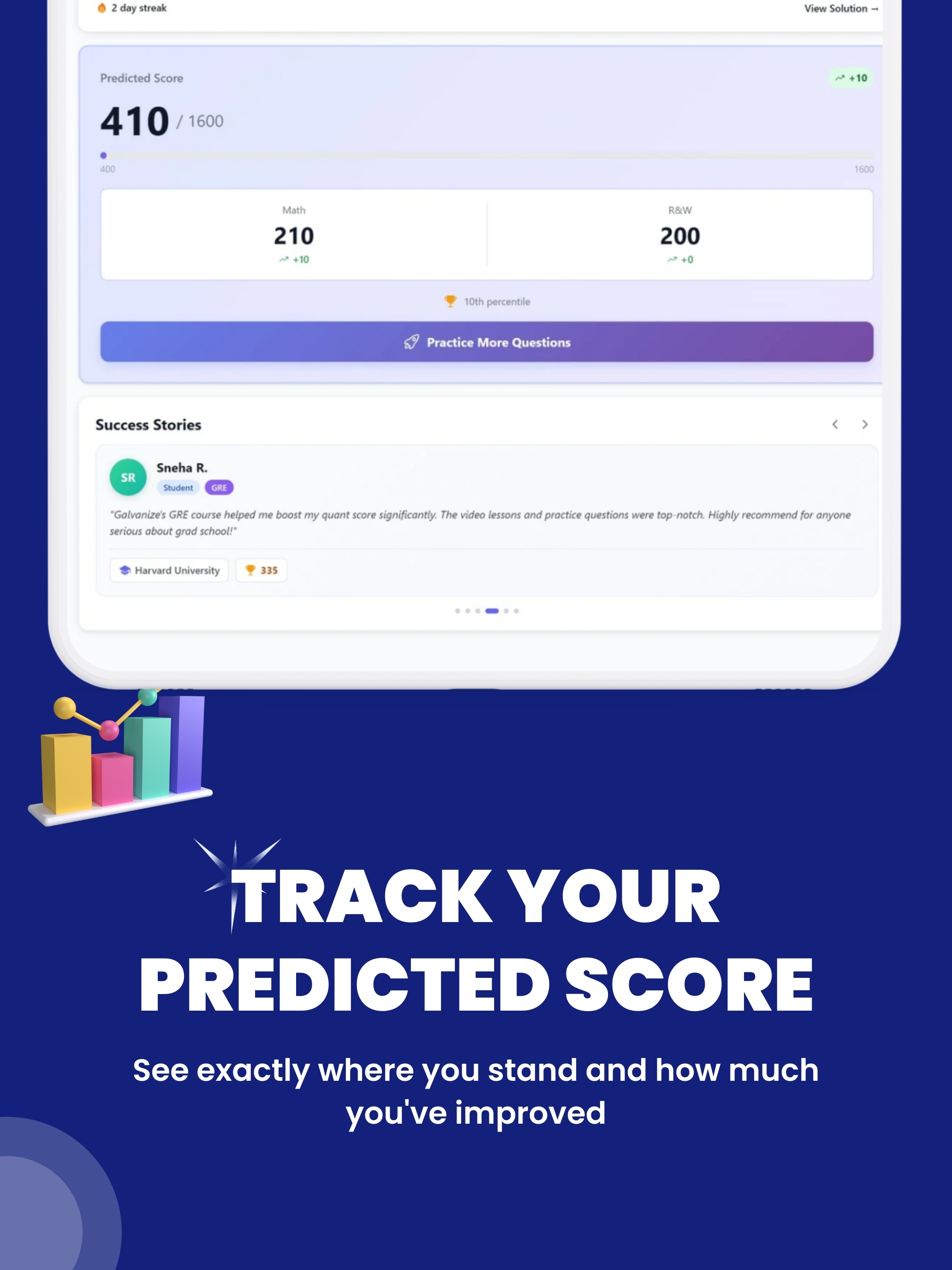 • Real-time SAT Score PredictorThroughout your preparation, you will be provided with stats on the dashboard about your performance. With these stats, you will be able to predict your SAT score and prepare accordingly.