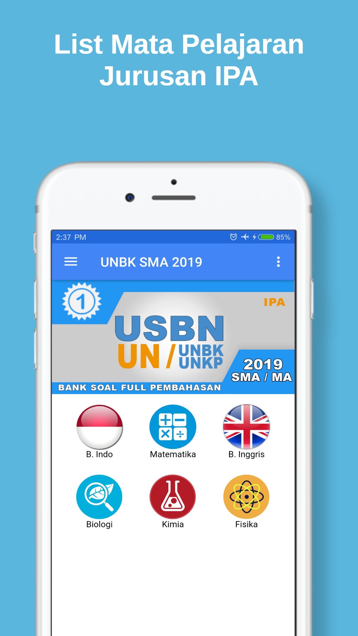 UN SMA 2019 (Package Name: com.oneapps.unbksmabaru) is developed by oneapps.edu and the latest version of UNBK SMA TERBARU 2019 4.0 was updated on February 24, 2019. UNBK SMA TERBARU 2019 is in the category of Education. You can check all apps from the developer of UNBK SMA TERBARU 2019. Currently this app is for free. This app can be downloaded on Android 4.0.3+ on APKFab or Google Play. All APK/XAPK files on APKFab.com are original and 100% safe with fast download.