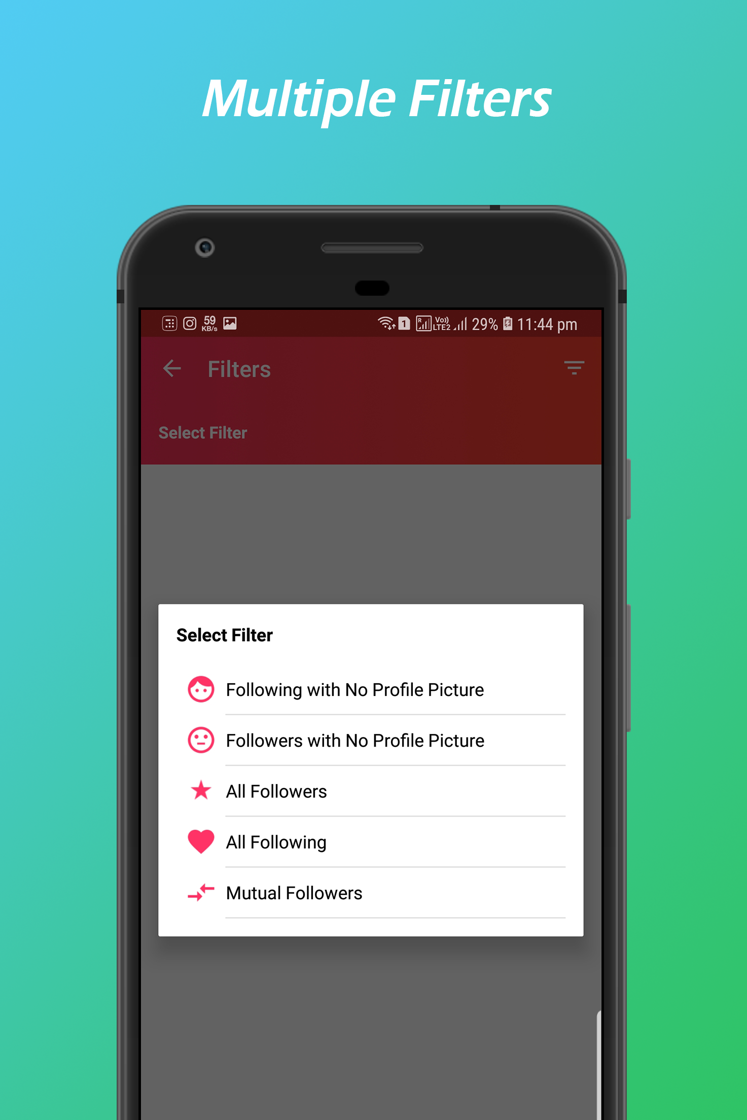 Filters - Find your fake followers, fake following, mutual followers, etc.