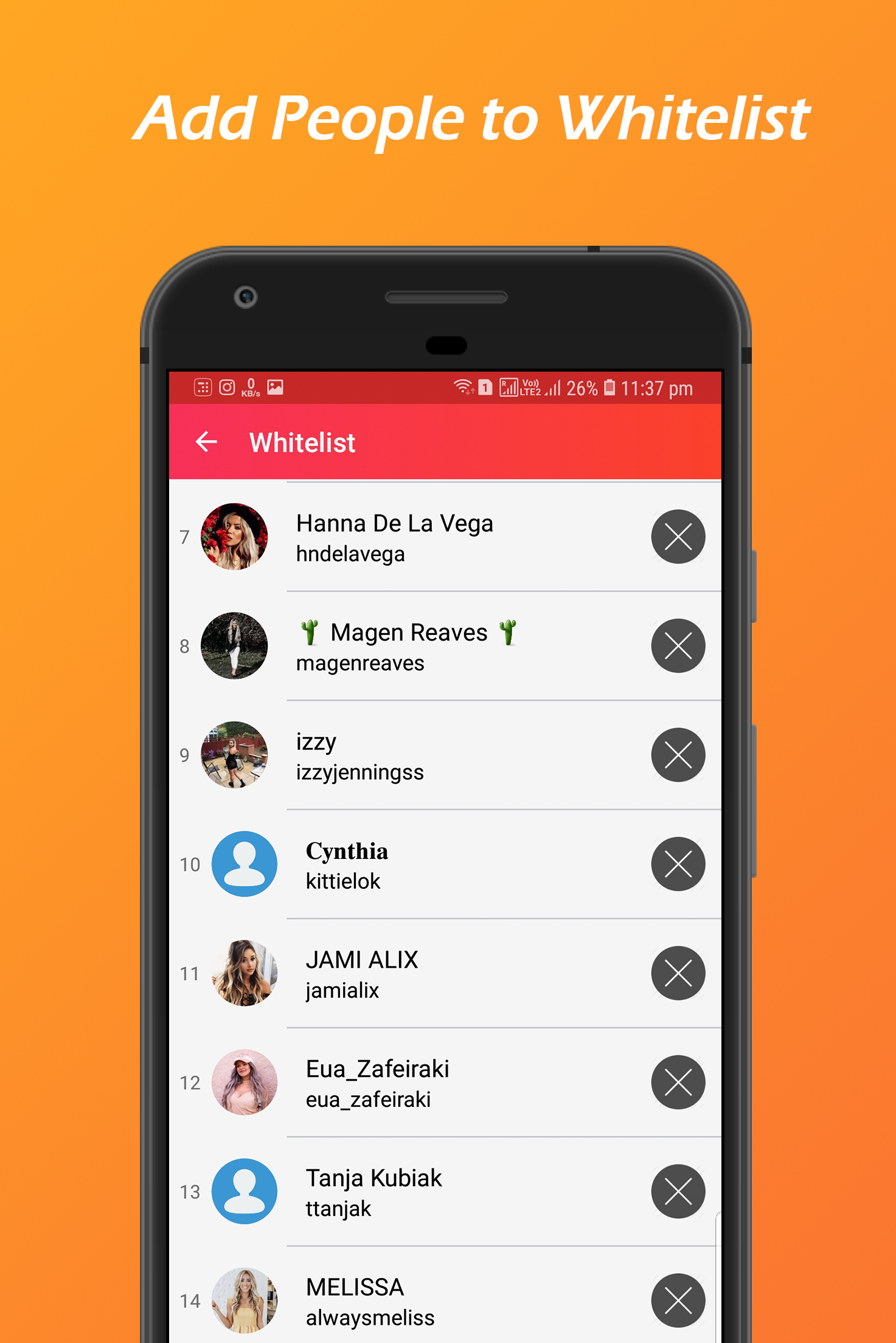 Whitelist - Add your favourite users to whitelist by swiping them to left and they won't be shown in your Non Followers & Ghost Followers list.